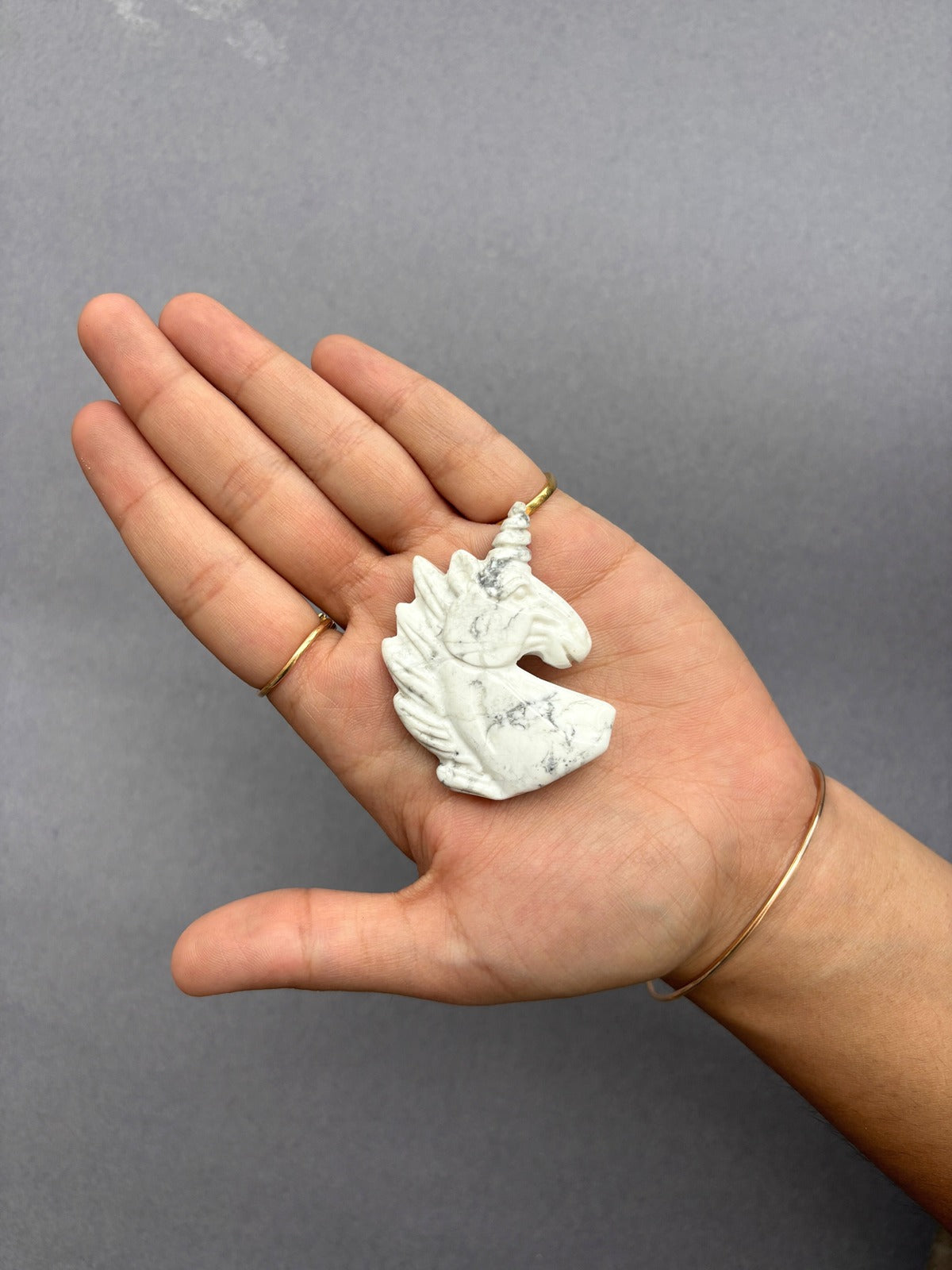 With its soft white tones, this Howlite Unicorn blends fantasy with calmness and clarity. A magical talisman for peace and imagination.