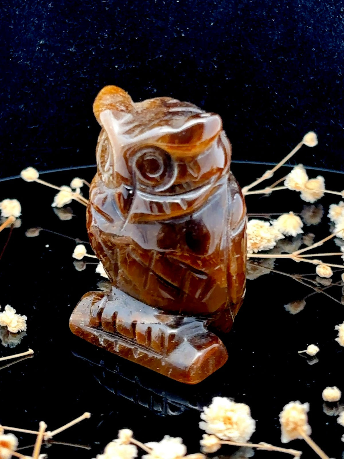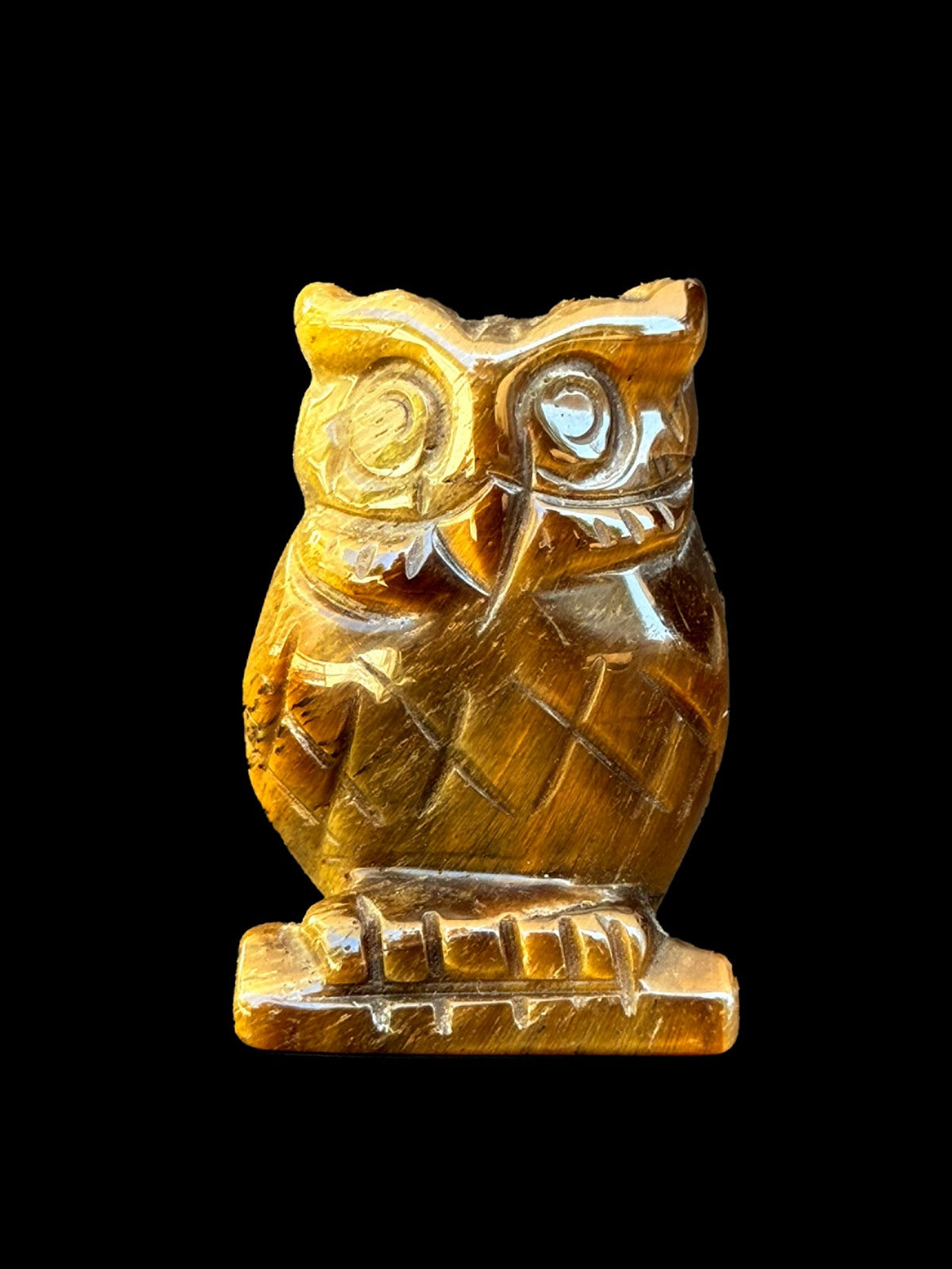 Carved from radiant Tiger Eye, this owl channels confidence, protection, and focus. A sharp-eyed guardian for your workspace or altar.