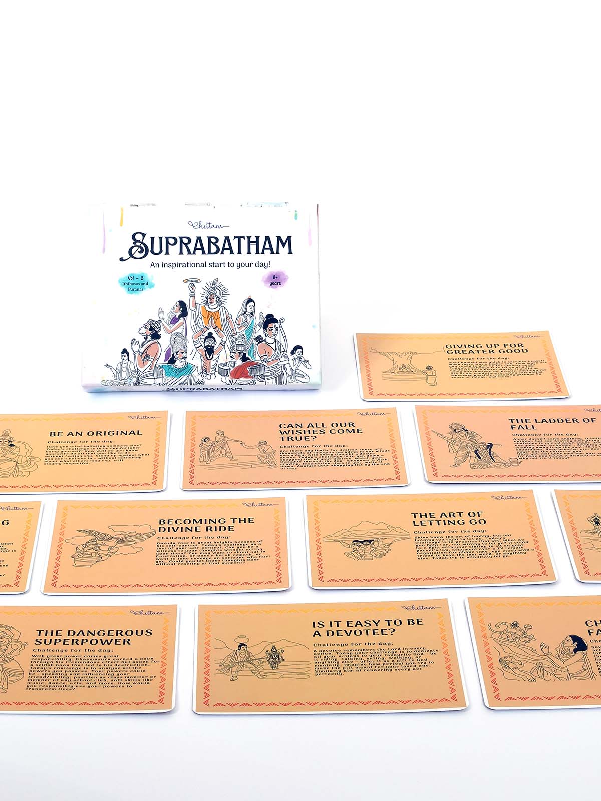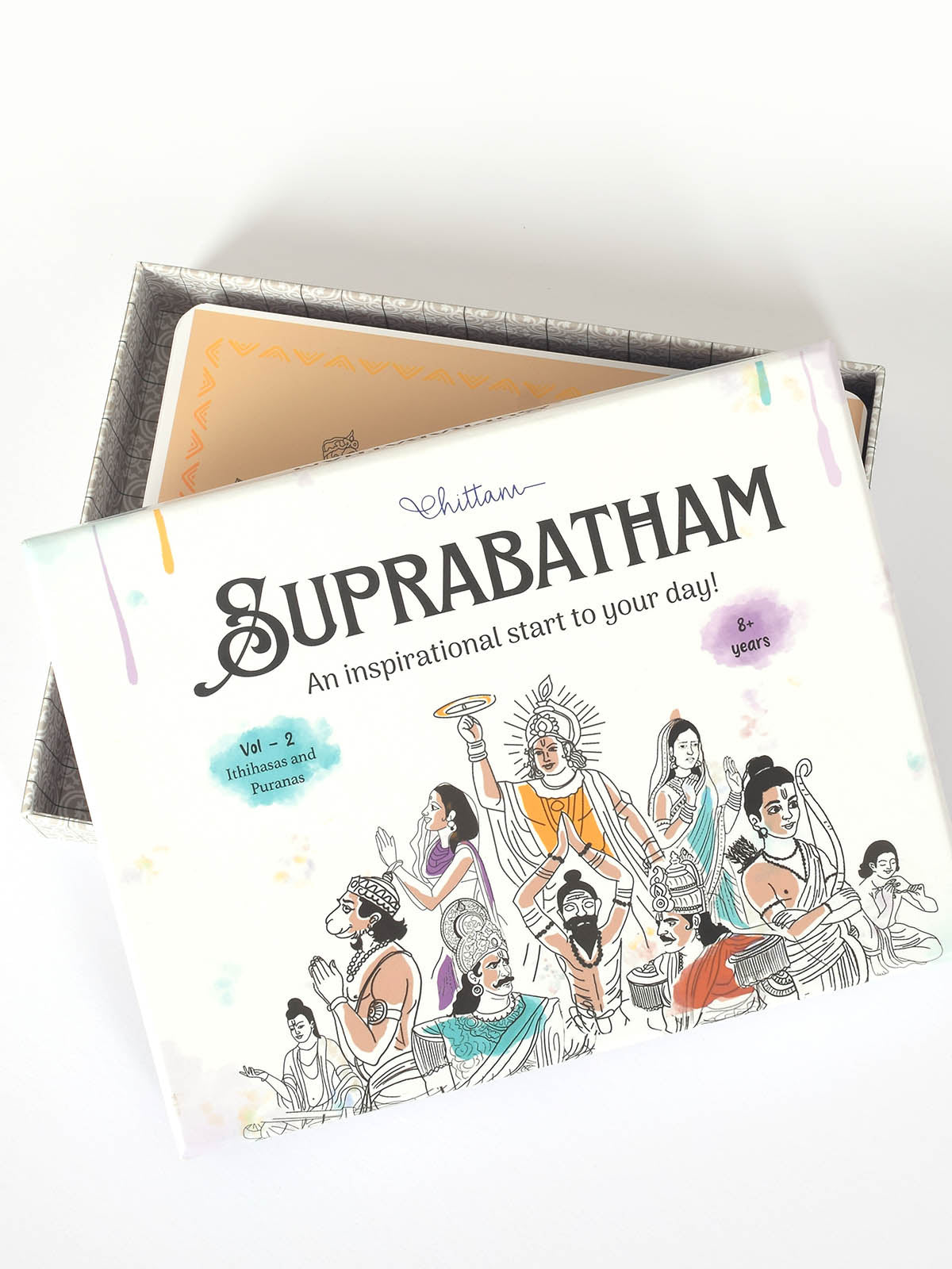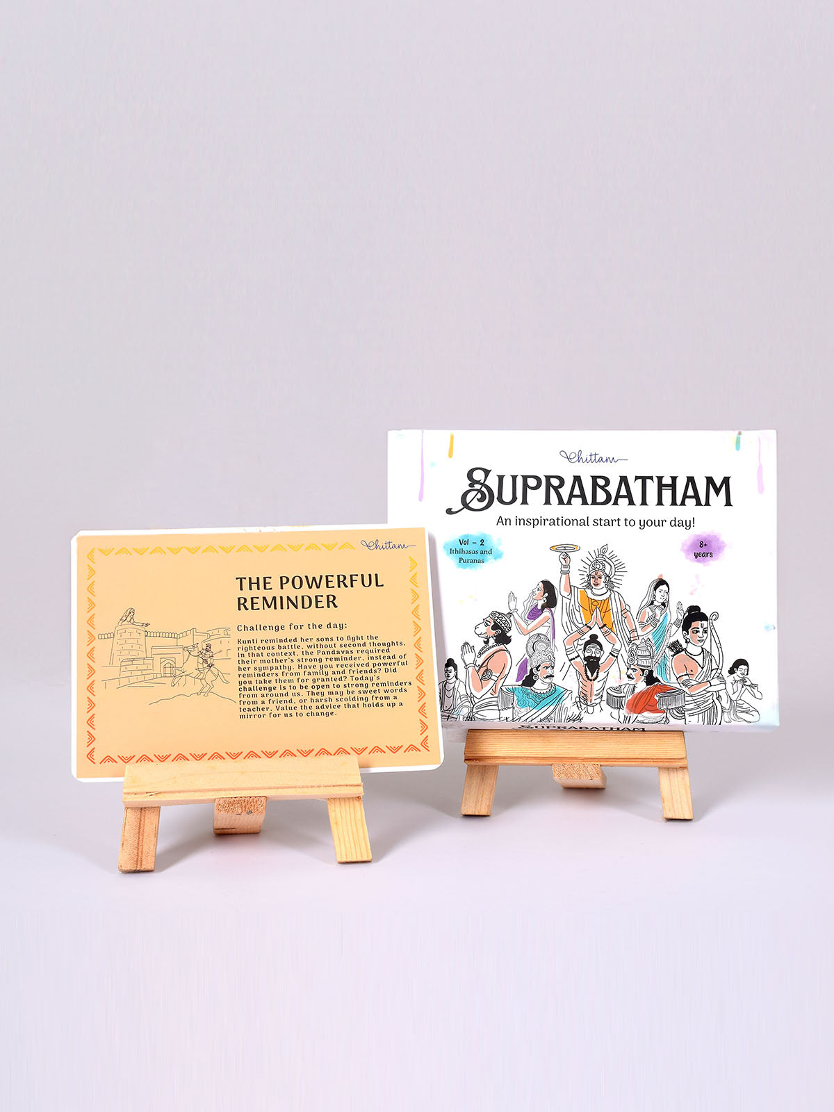 What's unique about this Combo? Introspection: Nudges children to reflect on their thoughts and actions everyday, and find ways to imbibe values in small and large ways.Inspiration: Cultural stories of success achieved against the odds, and heights scaled while being strongly rooted in our culture. Discipline: Enables a sense of meaningful routing each morning, with 10 minutes set aside to read and reflect on a Suprabatham card