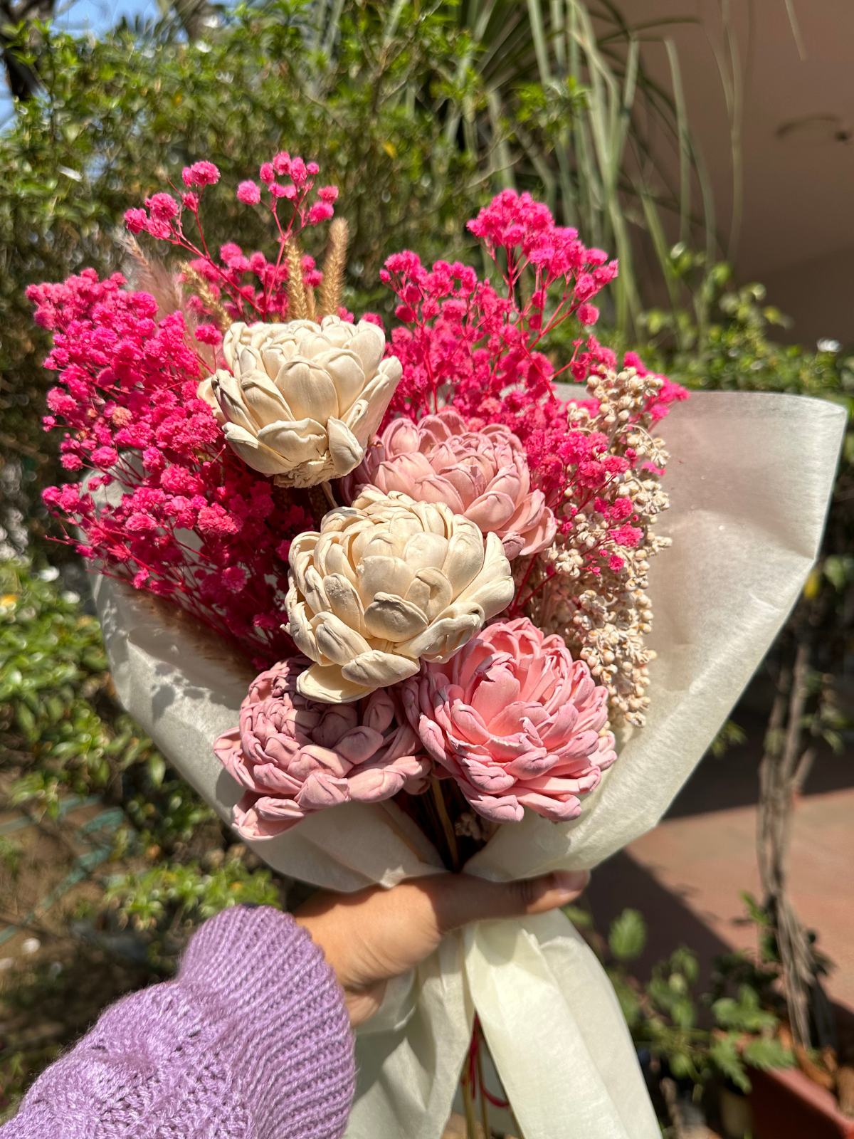 Delicate and thoughtfully curated, this dried flower bouquet blends soft pink baby’s breath, shola flowers, and graceful grasses for lasting beauty. A perfect gift for birthdays, anniversaries, or housewarmings—and a charming accent for your study, dining, or coffee table.