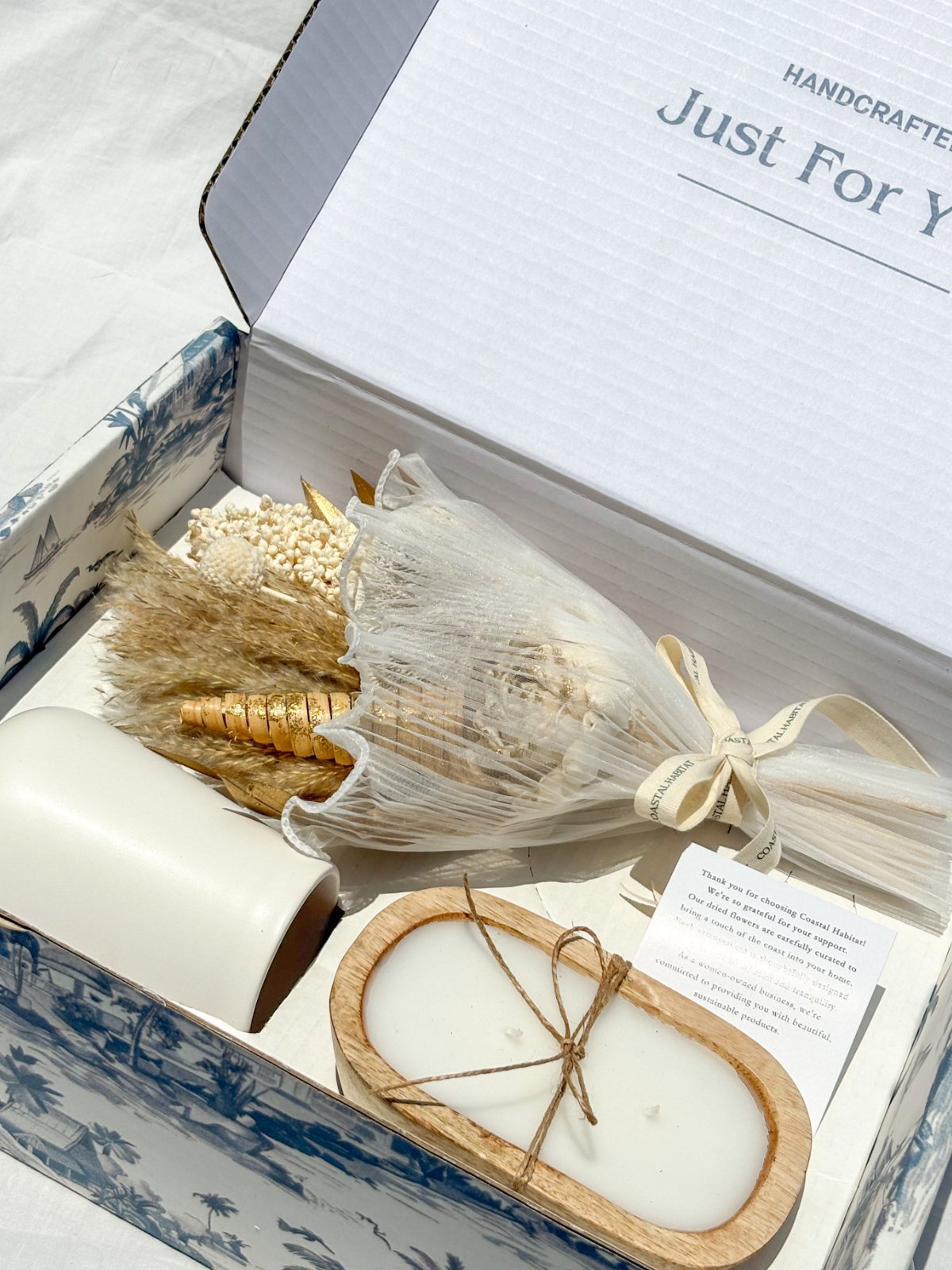 An elegant gift for those who appreciate calming spaces and timeless design. This curated box features a handcrafted gold and neutral dried bouquet, a pearly white vase, and a sea breeze-scented wooden candle—perfect for birthdays, housewarmings, or simply expressing love through thoughtful décor.