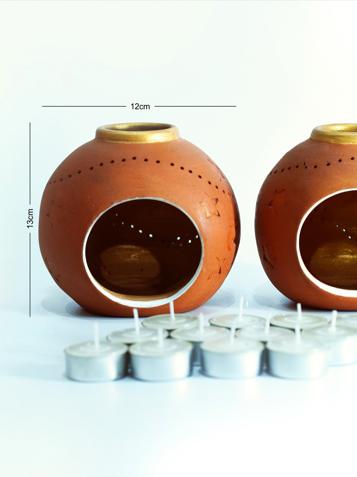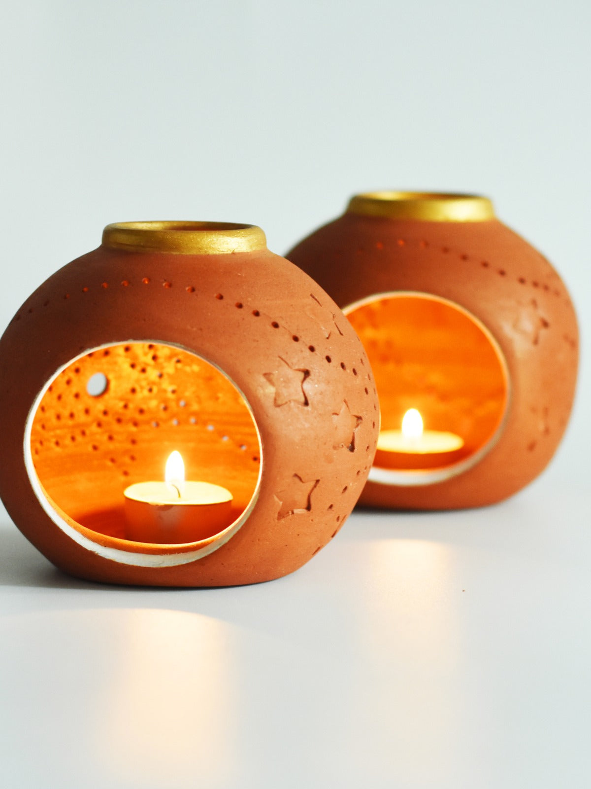 Rounded terracotta holders with top and front openings to showcase a gentle flame. Set of two with complimentary candles. Slight size variations celebrate handmade character. Crafted in West Bengal, they bring soft radiance and inviting, sculptural warmth to any setting.