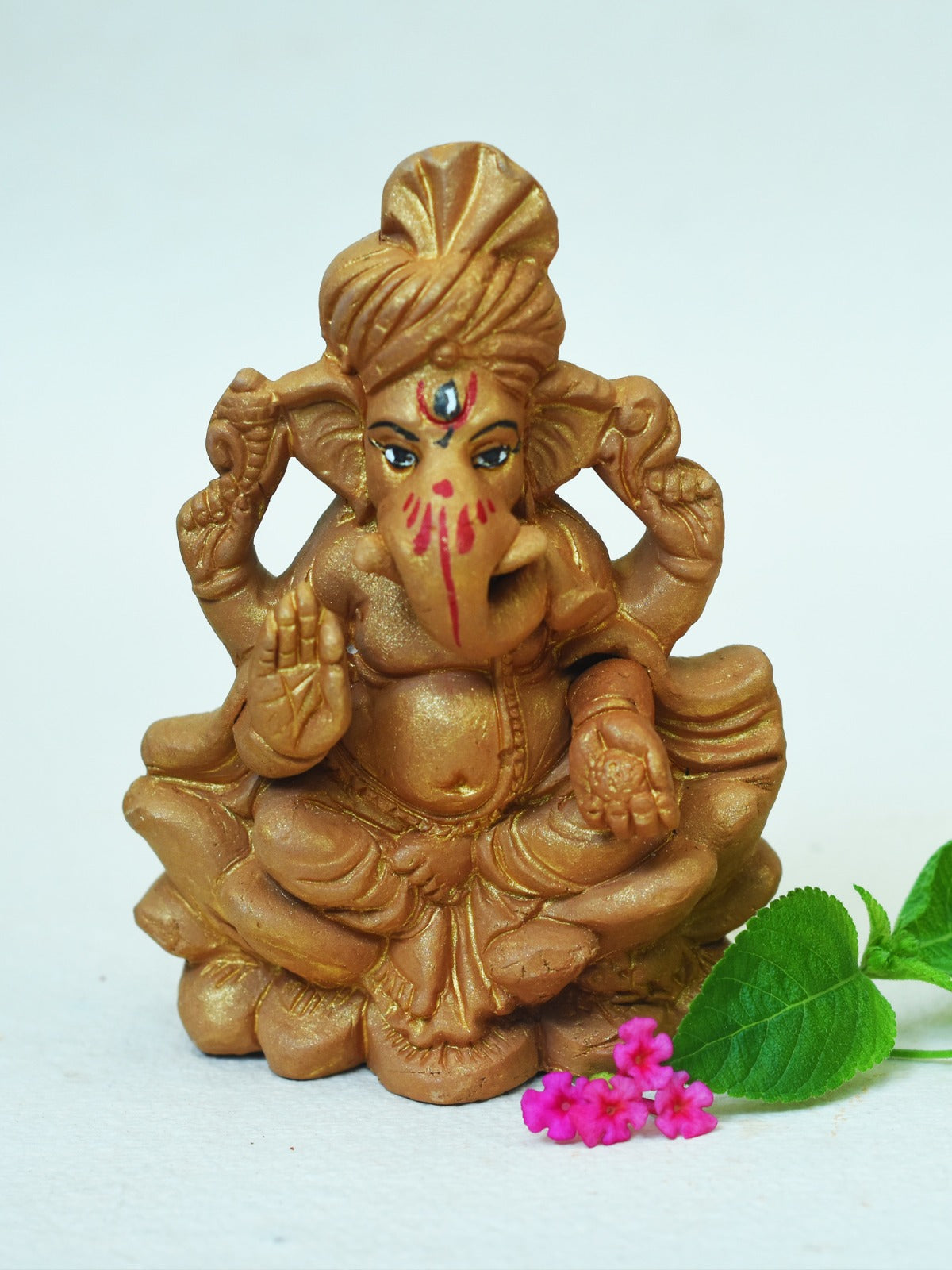 This handcrafted Ganpati puja set includes a clay idol, dhuna sticks, terracotta candles, and an incense holder. Presented in eco-friendly packaging, it combines traditional artistry with sustainability, making it an ideal gift for the festive season.