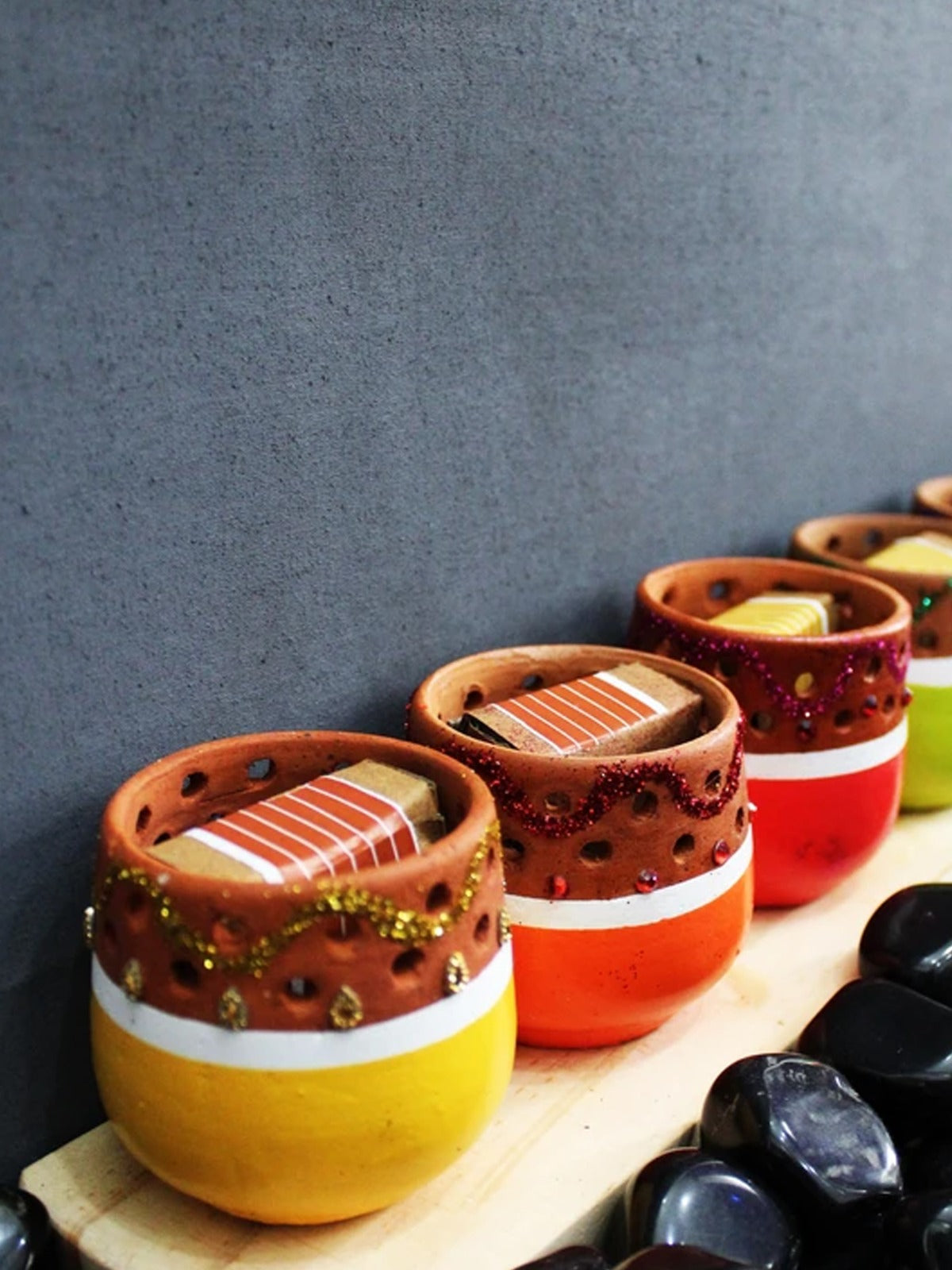 A vibrant set of six multicolored terracotta tealight holders with glittering accents and complimentary candles. Designed to scatter joyful light, they’re perfect for festive tables, intimate gatherings, and gifting—small pieces with big ambience.