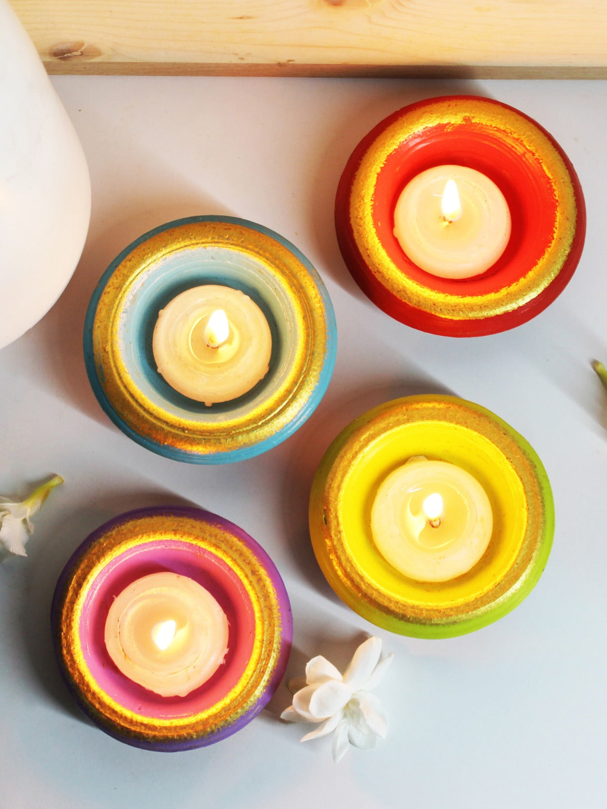 Plato‑style terracotta holders with wide, plate‑like mouths for a bold, festive presence. Set of four with complimentary candles. Vibrant tones and golden trims add sparkle, while the handcrafted finish brings authentic character to your celebrations.