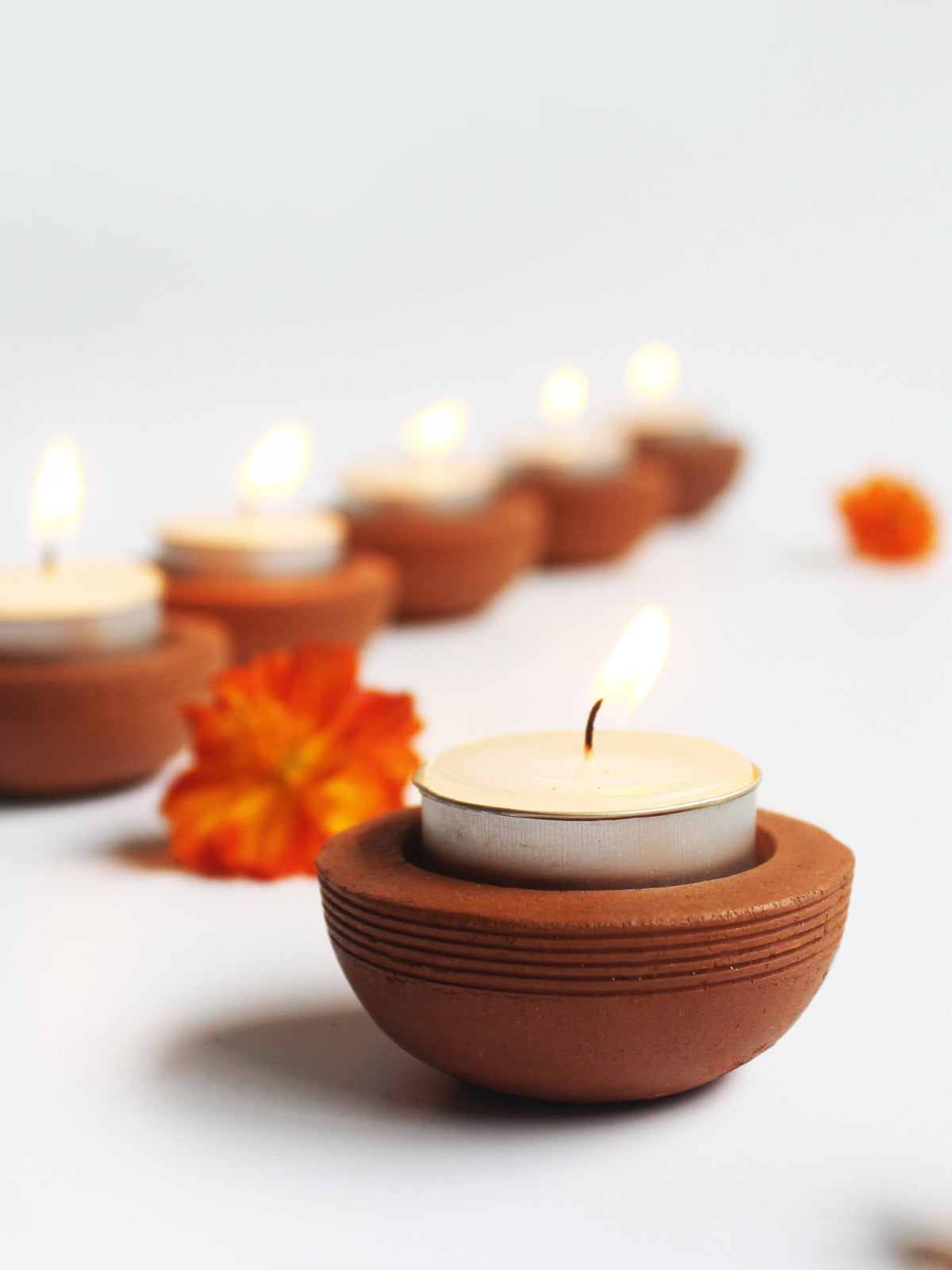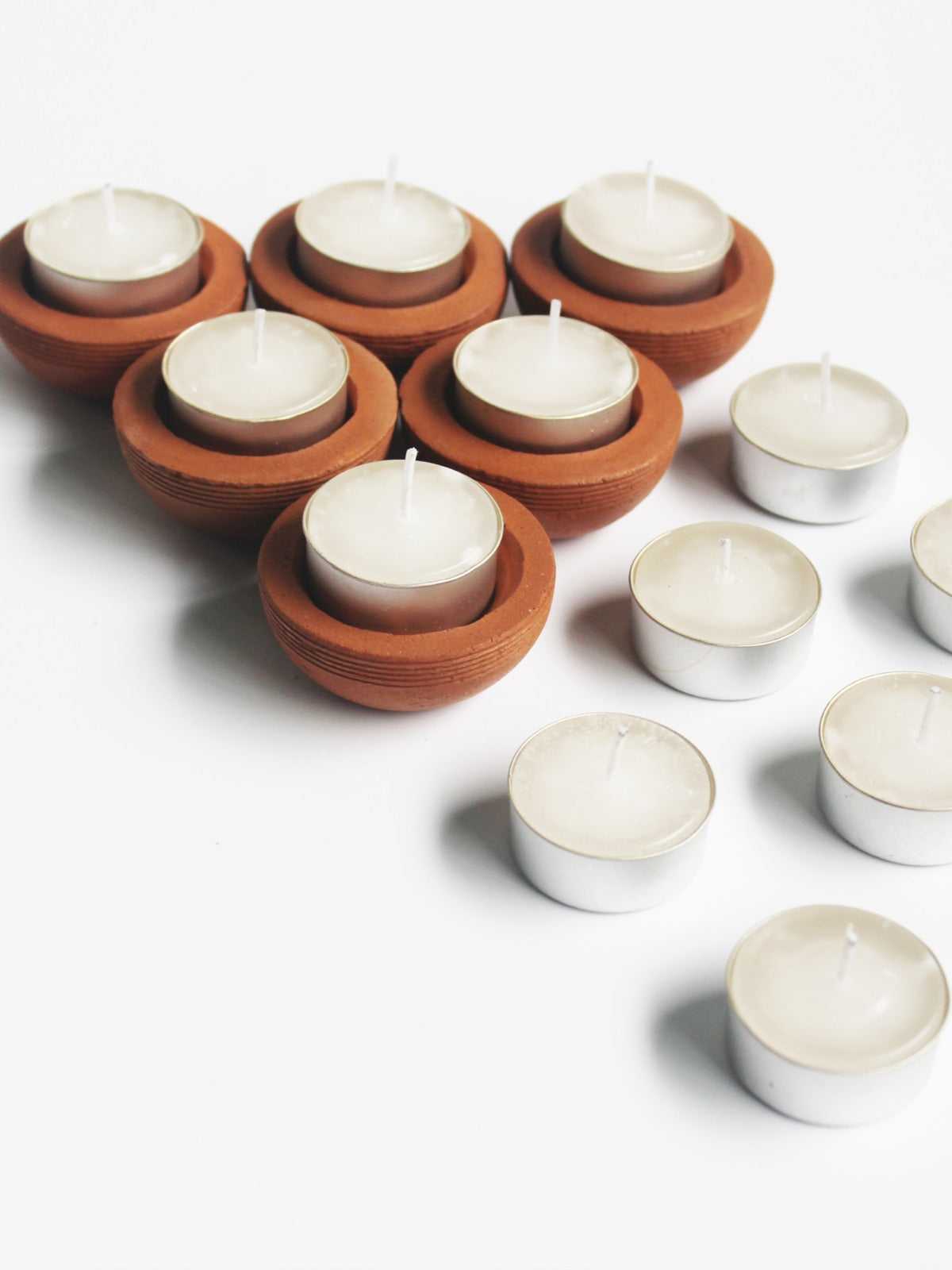 A set of six Tab series holders in natural terracotta with refined edging. Complimentary candles included. Their compact form and artisan finish make them perfect for gifting, festive accents, or everyday mood lighting.