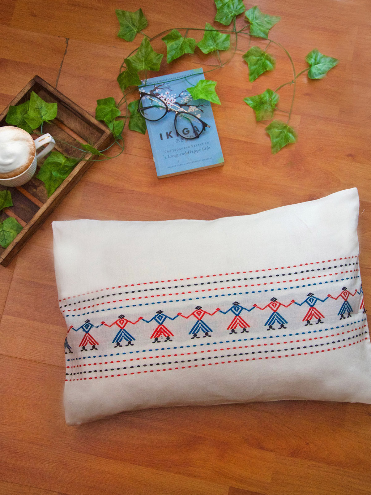 Experience the uniqueness of this exceptional cushion cover! It showcases an array of Assamese motifs such as phool (flowers), lakheer (waves), bunch of flowers, and trees, adorned in vibrant colors like orange, teal, red, and black against a white warp. The intricate design requires 1.5 Working Days of dedicated weaving, ensuring its undeniable beauty. Easily swap this cushion cover from your living room sofa to your bedroom or any cozy space by the window, effortlessly enhancing the ambiance. For a complete look, pair it with a Asomiya cushion cover. Immerse yourself in the enchantment of craftsmanship, where the sound of wooden looms, tapping feet, and flying shuttles brings pure magic to every piece. Don't miss out, click now to order!