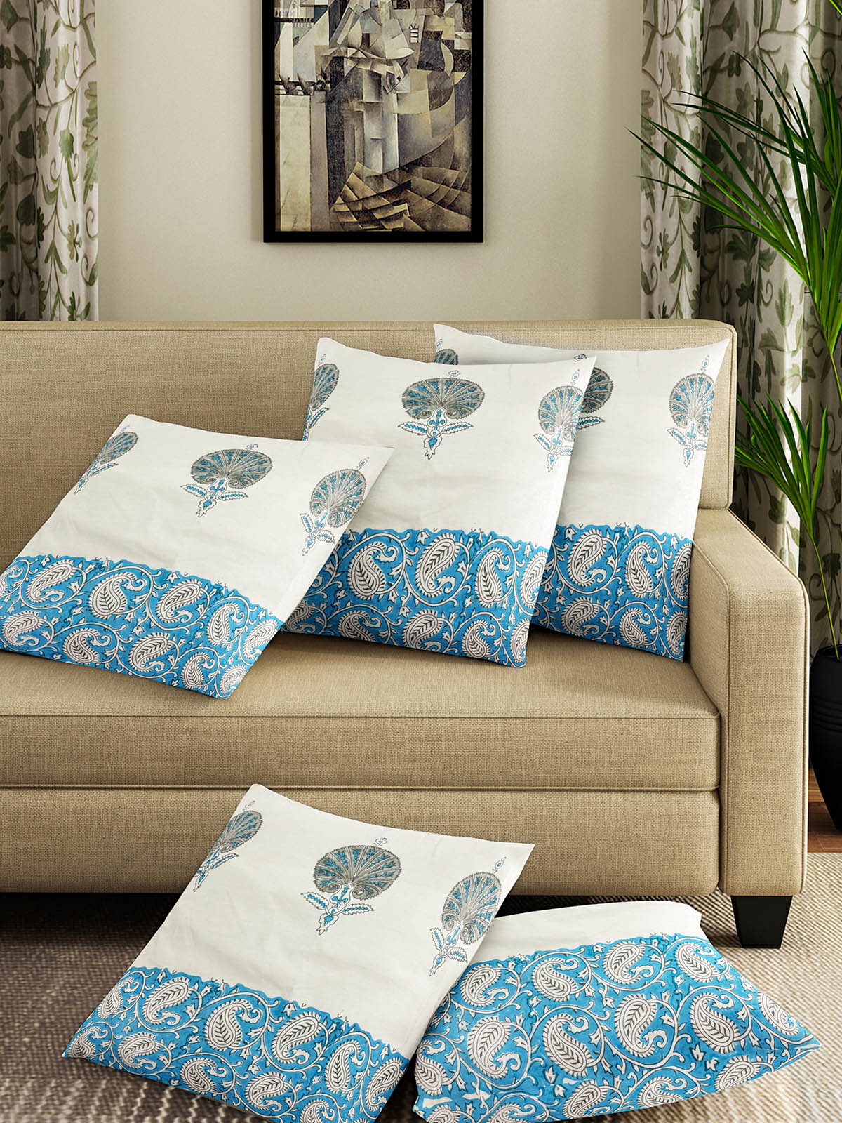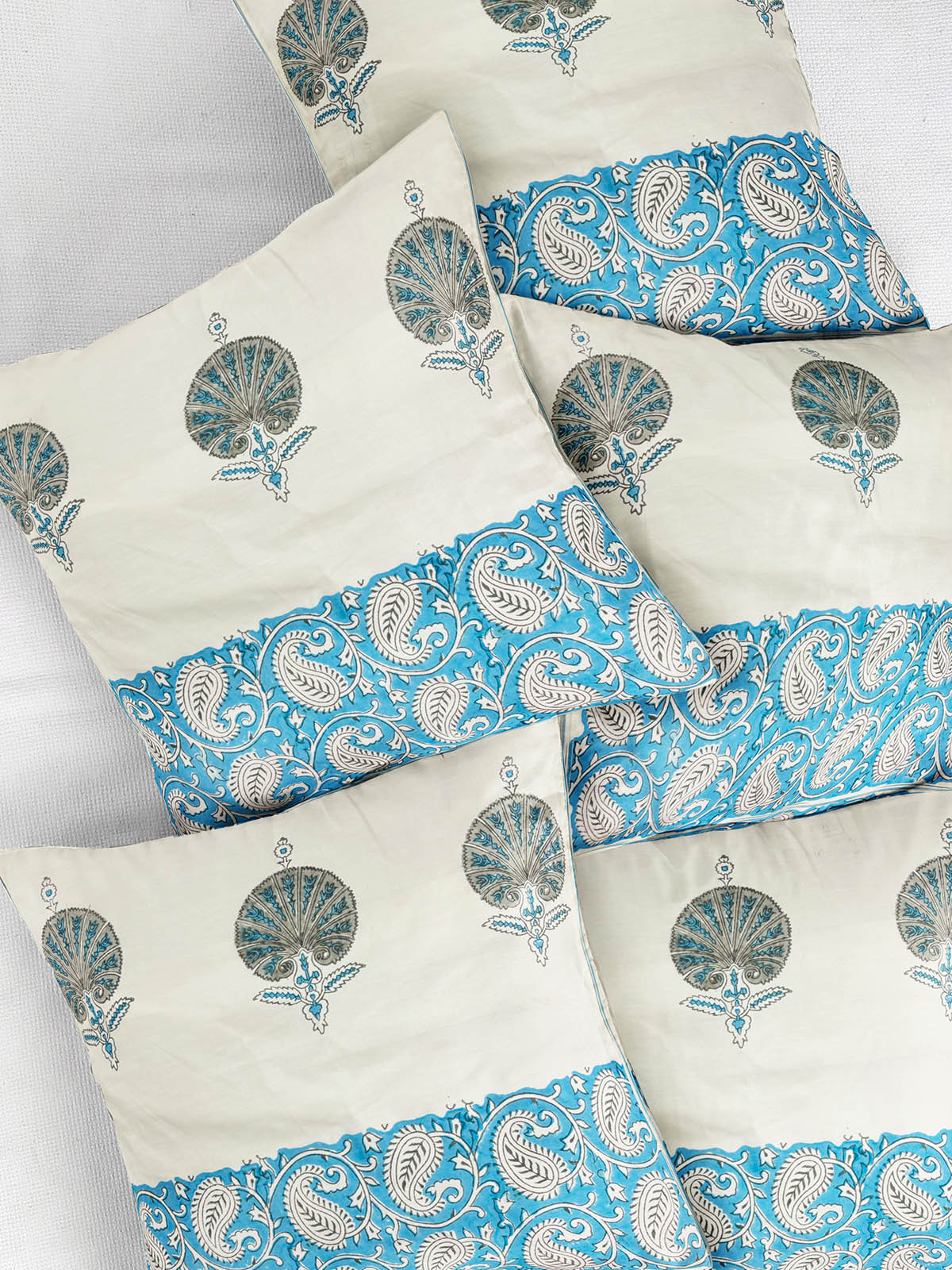 Blue Peacock Handblock Printed Cushion Covers (Set of 5)