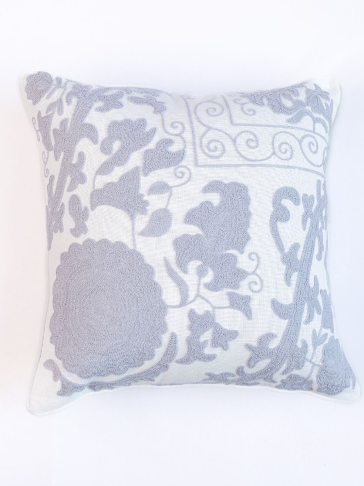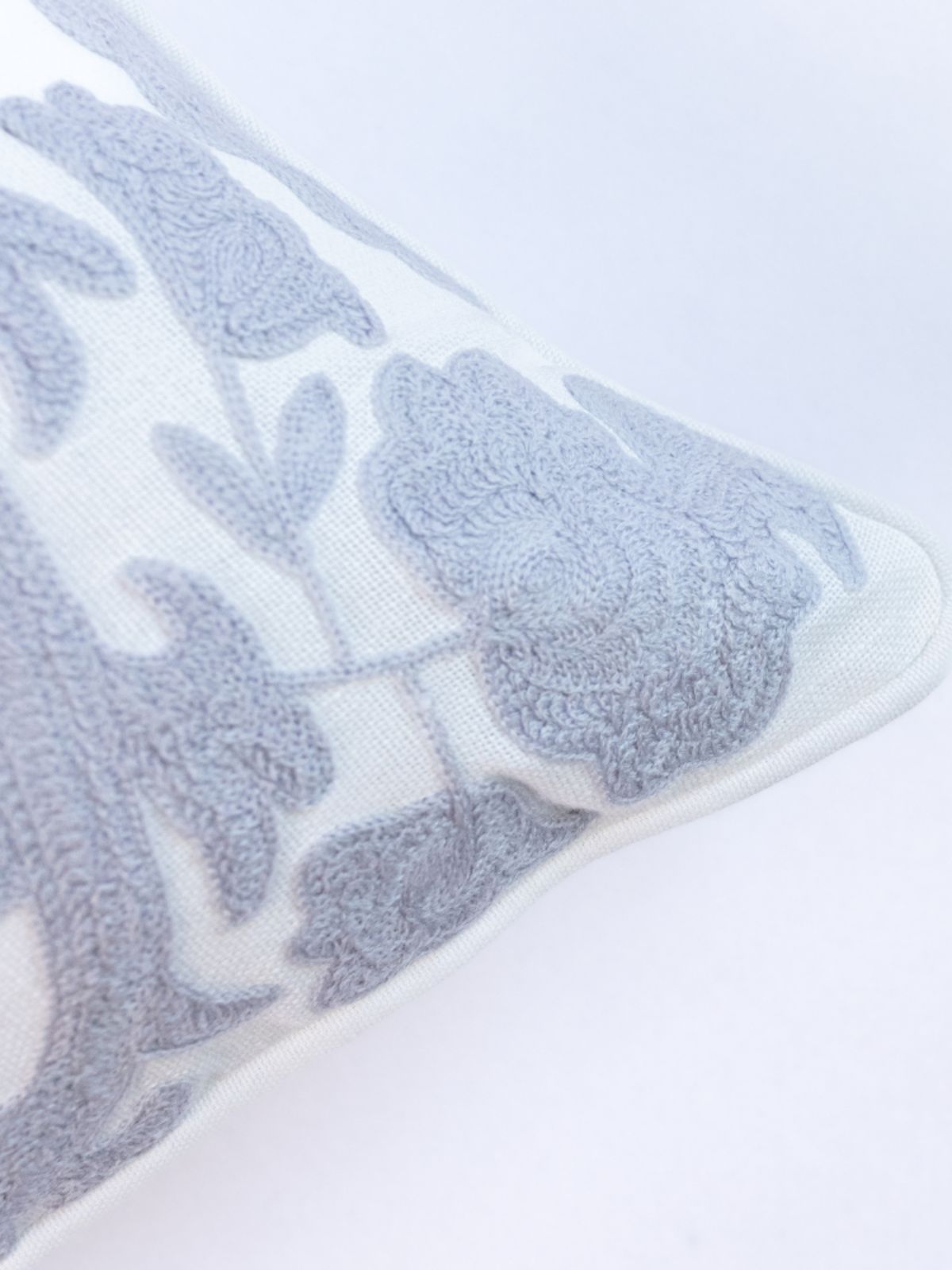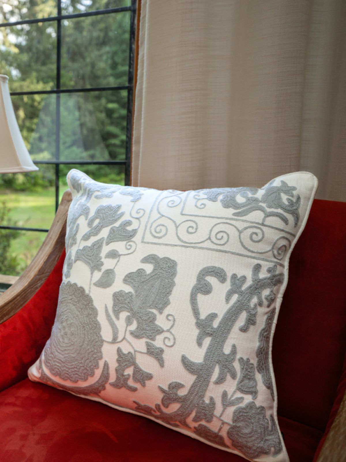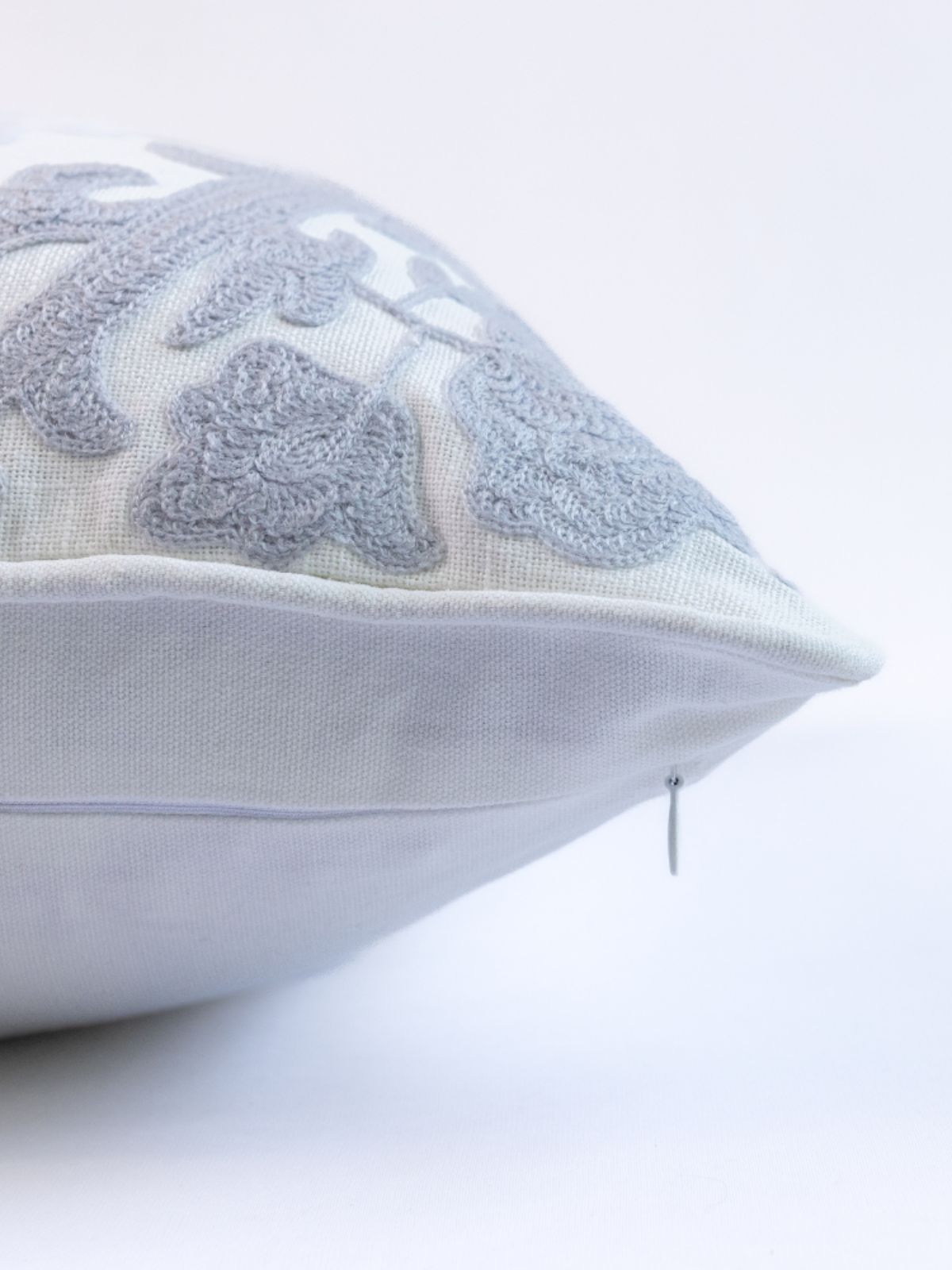 The Soft Saga cushion cover draws inspiration from classic Jacobean motifs, reimagined in a soothing palette of grey and white. Hand-embroidered in fine Kashmiri crewel, it evokes serenity through texture and tone. The subtle sheen of silver-grey threads adds dimension, while the cotton lining and concealed zipper give it structure and polish. Perfect for contemporary interiors, this piece brings a sense of calm and sophistication — a soft statement in understated luxury.
