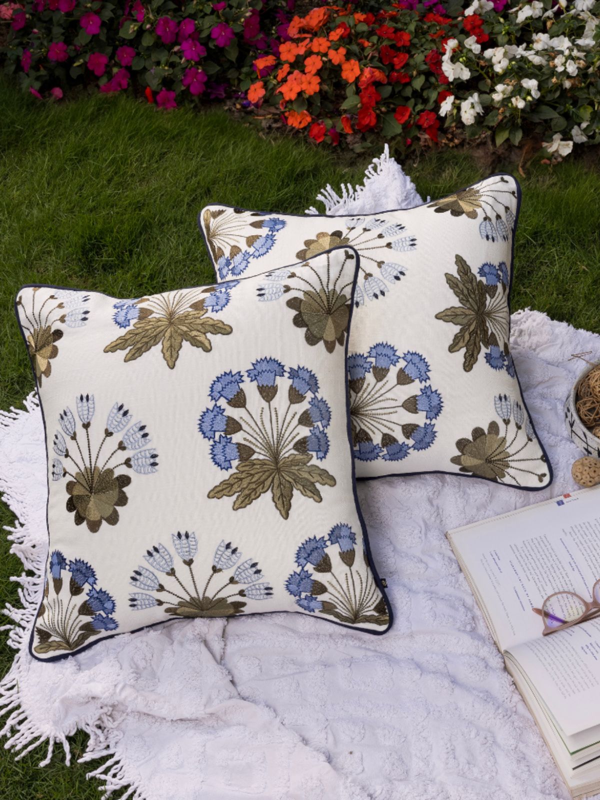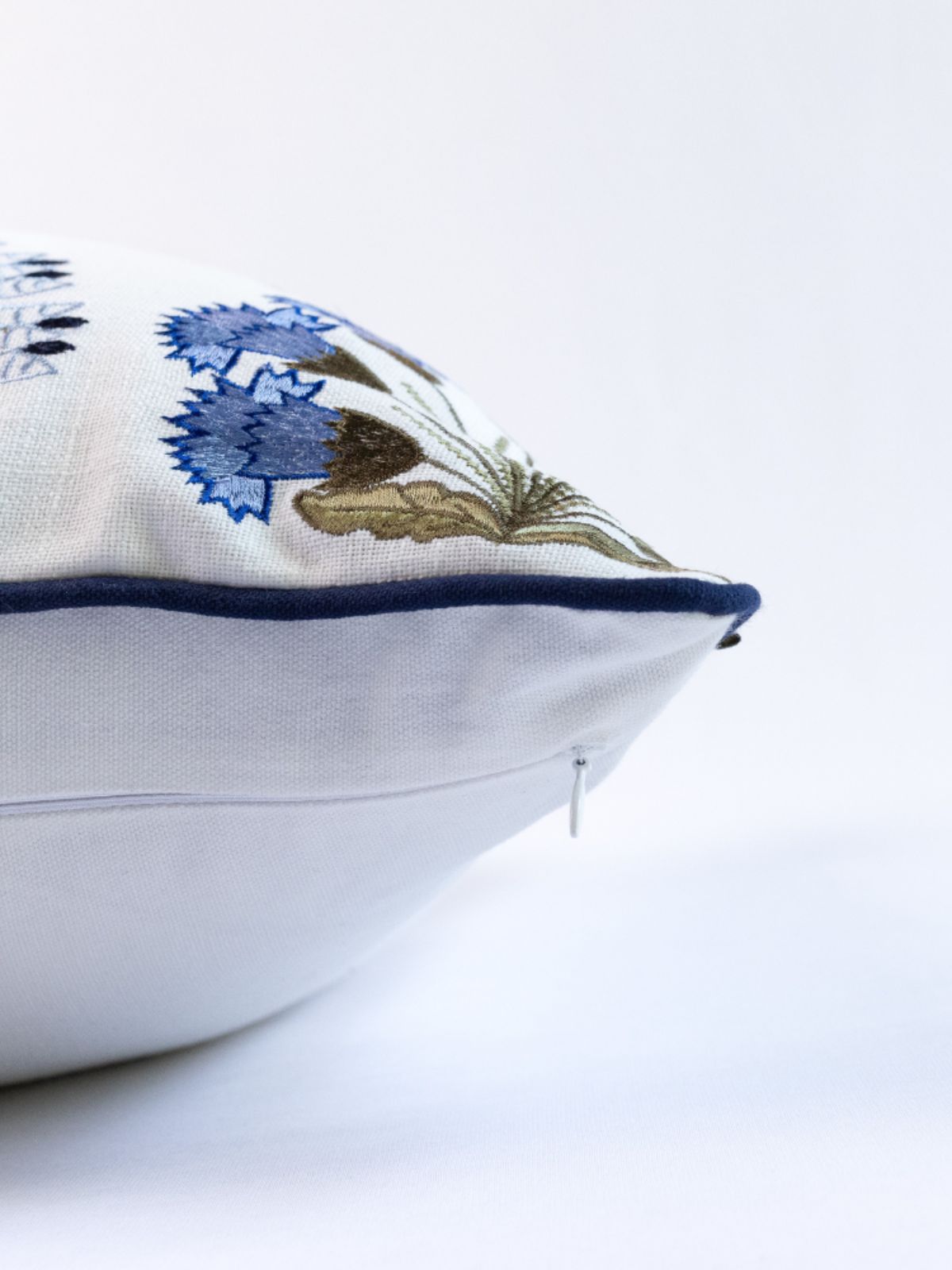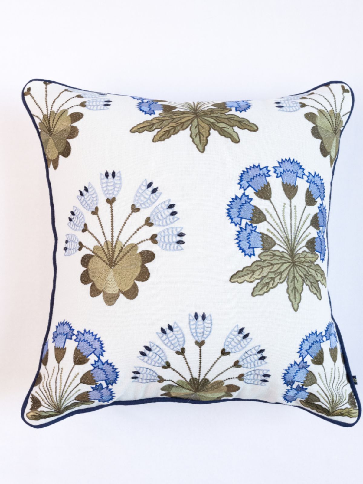 Drawing from the lush beauty of Himalayan forests, the Forest Bush cushion cover captures nature’s rhythm through vibrant green and blue embroidery. Crafted on soft white cotton with deep-blue piping, it combines artisanal texture with a polished finish. Perfect for neutral or dark-toned couches, this piece brings organic vibrancy and refined coastal charm — a modern interpretation of natural elegance.