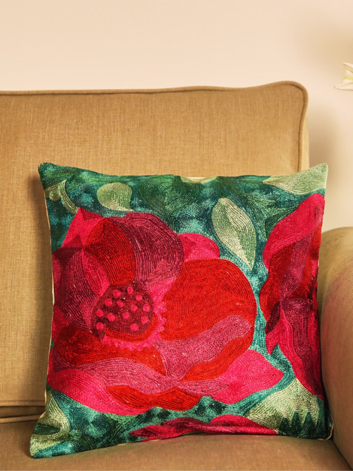 An elegant cushion cover with floral pattern hand-embroidered by our talented artisans. The base material is a mill dyed cotton fabric called Dusooti. Silk threads are used to make chainstitches that create floral motifs. Crafted with love and detail exclusively for your space to stand out from rest. All Chaar Chinar products are handcrafted with love. No two products will be exact replicas as variations are natural to the handcrafting process.