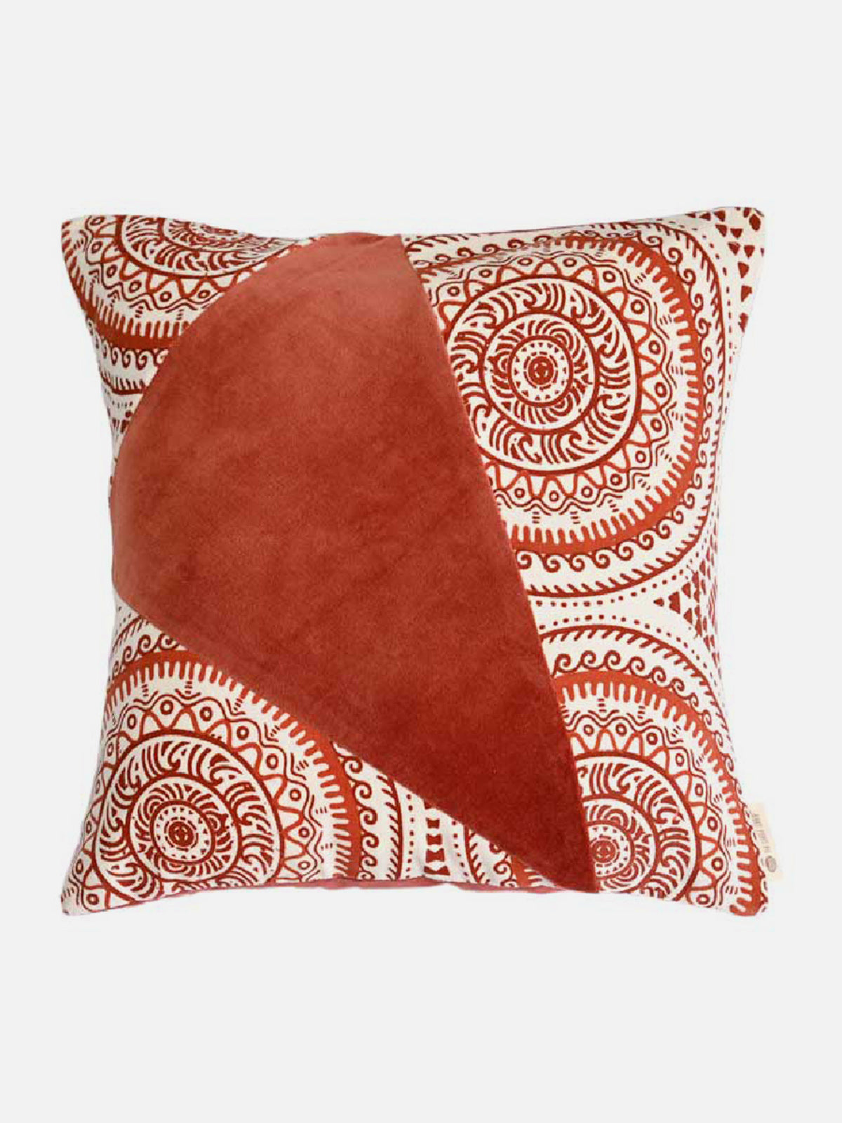 The Makhamalee collection, has contemporary designs to complement and enhance your space. The name Makhamalee is derived from the Hindi word which means gentle and soft but the collection is designed and styled by the surplus fabrics. This collection has been made from 30.800 kgs of surplus fabric to upcycle and bring a change to our living. These contemporary designed cushions dramatically defines social spaces. This beautifully patched cushion with rust velvet and mandala print is an exemplary glance of MAKHAMALEE collection.