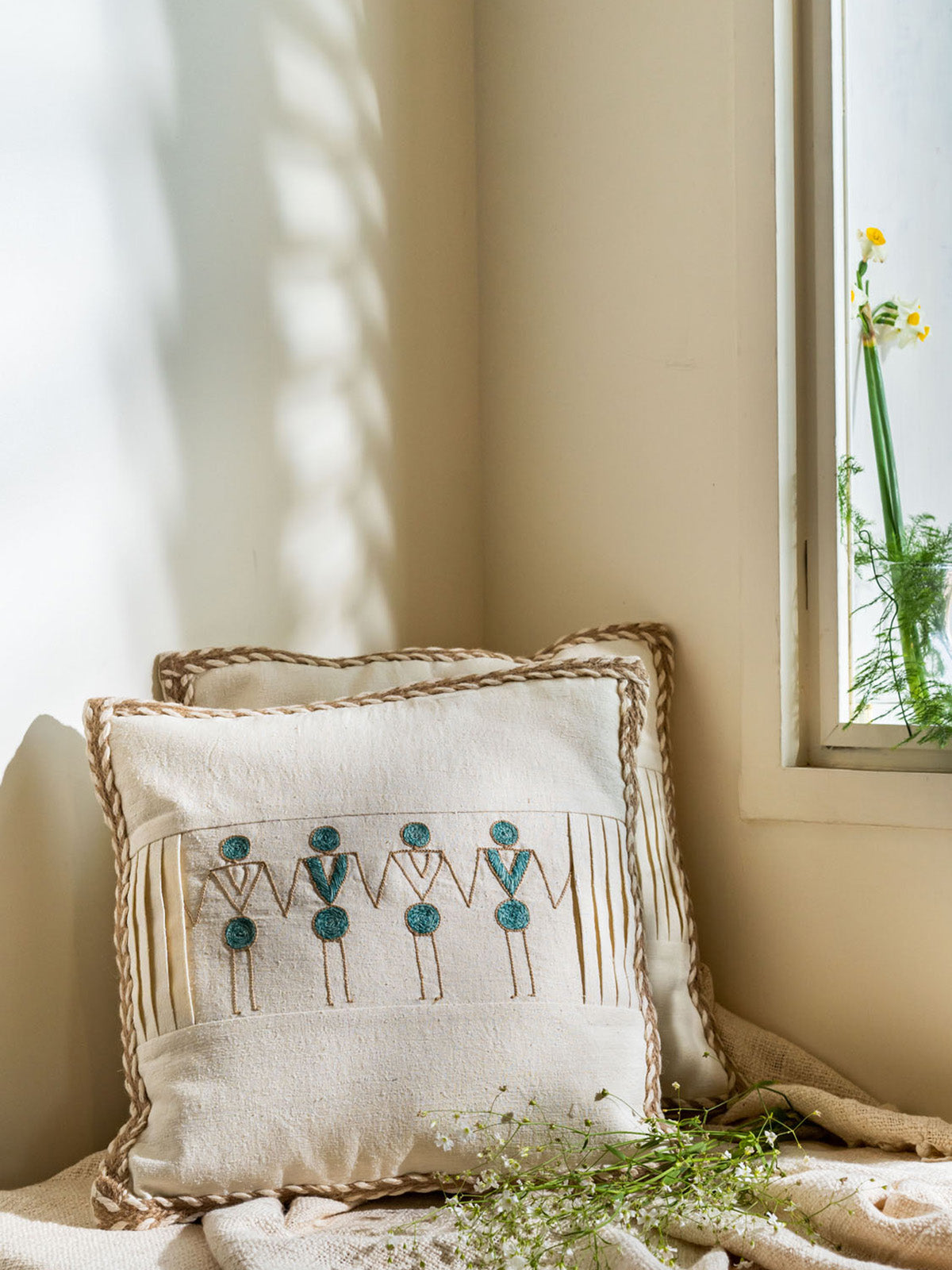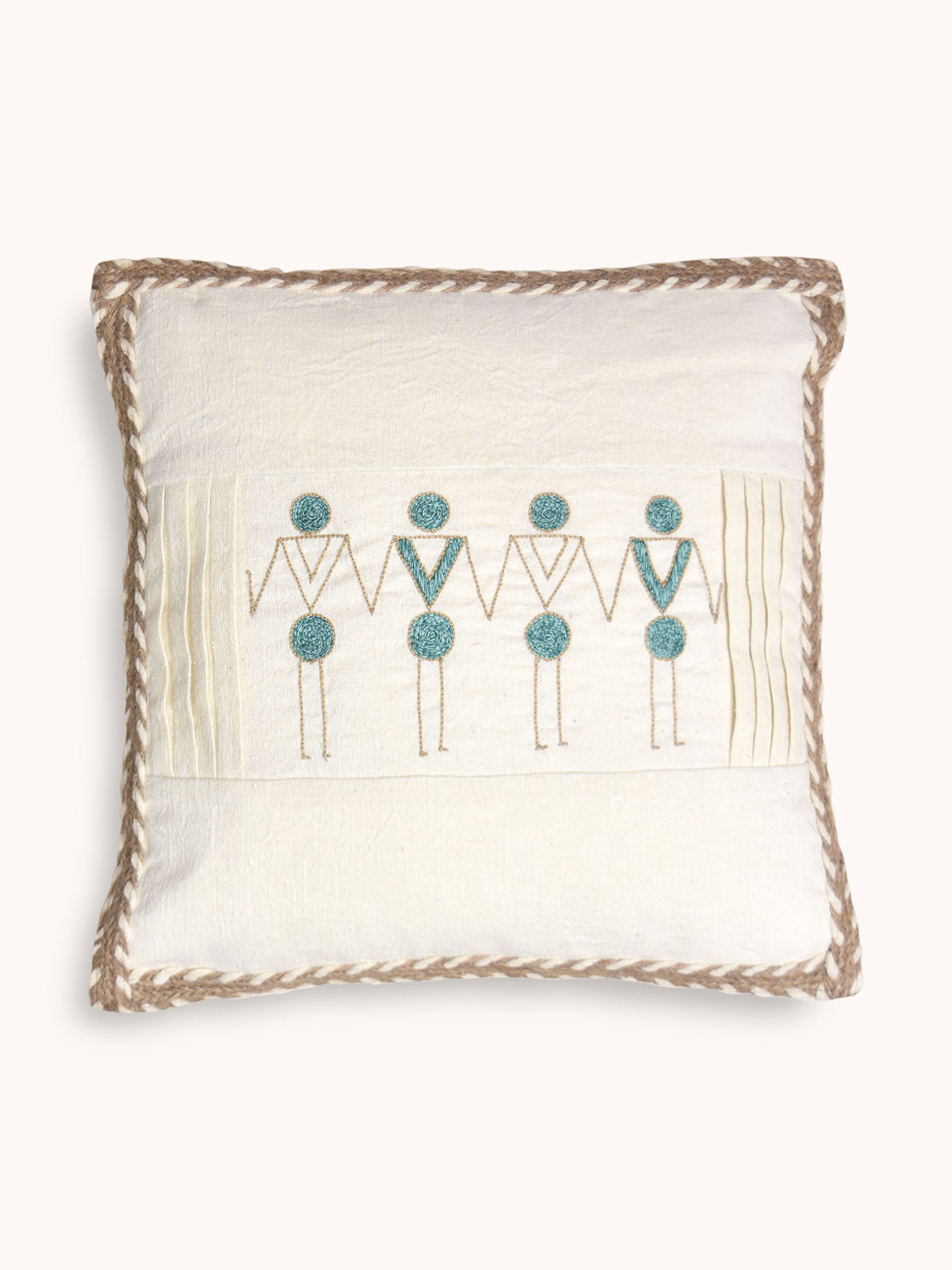 Paichnídia, derived from the Greek word for playfulness, aptly describes this Indian handwoven Eri silk cushion cover. Delicately adorned with jute fur borders and intricate hand embroidery showcasing the captivating Warli art, it exudes a tribal-themed celebration motif. This unique piece harmonizes beautifully with jute or wooden furniture, creating an ambiance that embraces nature's friendliness while adding a touch of cultural vibrancy to your space.
