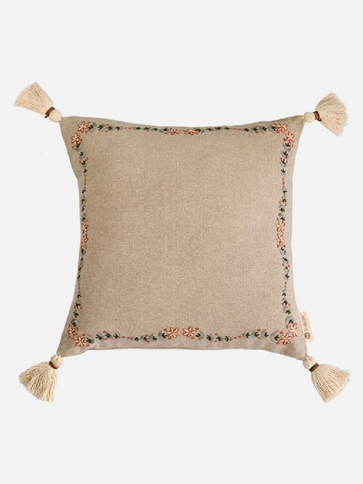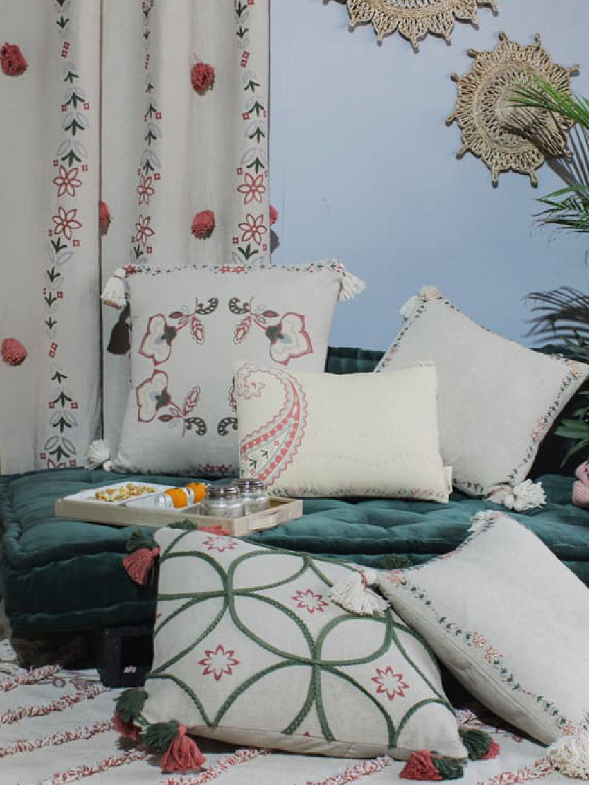 The festive collection, Fika which brings the global aesthetics to our homes. The name FIKA is derived from Swedish culture which is a concept, a state of mind and an attitude which means making time for family and friends to share sweets, but the designs in the collection are a fusion of Indian contemporary paisleys. The colours and the motifs are designed to intensify the looks of your homes and give a genial feeling. Fika will let you slow down and appreciate the good things in life. This FIKA cushion includes simplicity with its embroidery and design and gives a soothing effect with its tincture.