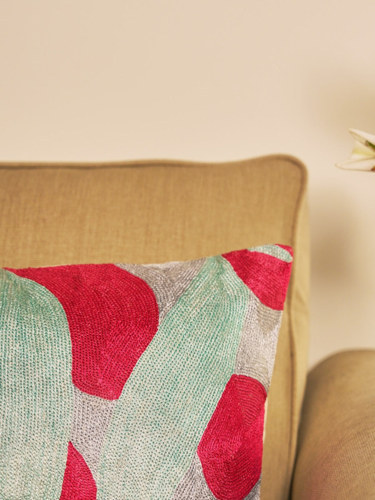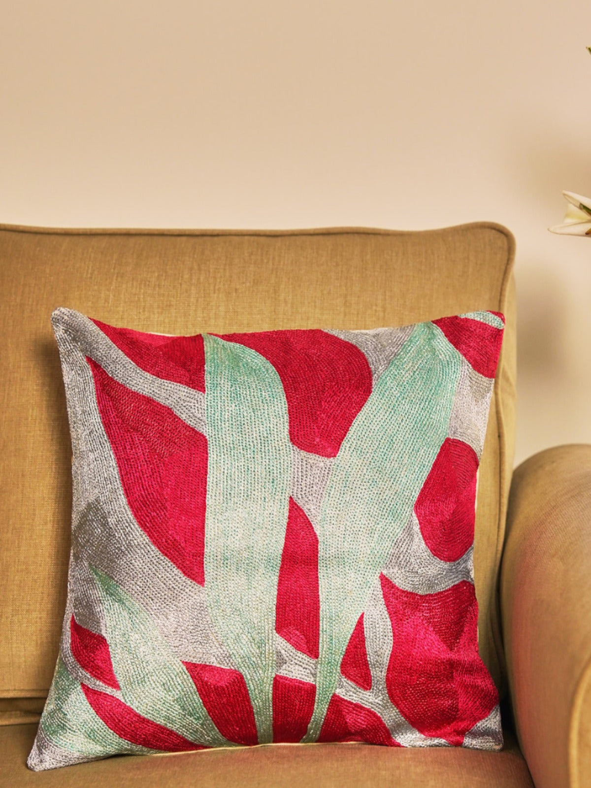 An elegant cushion cover with abstract leafy pattern hand-embroidered by our talented artisans. The base material is a mill dyed cotton fabric called Dusooti. Silk threads are used to make chainstitches that create floral motifs. Crafted with love and detail exclusively for your space to stand out from rest.All Chaar Chinar products are handcrafted with love. No two products will be exact replicas as variations are natural to the handcrafting process.
