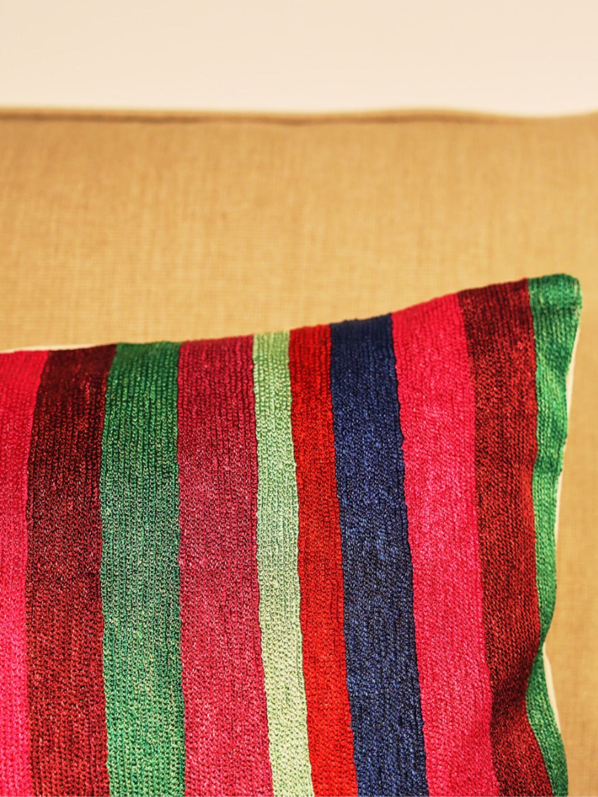 An elegant cushion cover with modern stripe pattern hand-embroidered by our talented artisans. The base material is a mill dyed cotton fabric called Dusooti. Silk threads are used to make chainstitches that create floral motifs. Crafted with love and detail exclusively for your space to stand out from rest. All Chaar Chinar products are handcrafted with love. No two products will be exact replicas as variations are natural to the handcrafting process.