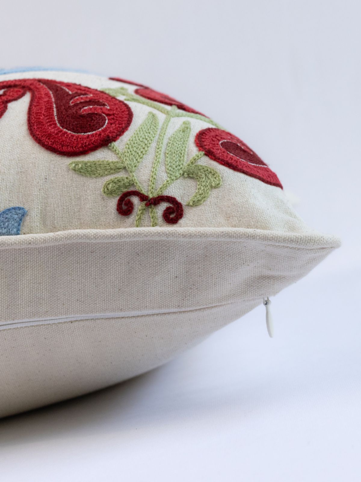 Inspired by the radiant pomegranate bloom — the Dainposh — this cushion cover is a tribute to vitality and beauty. Crafted in rich maroon and red tones with a contrasting blue border, it captures warmth and refinement. Hand-embroidered in traditional Kashmiri aari technique, each detail reflects timeless skill and patience. The internal cotton lining and seamless finish ensure elegance from every angle. Perfect for adding depth and vibrancy to any space, it celebrates heritage in a modern, sophisticated form.
