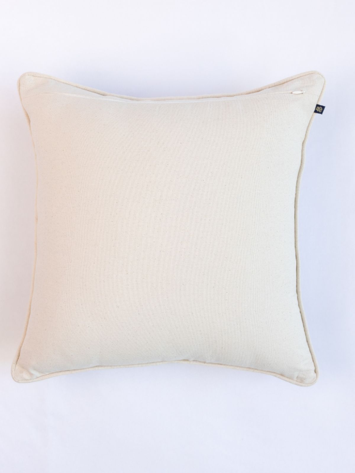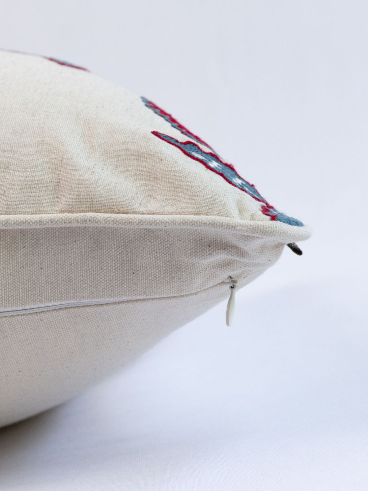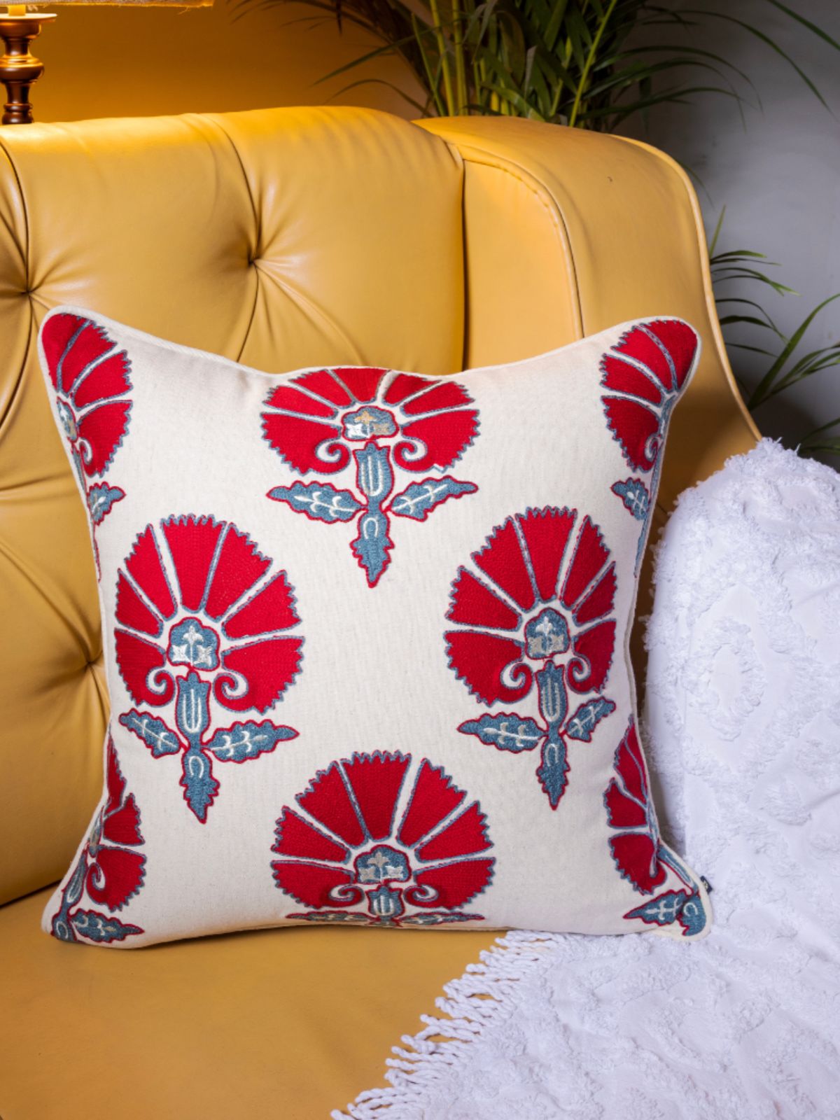 Symbolizing unity and celebration, the Red Wedlock cushion cover blends Kashmiri aari embroidery with classic Suzani motifs. The bold palette of cherry red, teal blue, and silver exudes warmth and festivity, making it a perfect statement piece. Every stitch reflects fine artisanal craftsmanship, rendered on soft fabric for texture and longevity. With its vibrant charm and old-world sophistication, this cushion effortlessly elevates modern and traditional interiors alike, embodying joy, craftsmanship, and cultural richness in every detail.