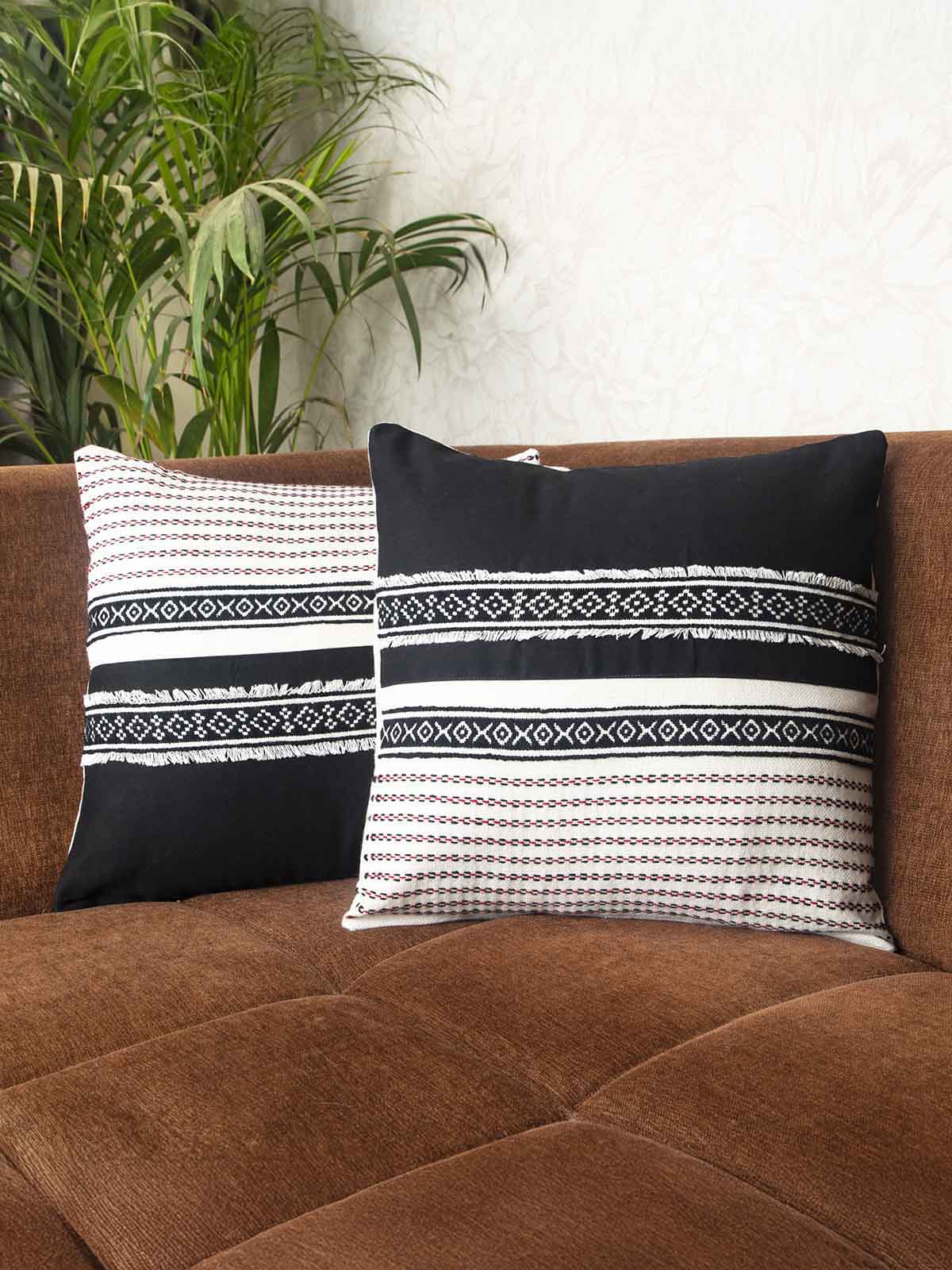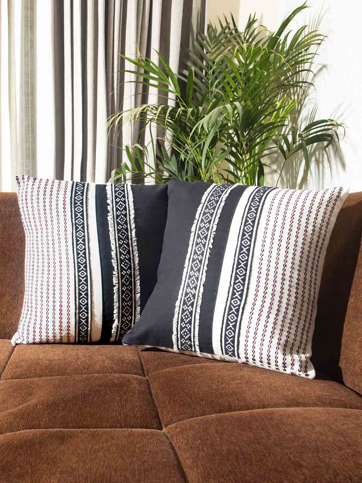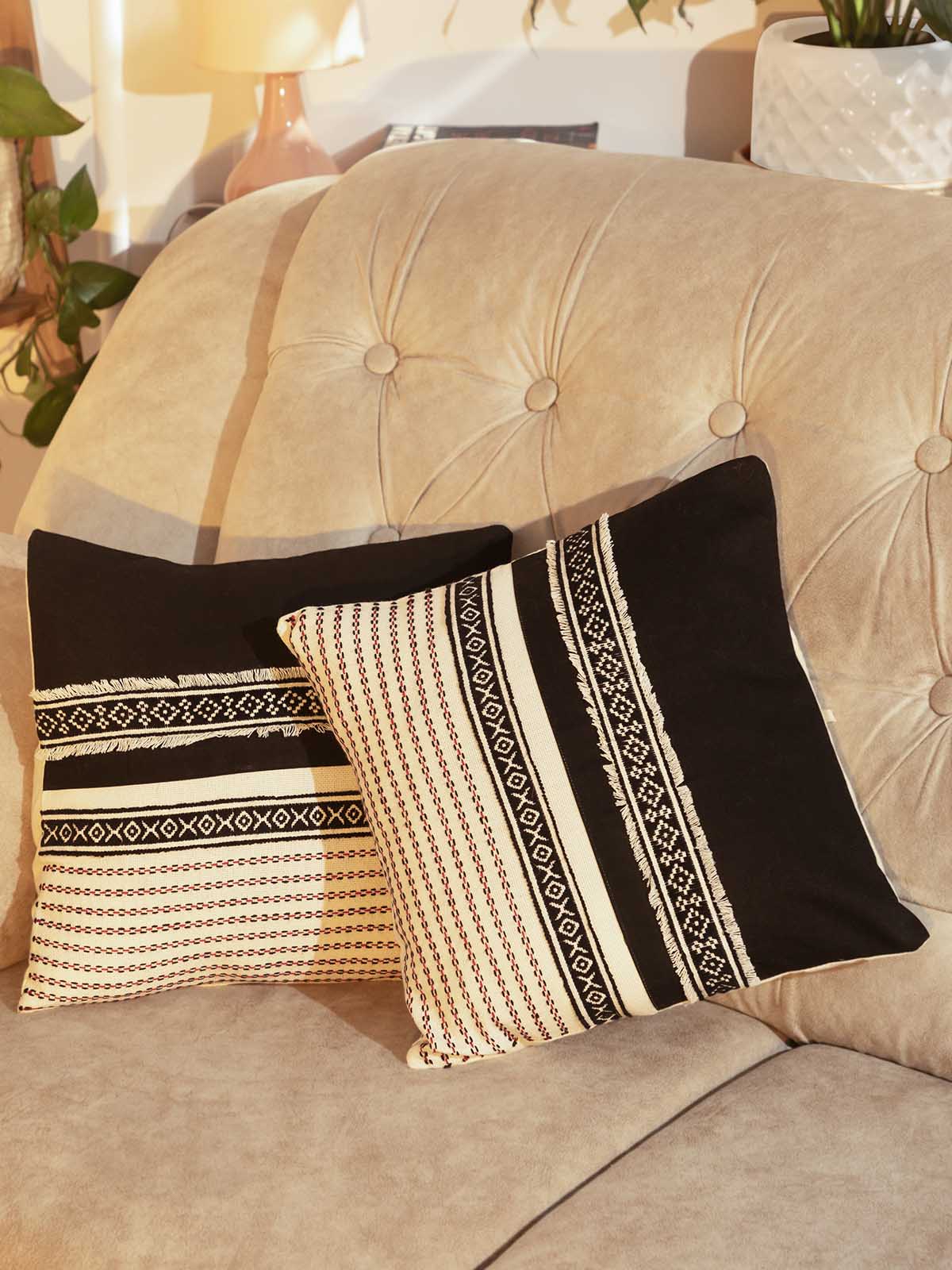 Bring a touch of tradition with this hand-embroidered cushion cover inspired by Toda tribal patterns. The timeless black-and-white color palette adds elegance to any setting, and the tie-backs make it simple to use and style.