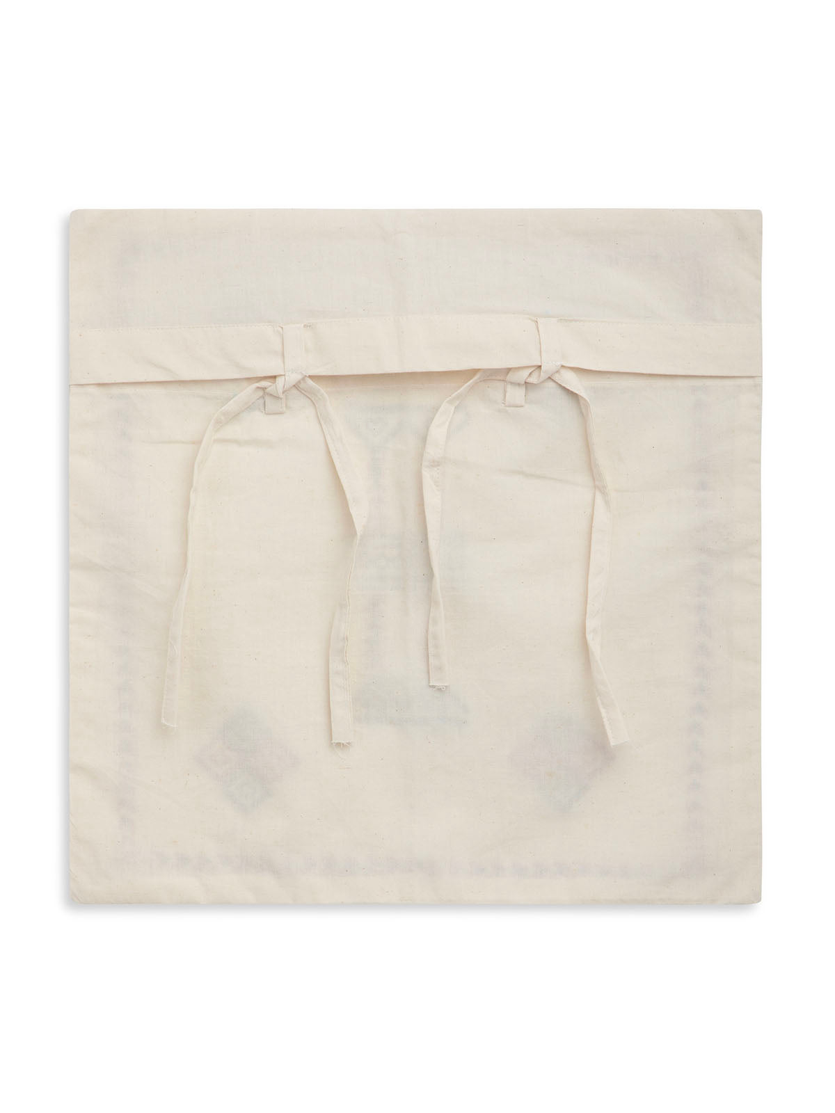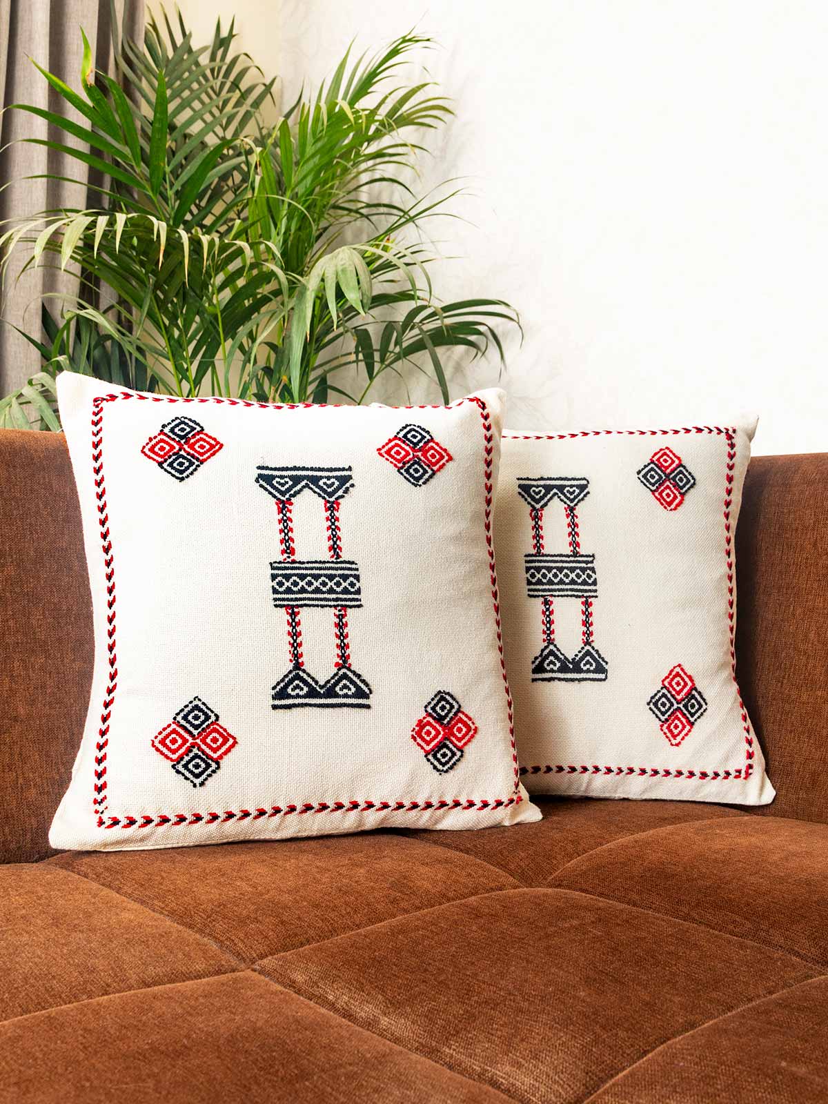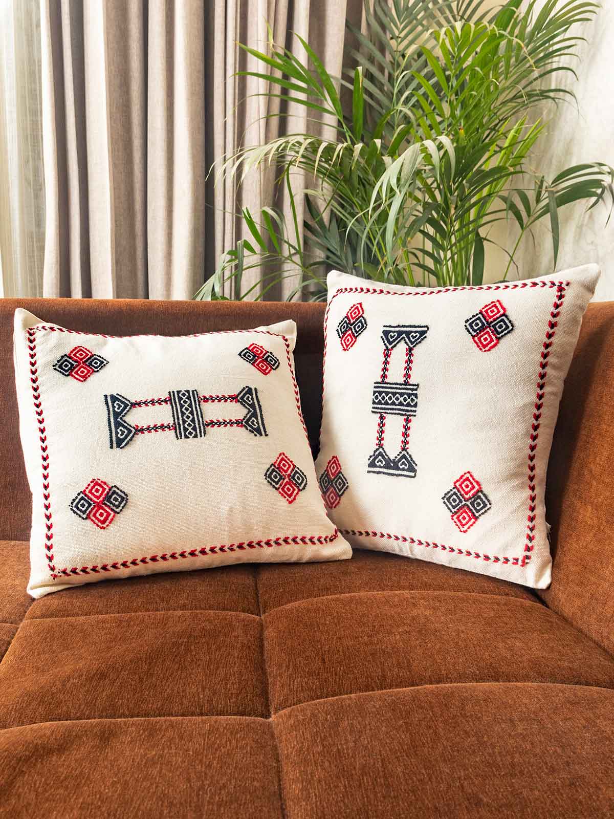 Elevate your space with this striking cushion cover, hand-embroidered in a modern interpretation of traditional Toda tribal art. The bold black, red, and white design makes a beautiful statement, while the tie-backs offer easy and secure fastening.
