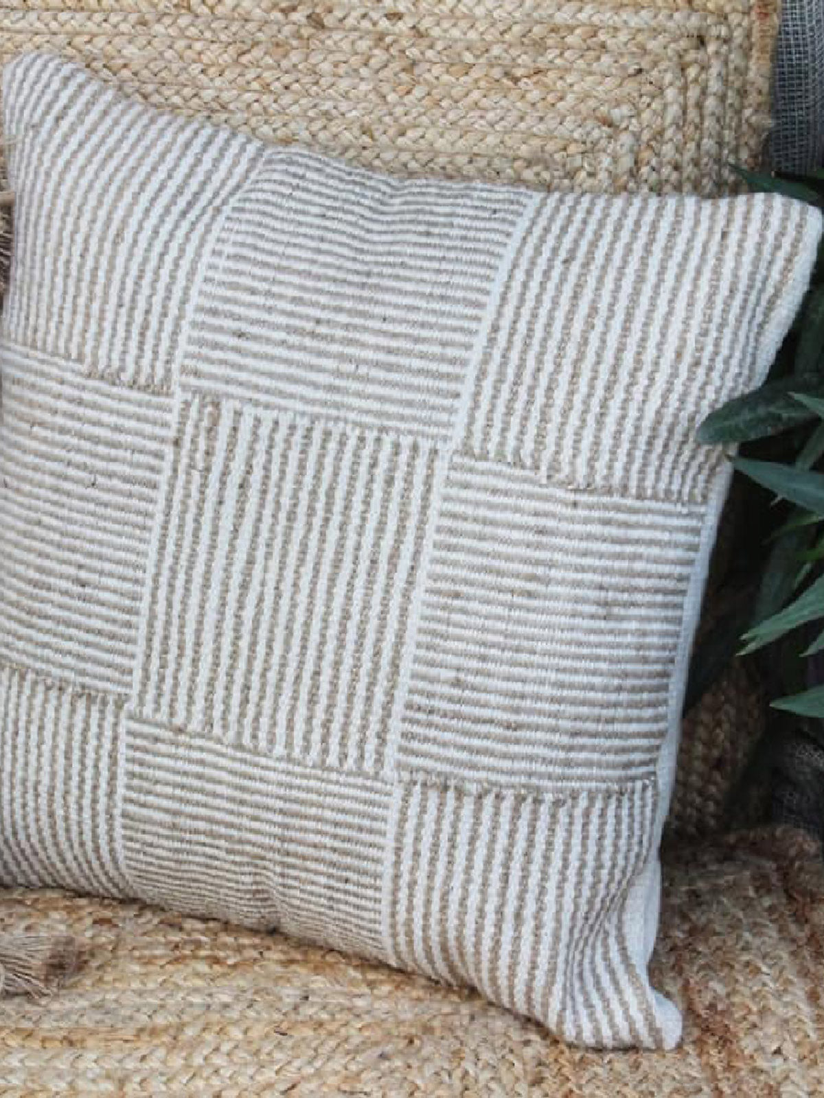 The jute collection, undisturbed transforms every experience into the extraordinary energy. The soothing collection uplifts the spirits and helps in finding the zen moment of life.The word undisturbed is inspired by calm and immerse your senses in calm and rejuvenating air. The collection reflects a masterful melange of thoughtful design and expert hand craftsmanship.This handwoven Undisturbed cushion is form with jute and natural yarn giving a blotched touch is formed in cut shuttle featuring it an enviable glance.