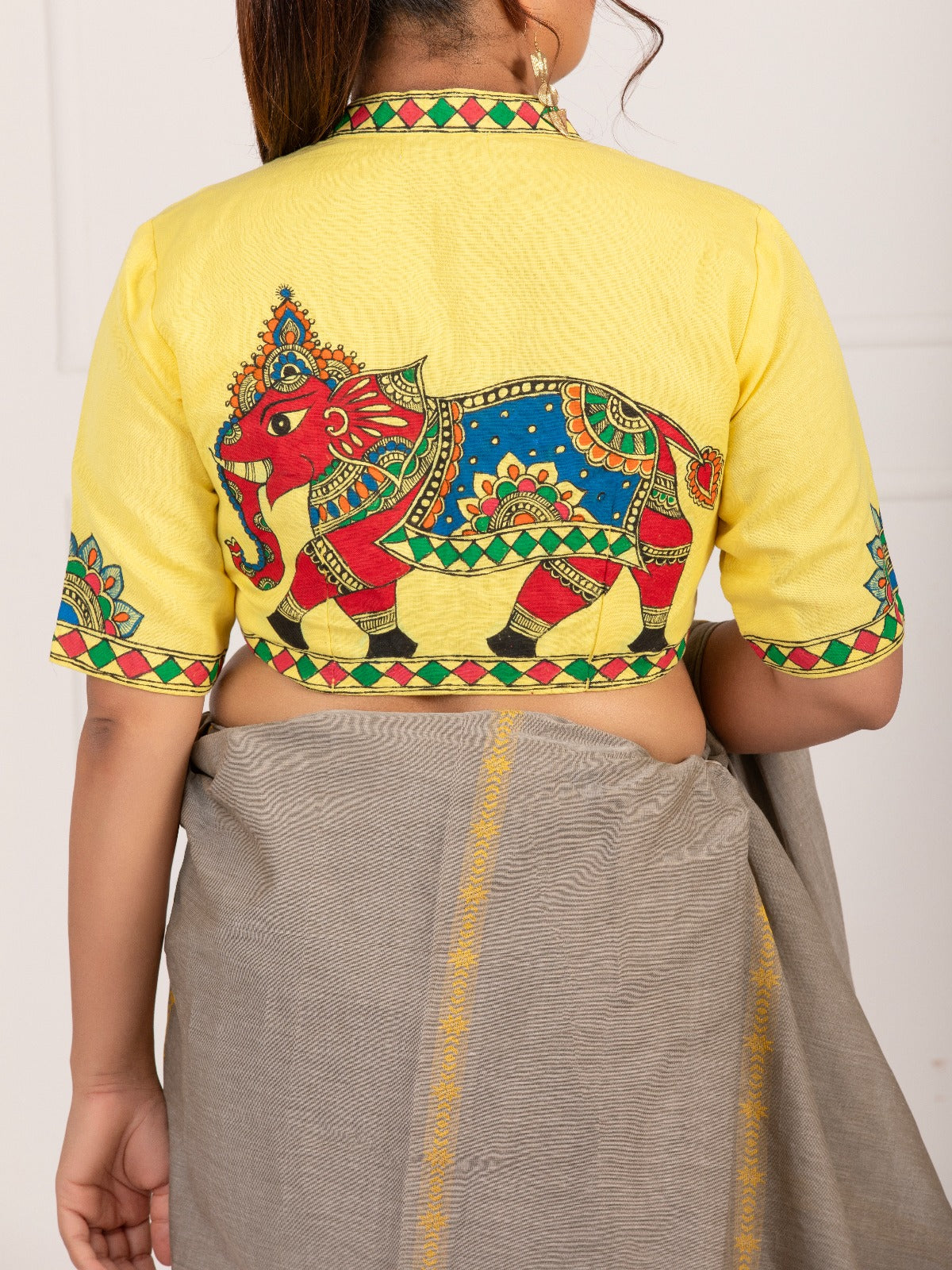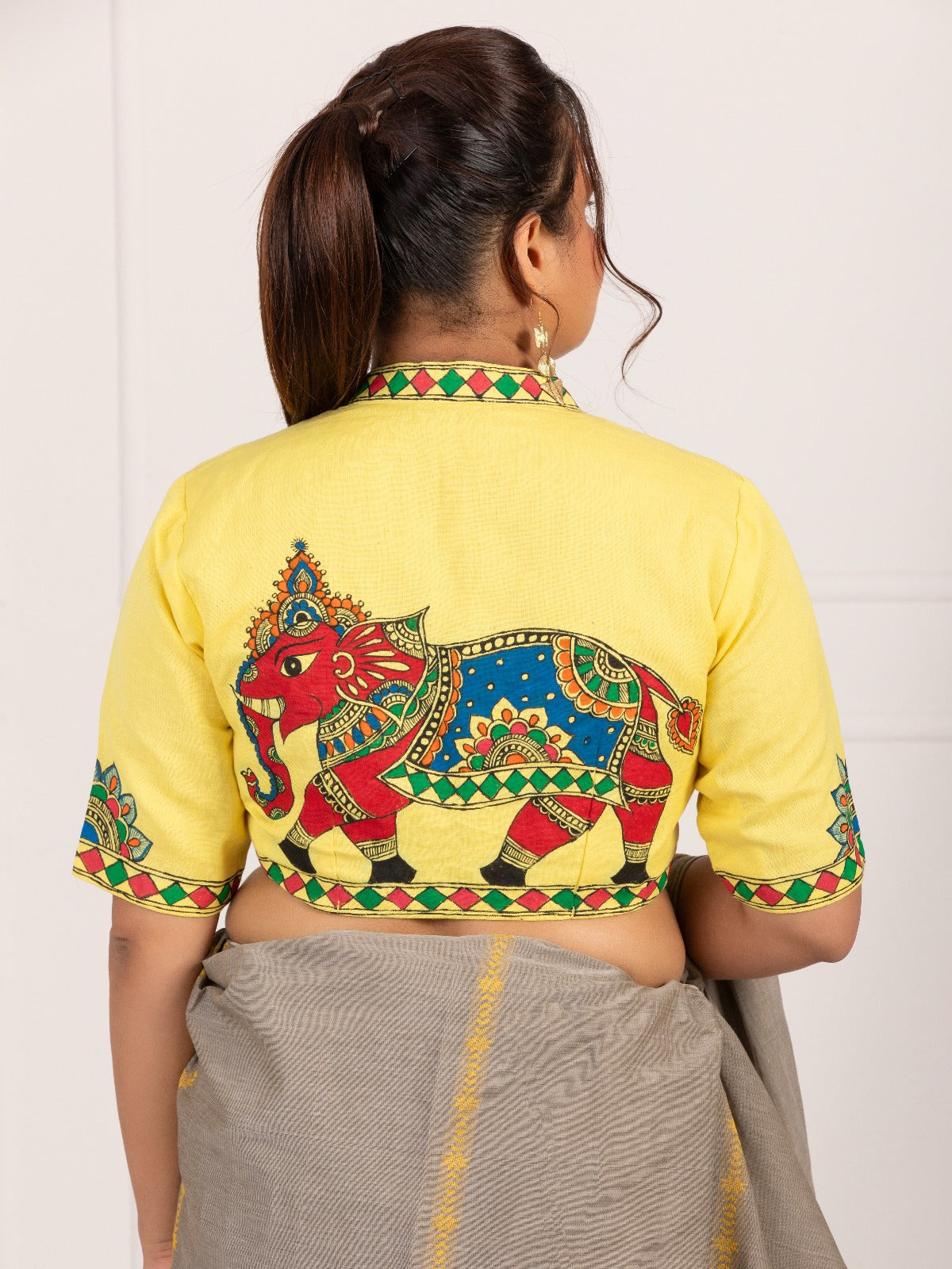 Regal yet subtle, the Crowned Calm Handpainted Blouse features intricate hand-painted motifs of peacocks, florals, and divine inspirations. Crafted on luxurious fabric, each piece is uniquely expressive. Perfect for pairing with saris or skirts, it blends traditional artistry with contemporary style, radiating elegance and cultural richness.