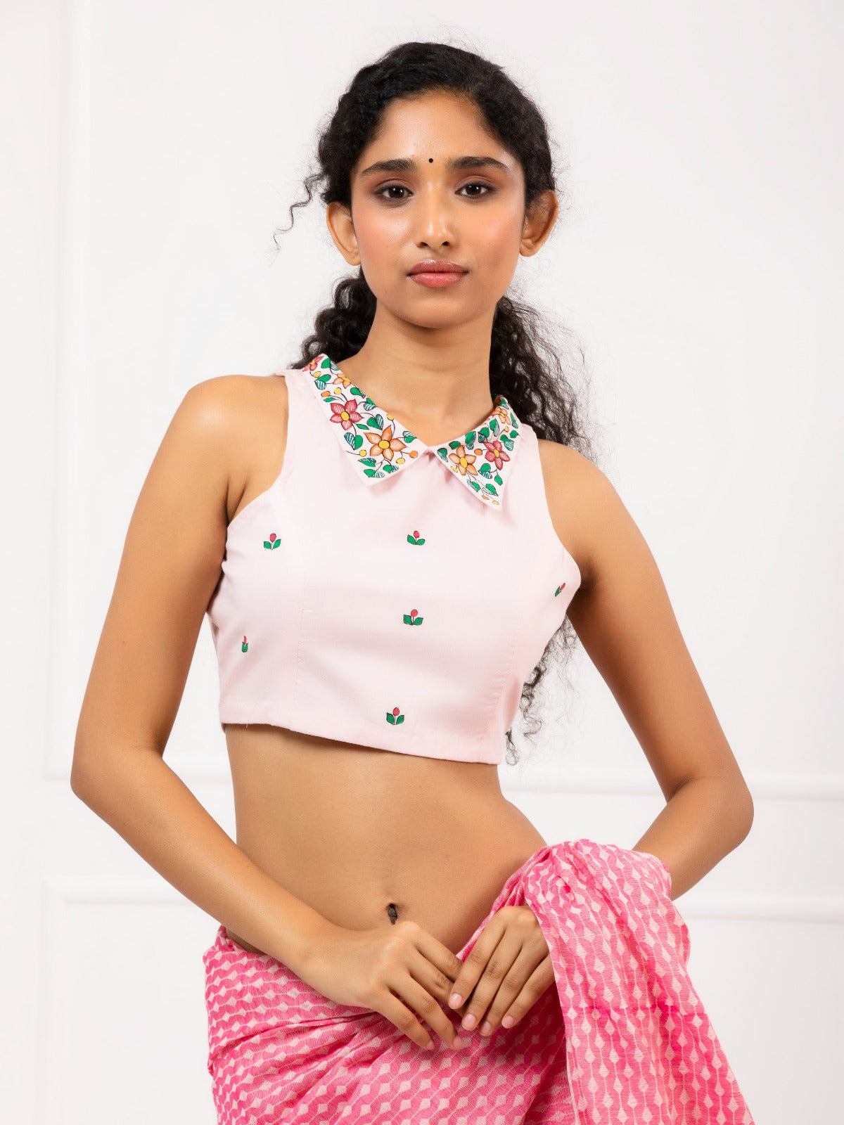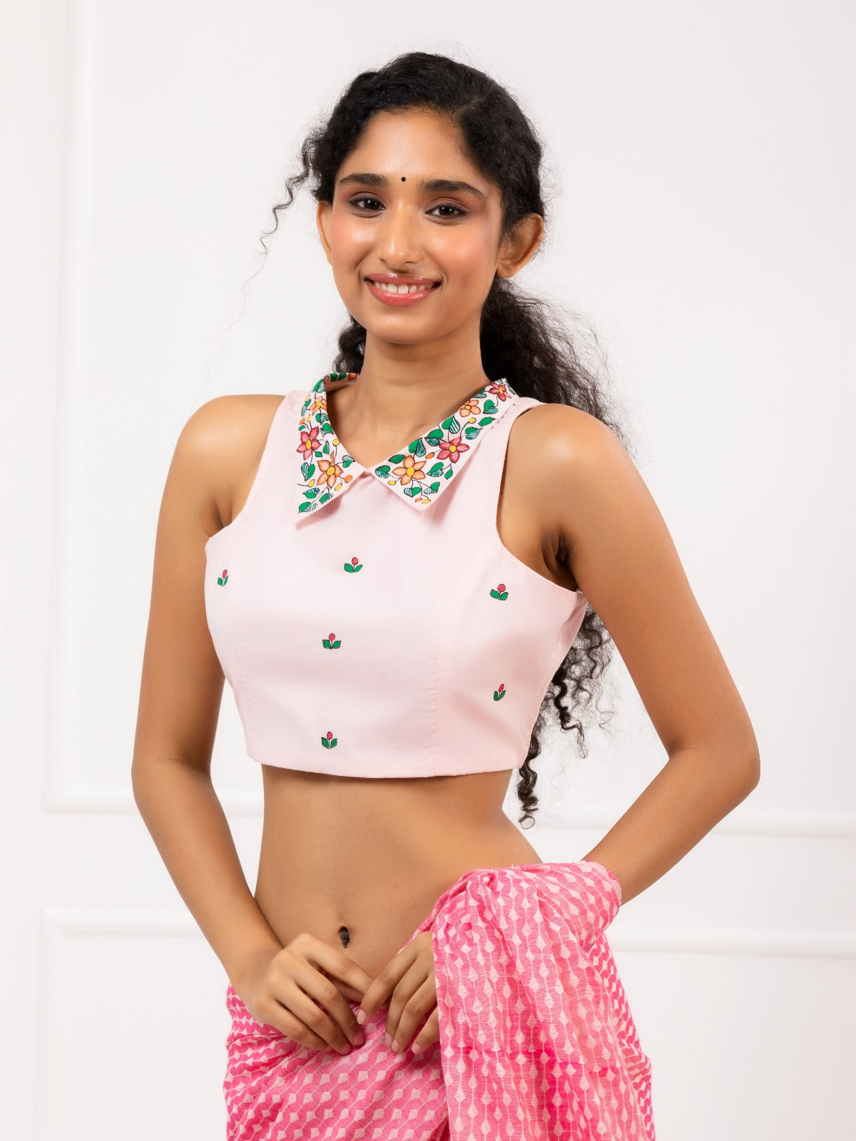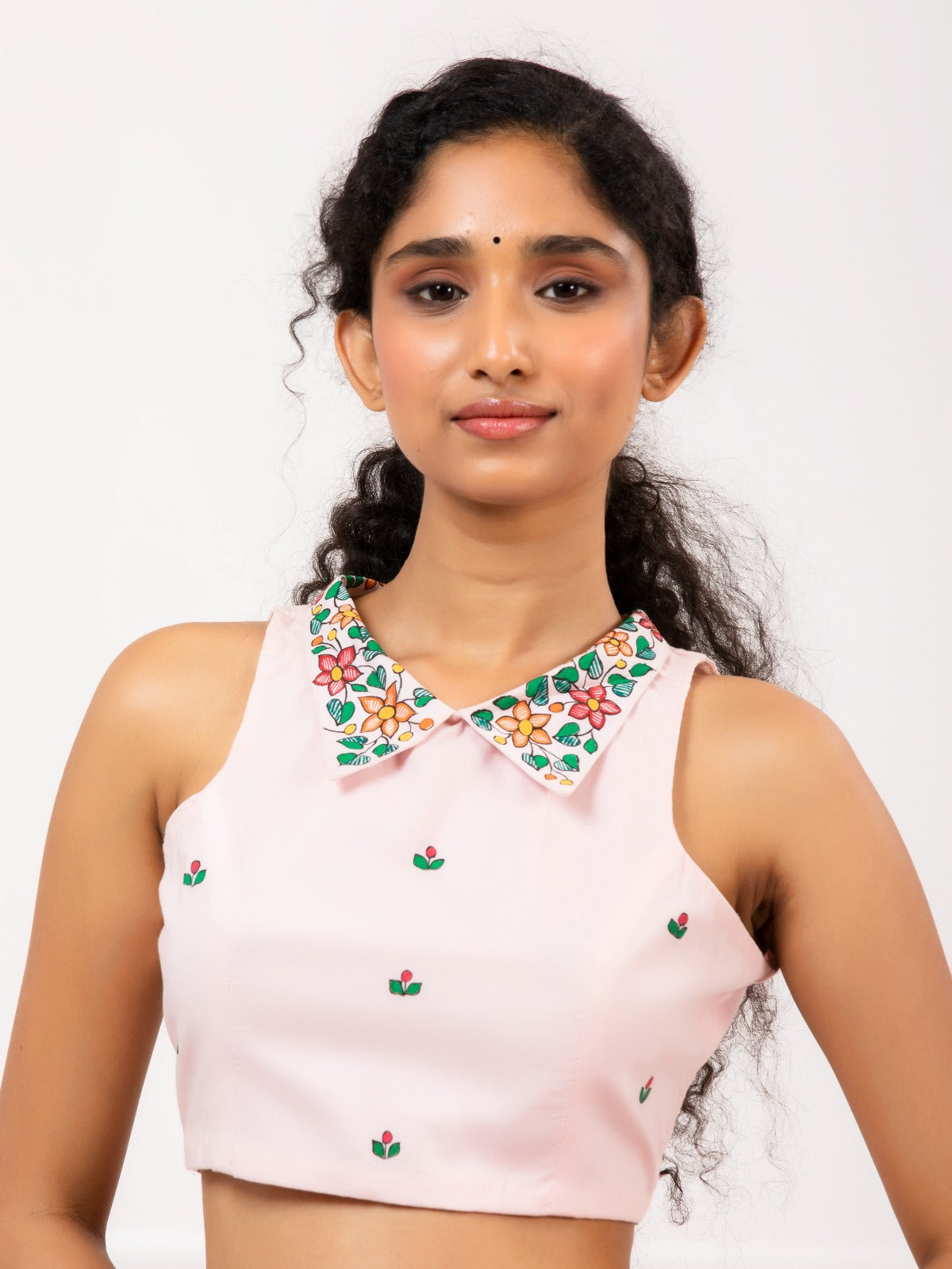 Floral Kiss blouse celebrates delicate floral artistry through intricate handpainting on pure fabric. Each unique creation represents a blend of folk-inspired motifs and modern elegance. Versatile and sophisticated, it is perfect for pairing with traditional or contemporary attire, allowing you to express your style while honoring timeless craftsmanship and design.
