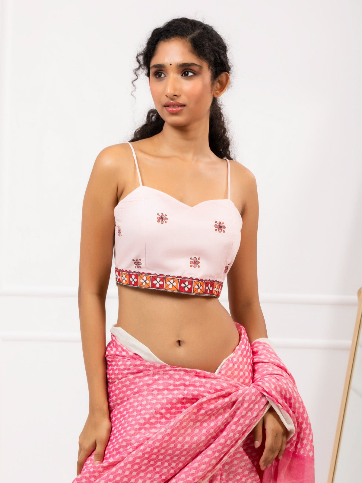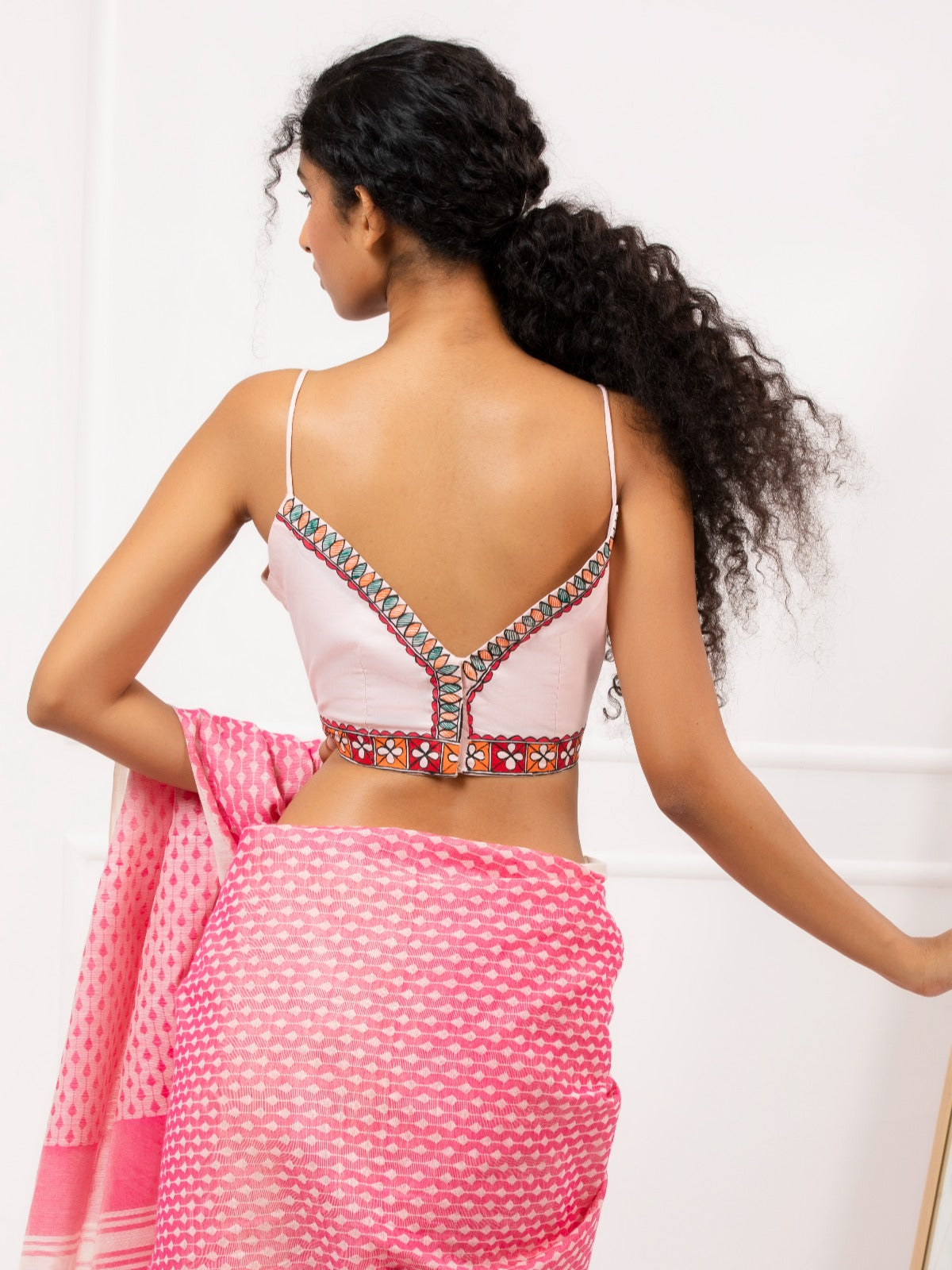 Floral Mosaic blouse is adorned with handpainted motifs arranged in an artistic mosaic pattern, reflecting tradition and creativity. Each piece is uniquely crafted on pure fabric, ensuring individuality and charm. This versatile blouse pairs seamlessly with sarees or fusion wear, infusing every outfit with artisanal beauty and cultural storytelling.
