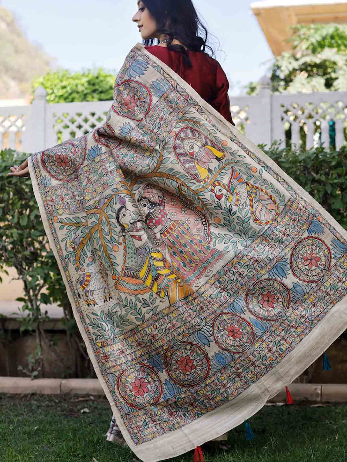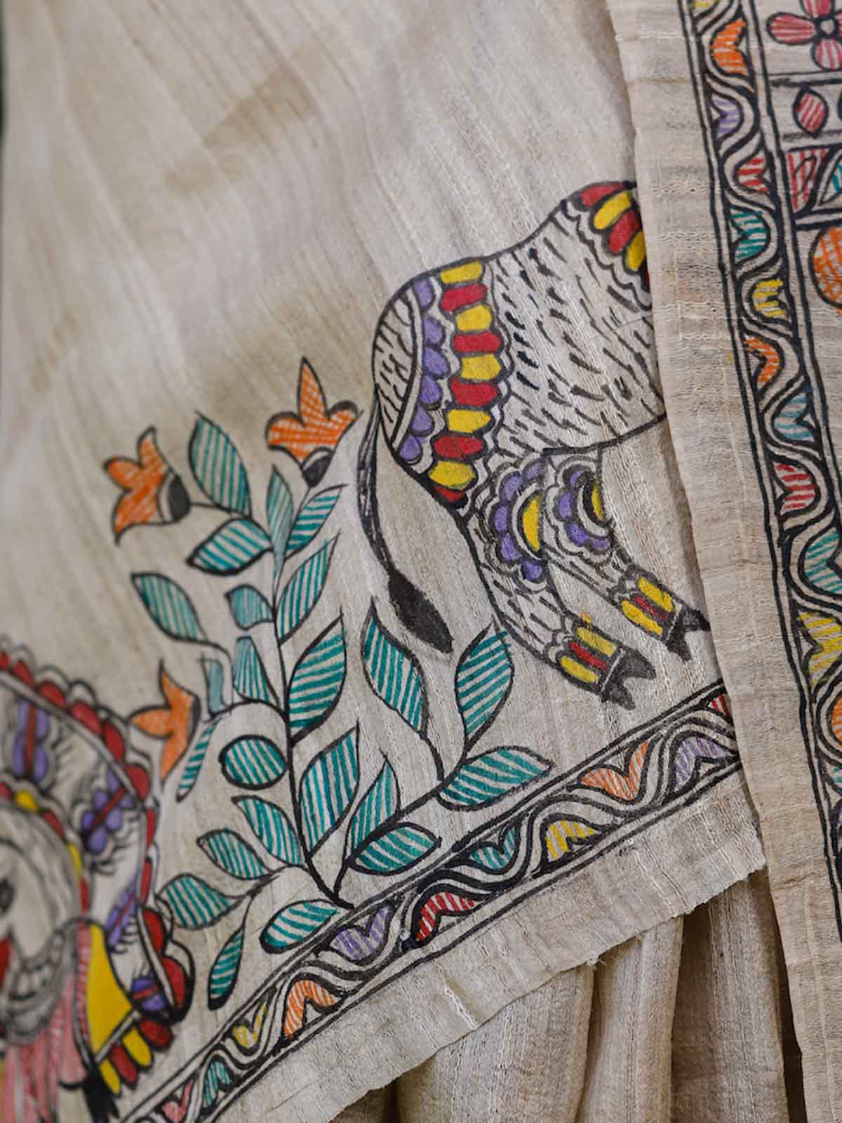 Madhubani Hand Painted Krishna Raas Tussar Silk Saree