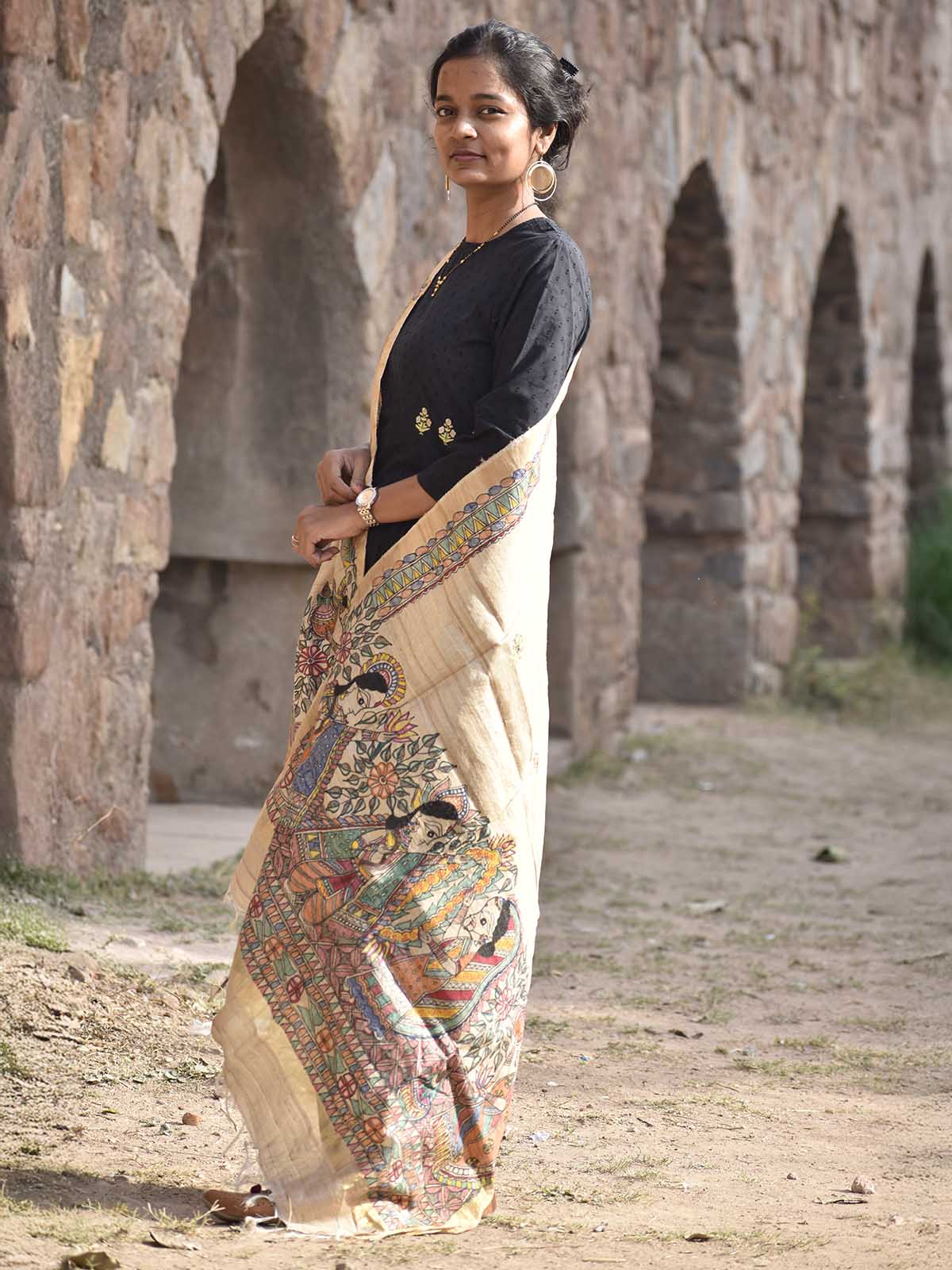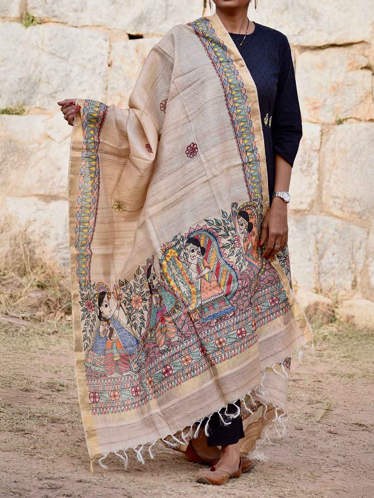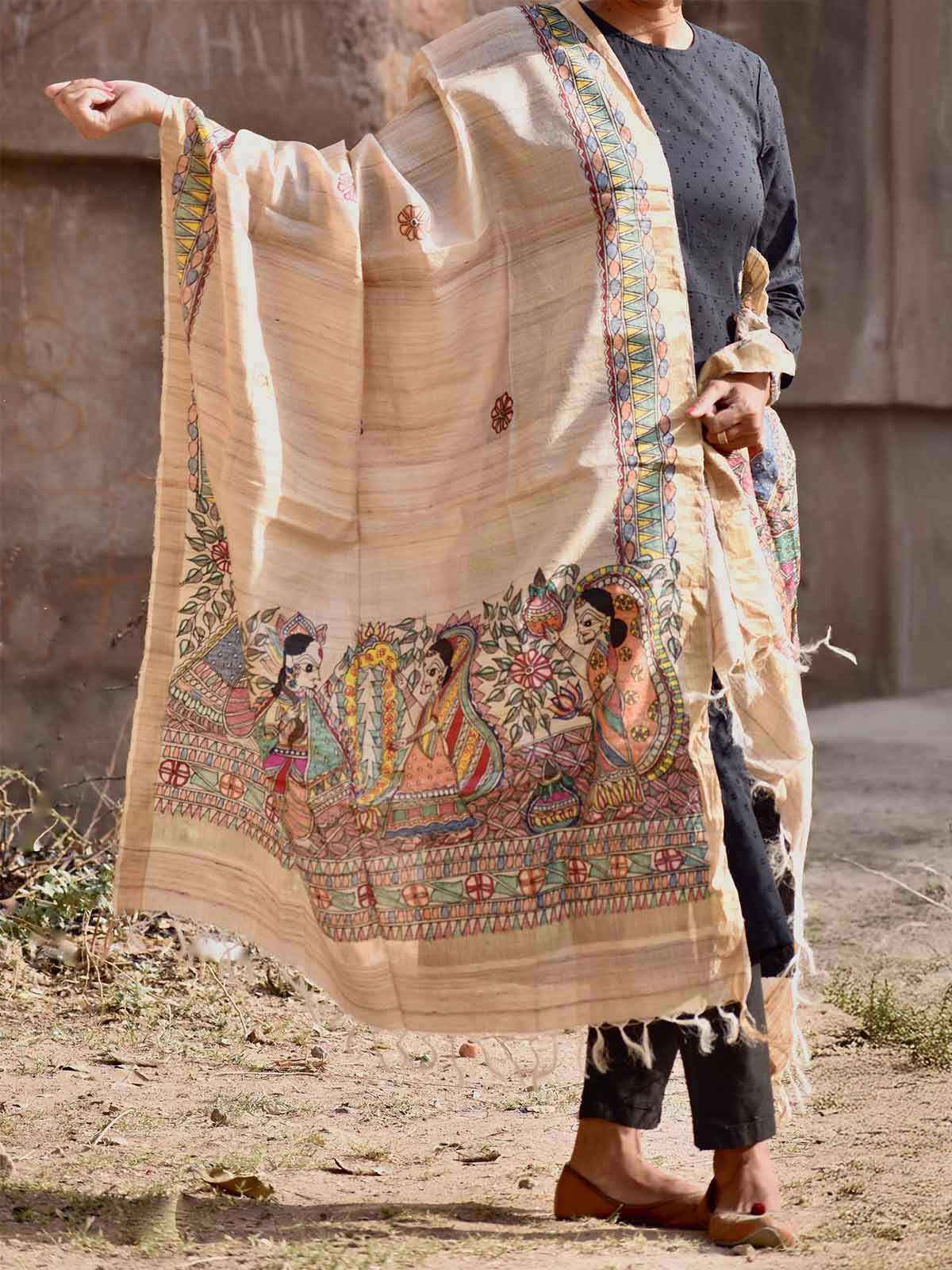 Madhubani Hand Painted Natural Tussar Silk Dupatta 1