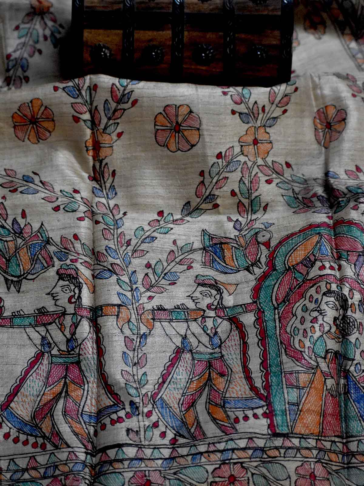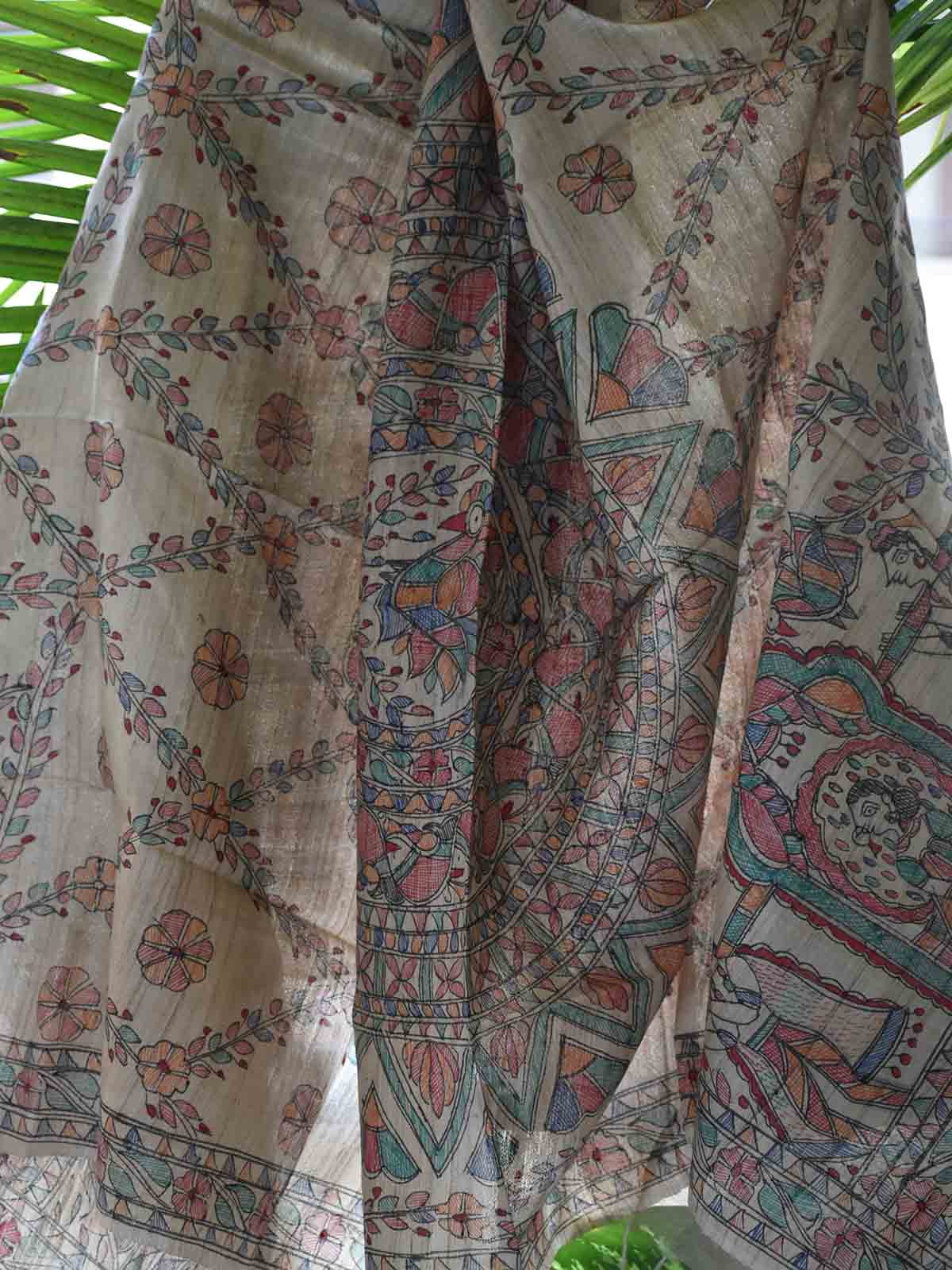 Madhubani Hand Painted Natural Tussar Silk Dupatta