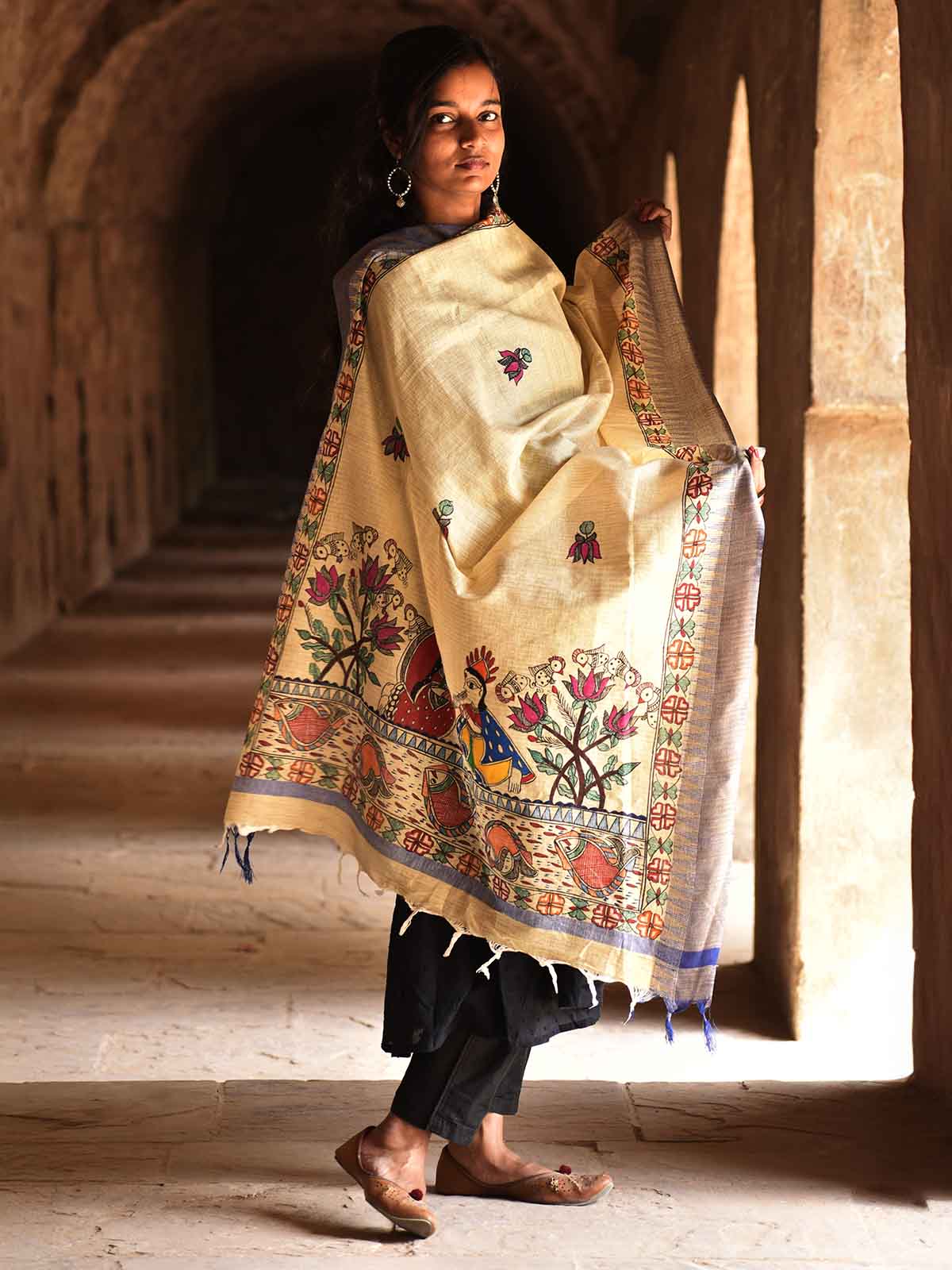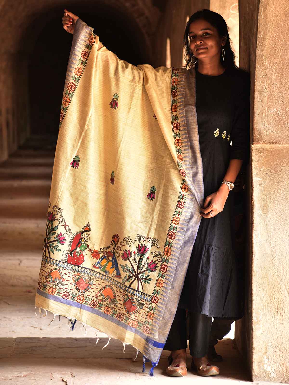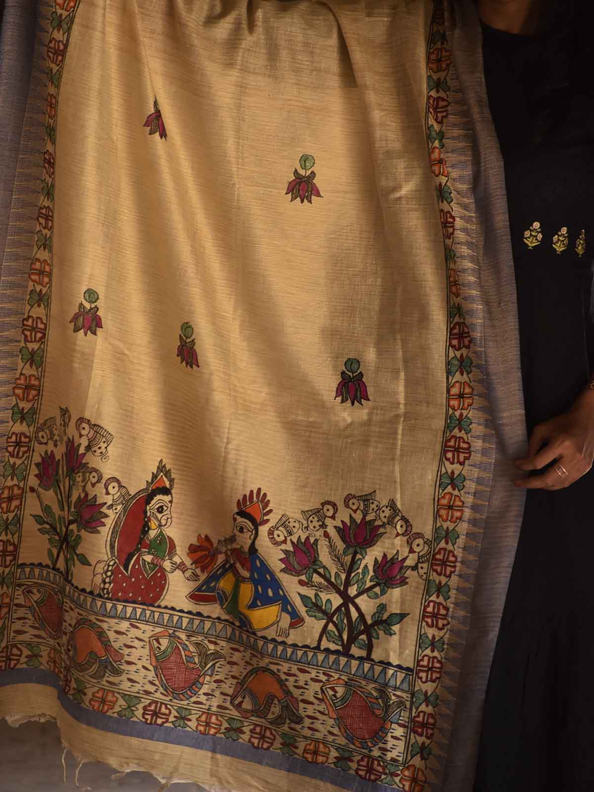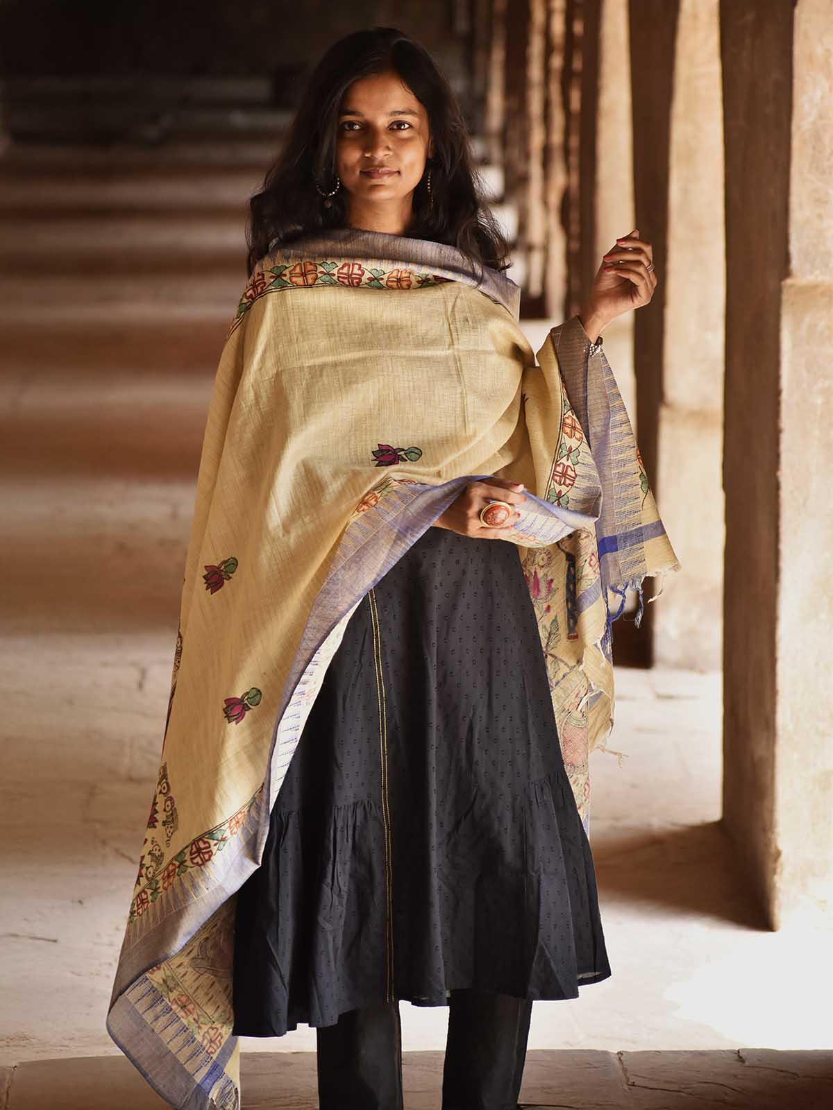 Madhubani Hand Painted Radha Krishna Cotton Dupatta