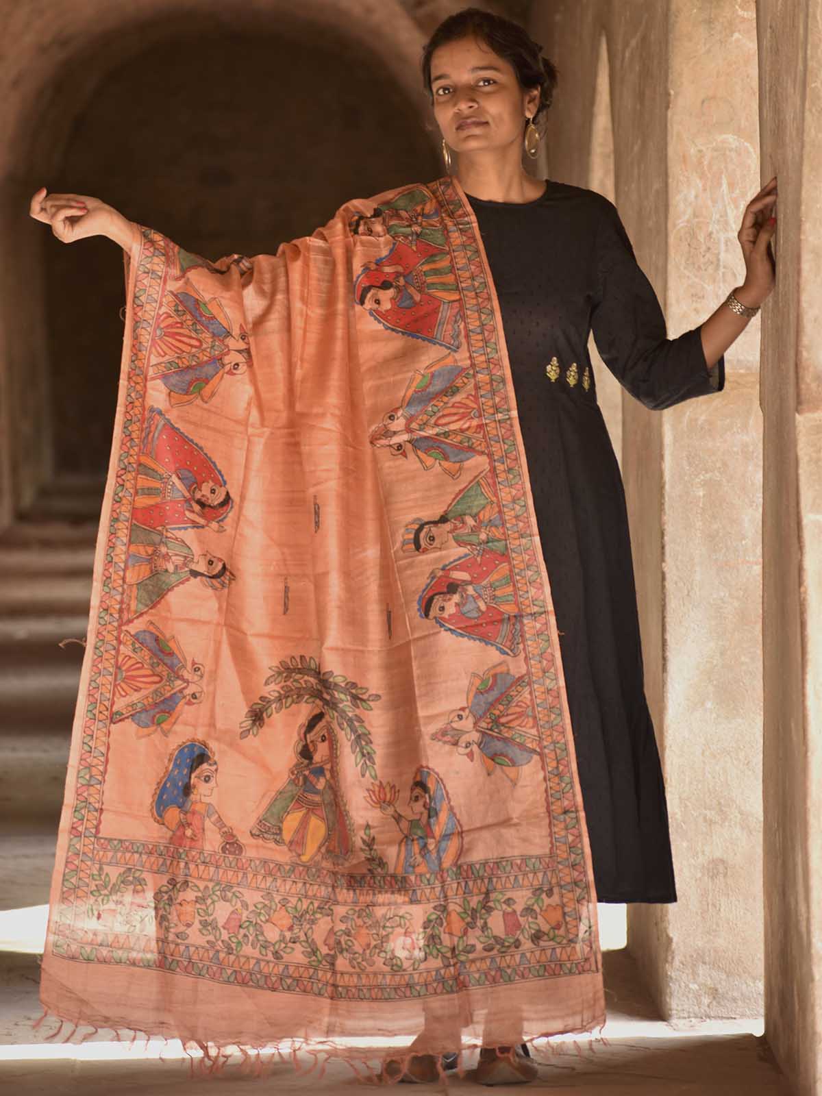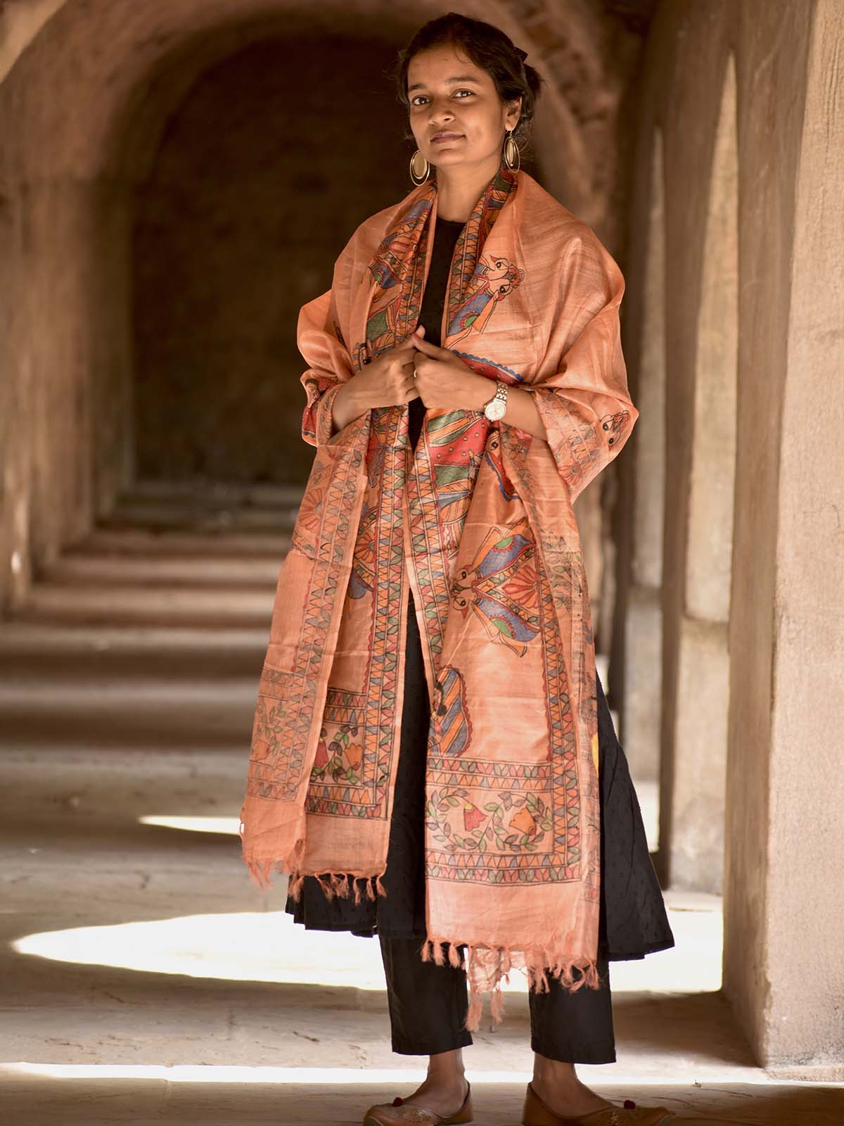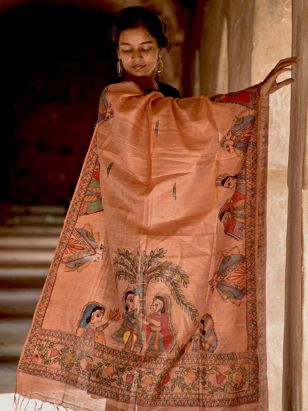 Madhubani Hand Painted Salmon Tussar Silk Dupatta