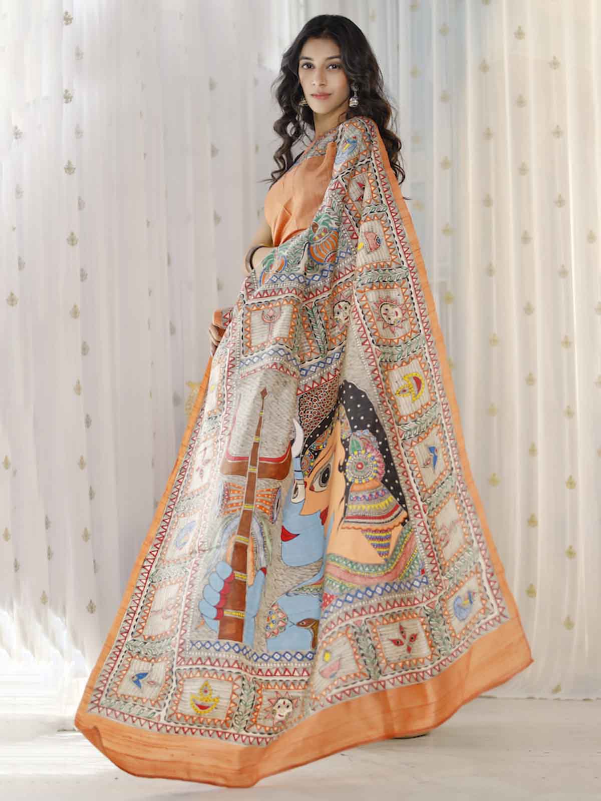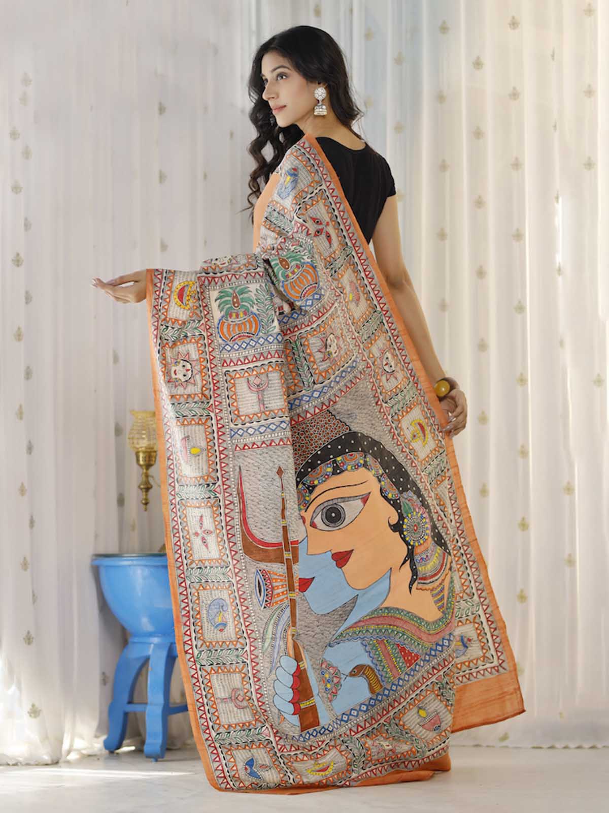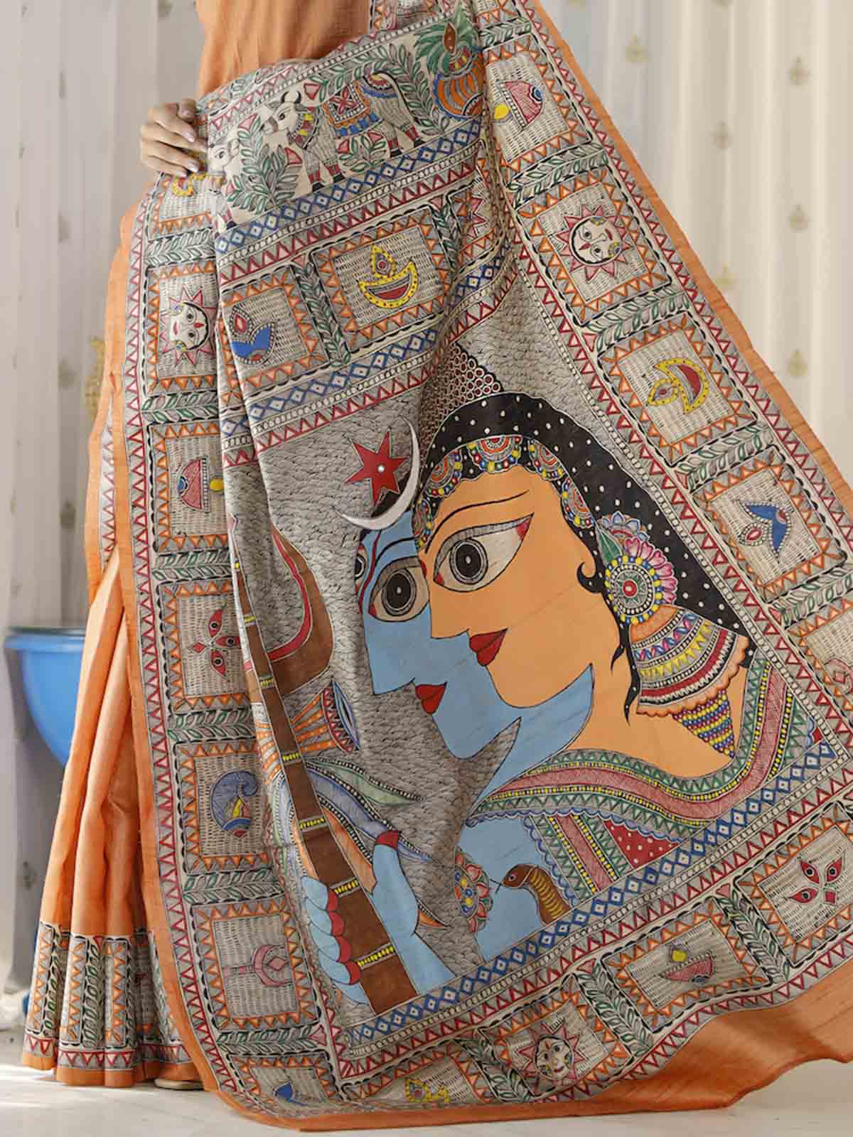 Madhubani Hand Painted Shiv Parvati Tussar Silk Saree