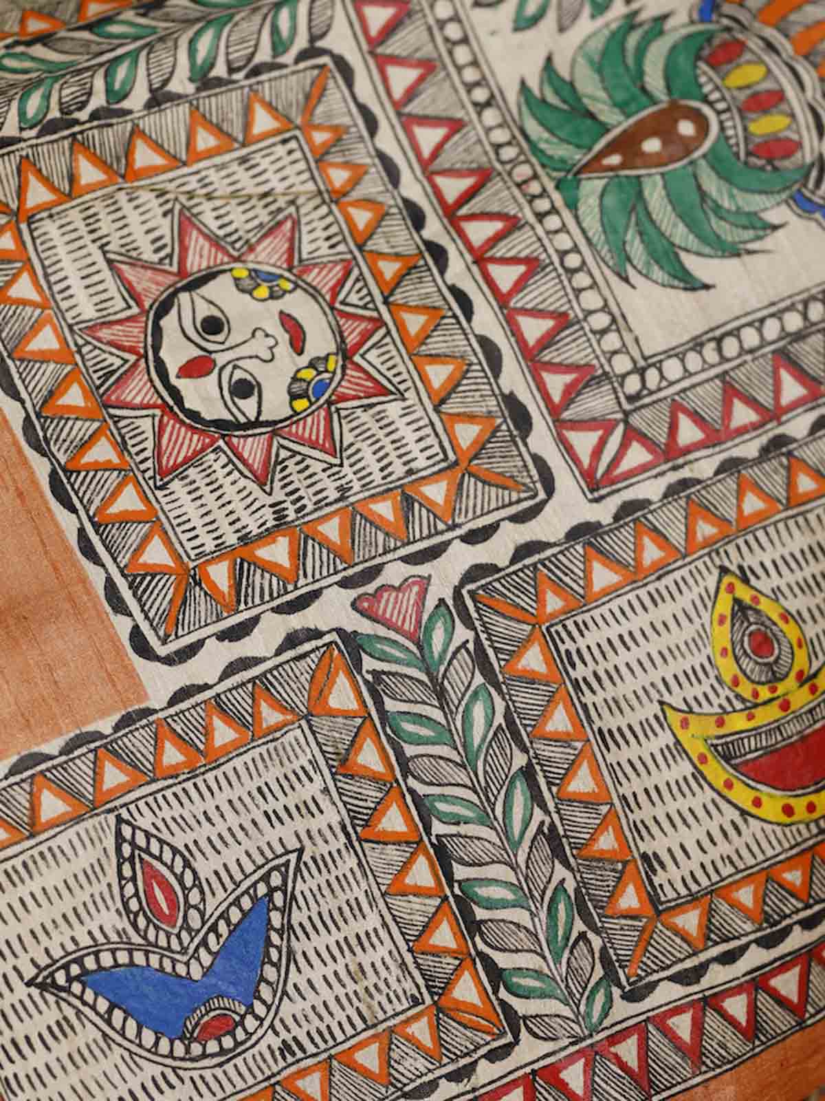 Madhubani painting is a famous art that originated in the Mithila region of Bihar (India). Madhubani hand-painted art is considered to be as old as the era in which Ramayana was set. It is said that inhabitants of the Mithila region painted their homes and streets with Madhubani art. Madhubani paintings were done to celebrate the wedding of Lord Ram and Sita. Madhubani paintings were done using natural colors and twigs of the tree. These days it is done using acrylic paints and brush. Each item is handcrafted with the hand-painting technique, and might carry variations of color, patterns and other delicate inefficiencies. Handloom fabric may have uneven texture.