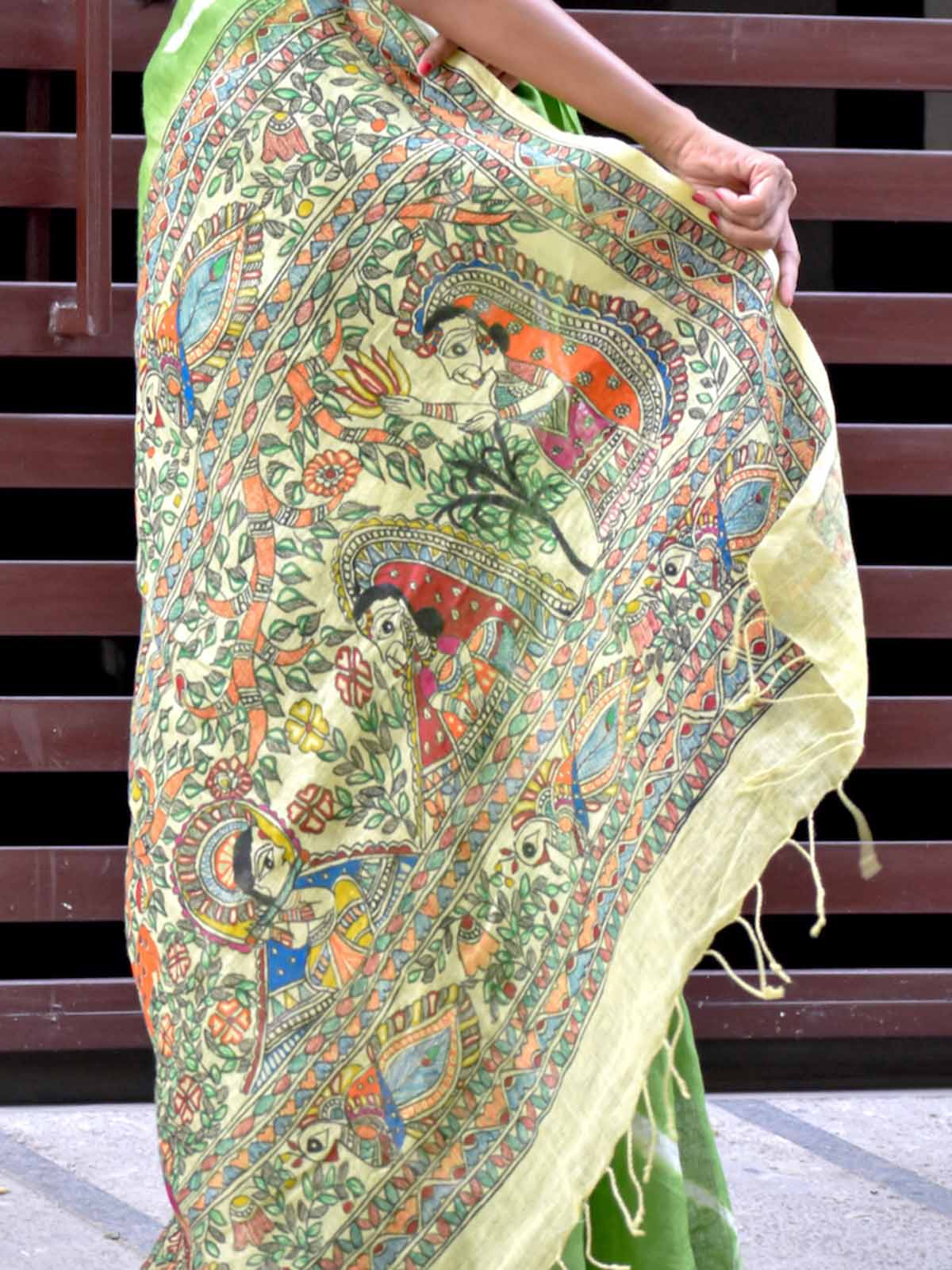 Madhubani painting is a famous art that originated in the Mithila region of Bihar (India). Madhubani hand-painted art is considered to be as old as the era in which Ramayana was set. It is said that inhabitants of the Mithila region painted their homes and streets with Madhubani art. Madhubani paintings were done to celebrate the wedding of Lord Ram and Sita. Madhubani paintings were done using natural colors and twigs of the tree. These days it is done using acrylic paints and brush. Each item is handcrafted with the hand-painting technique, and might carry variations of color, patterns and other delicate inefficiencies. Handloom fabric may have uneven texture.