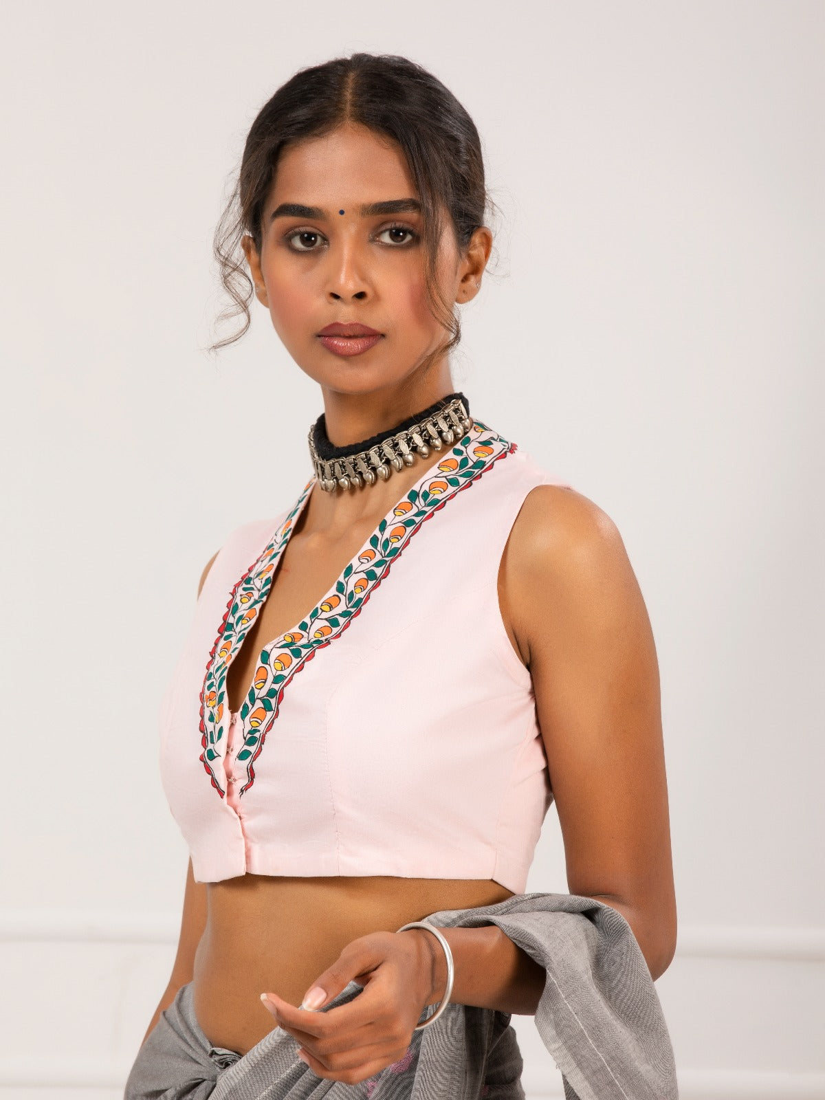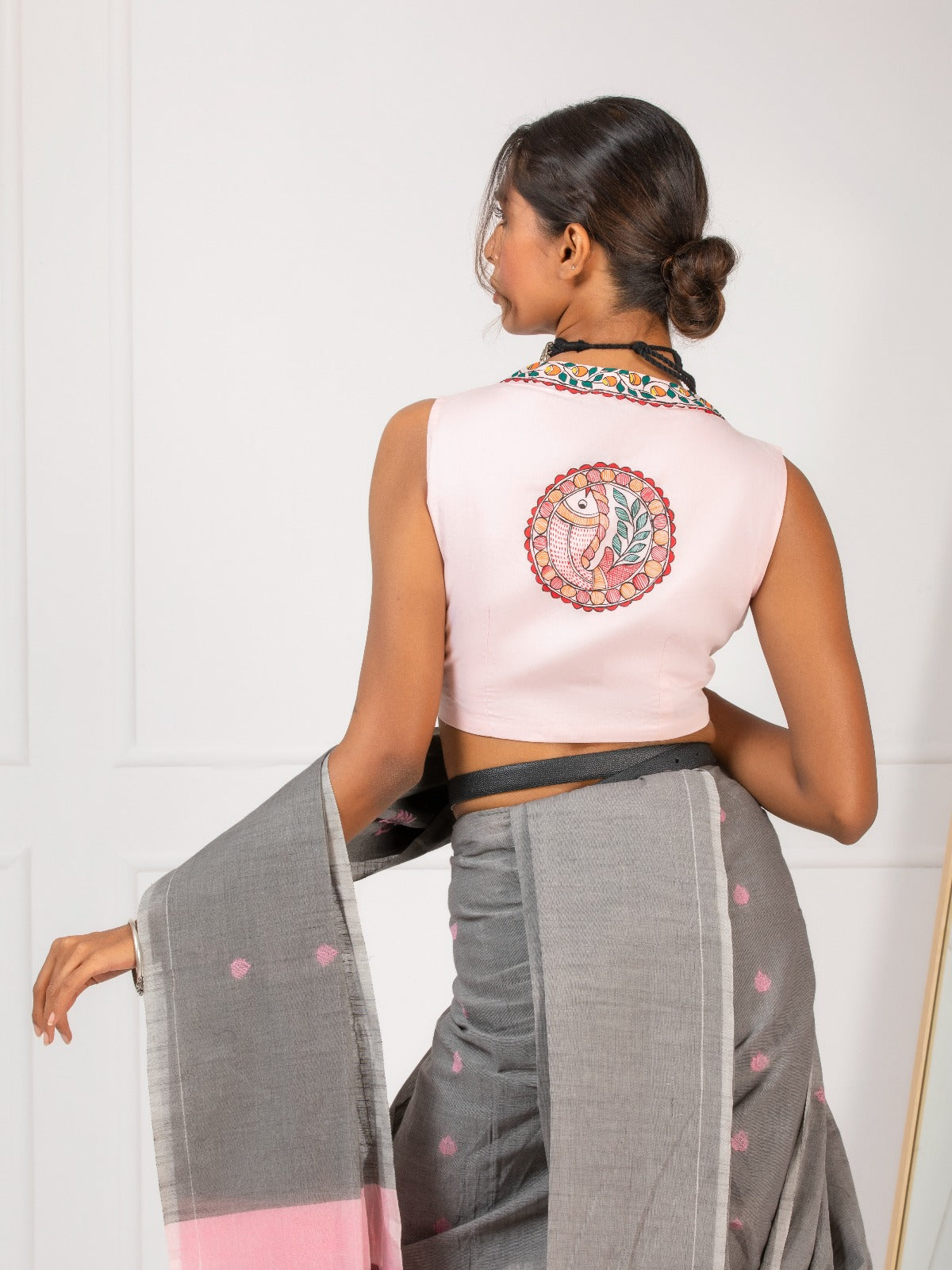 The Naksha Handpainted Blouse is a canvas of storytelling. Featuring motifs like Radha-Krishna, birds, or intricate florals, every piece is hand-painted by artisans on fine fabric, making it uniquely yours. Perfect for pairing with saris or contemporary separates, it blends heritage craftsmanship with sophisticated, wearable art.