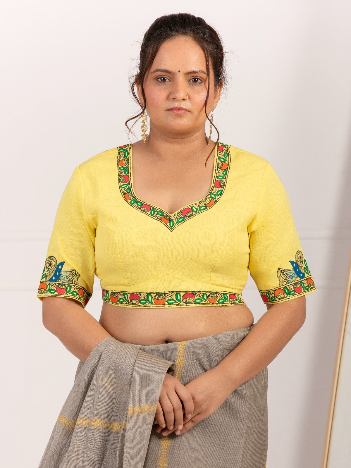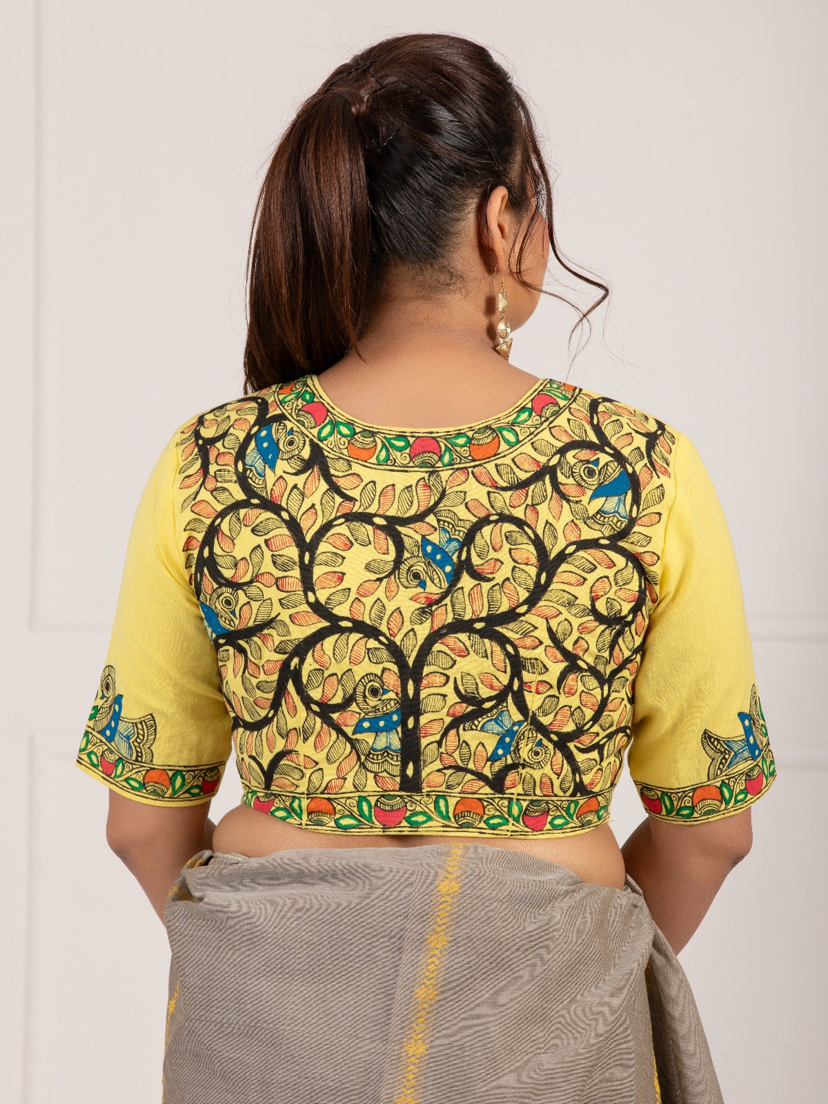 Featuring serene motifs of resting birds and delicate florals, the Resting Wings Handpainted Silk Blouse celebrates nature’s tranquility. Hand-painted on premium silk, every piece is a wearable artwork, unique in its design and execution. Ideal for pairing with saris, skirts, or trousers for timeless, graceful sophistication.