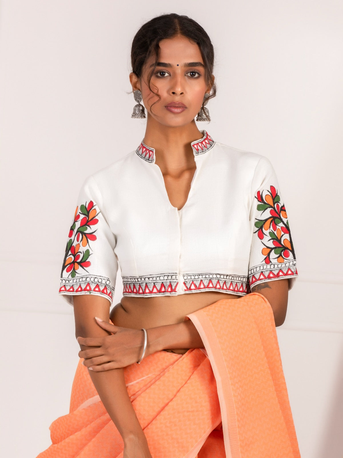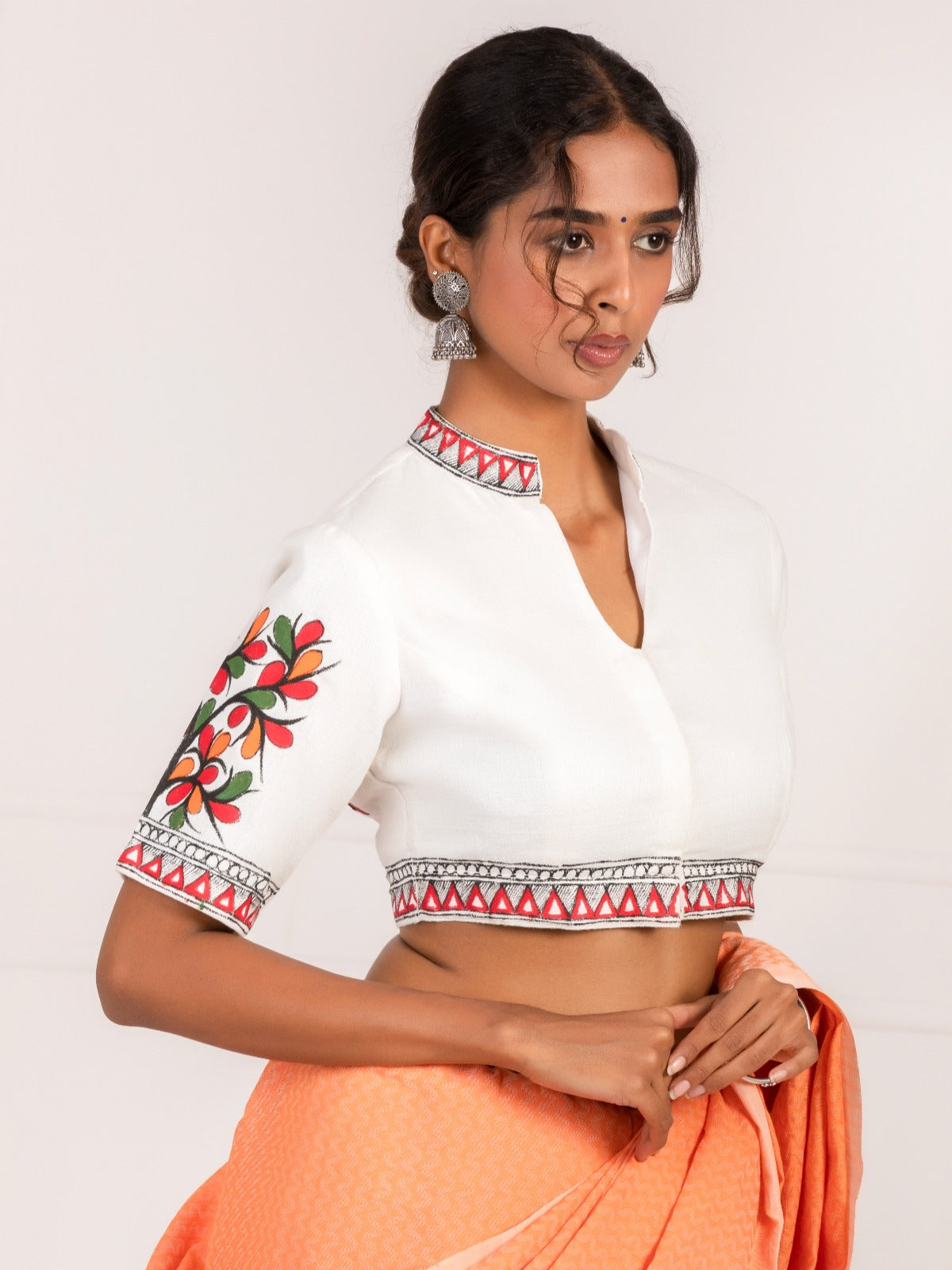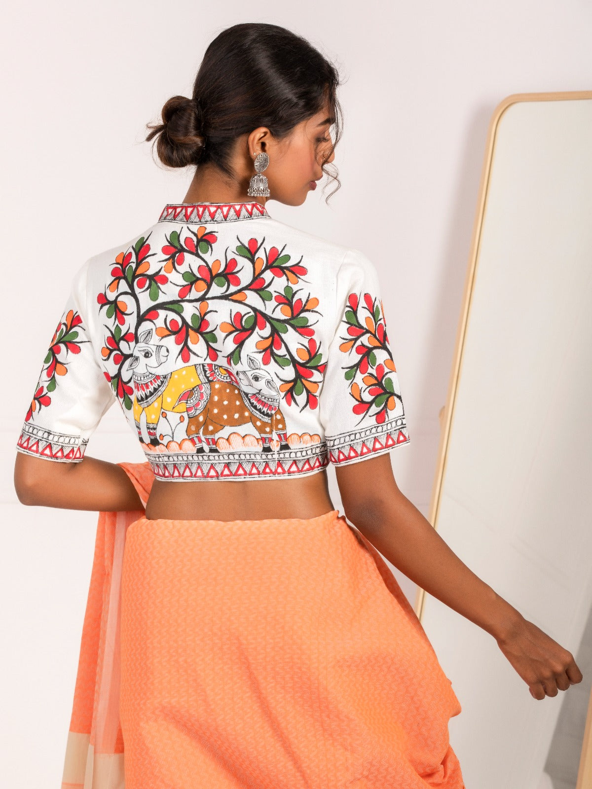 Under the Canopy blouse features handpainted designs inspired by lush forest canopies, symbolizing tranquility and life. Made on pure fabric by artisans, each piece is unique and full of character. Perfect for saris or skirts, it brings wearable art into everyday fashion, honoring Indian folk traditions while staying stylishly modern.