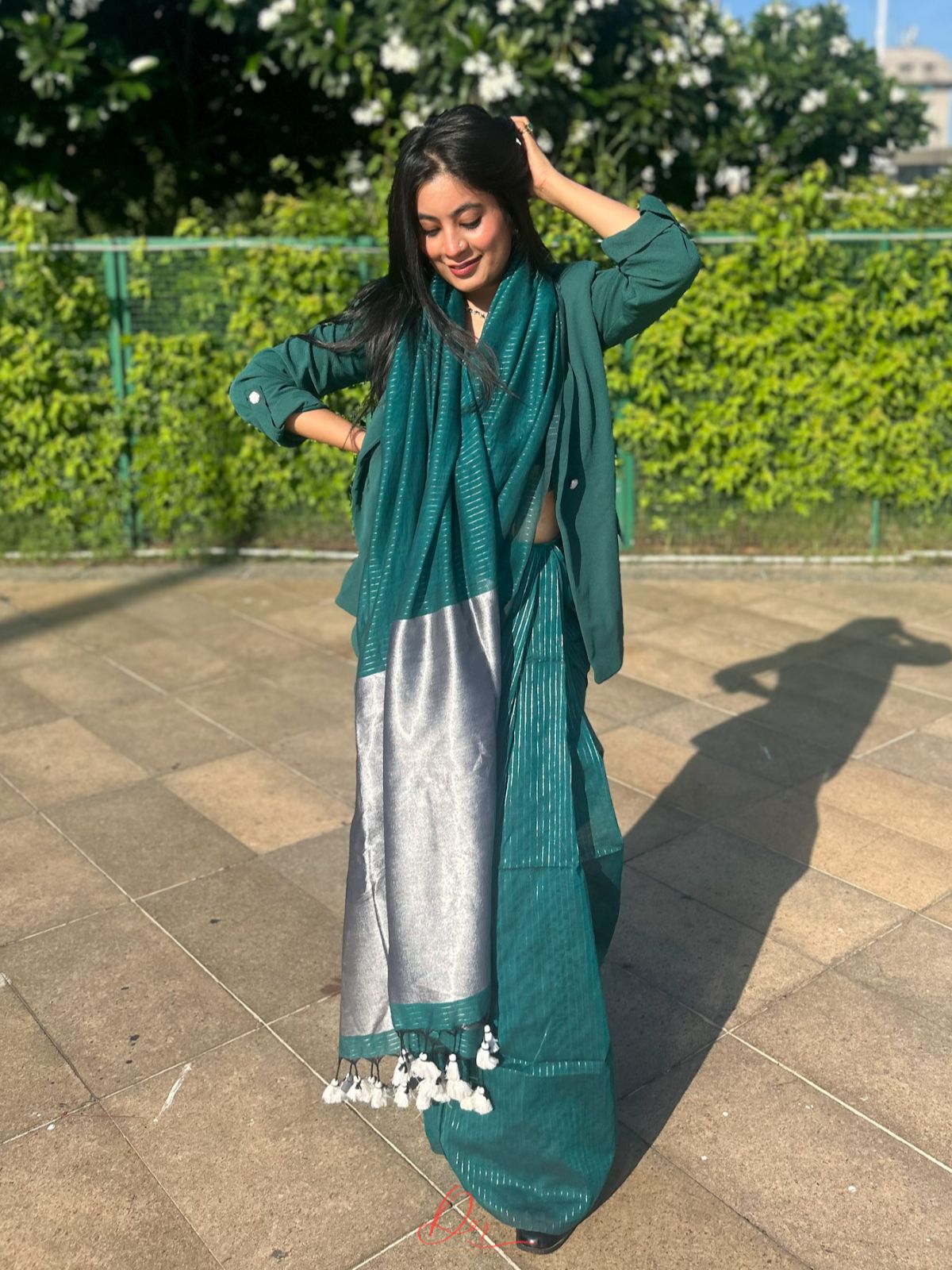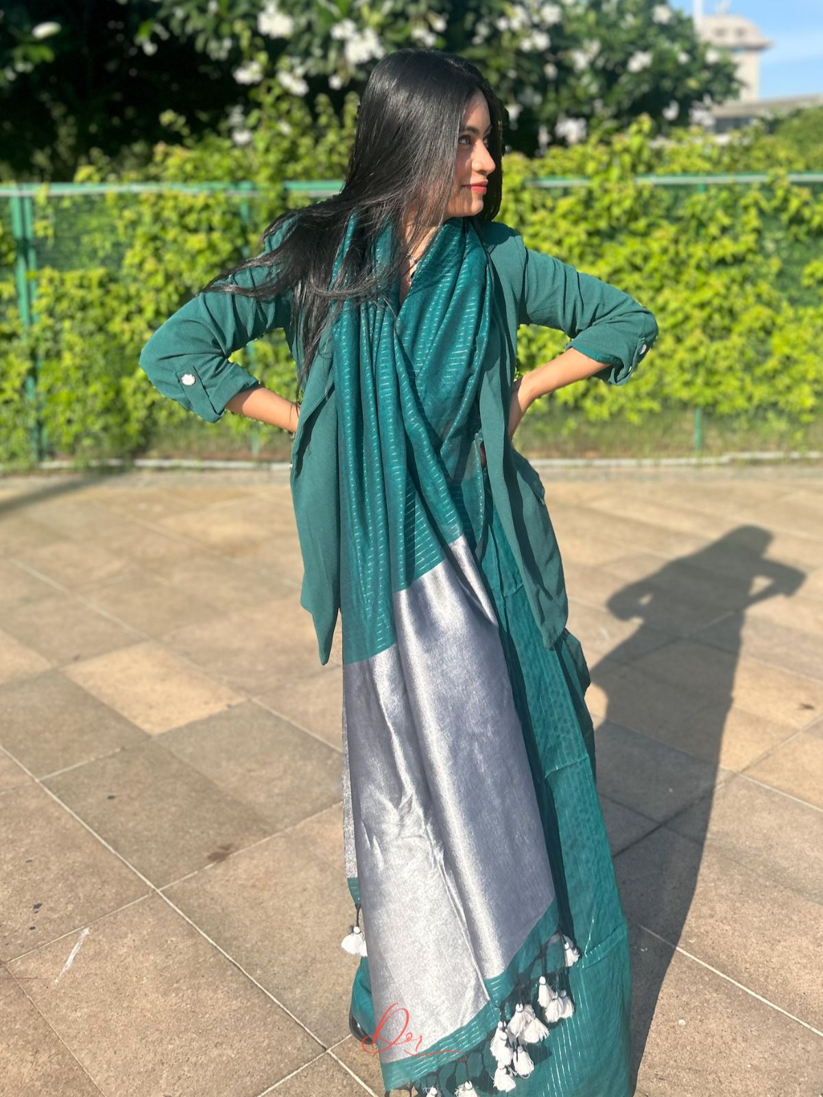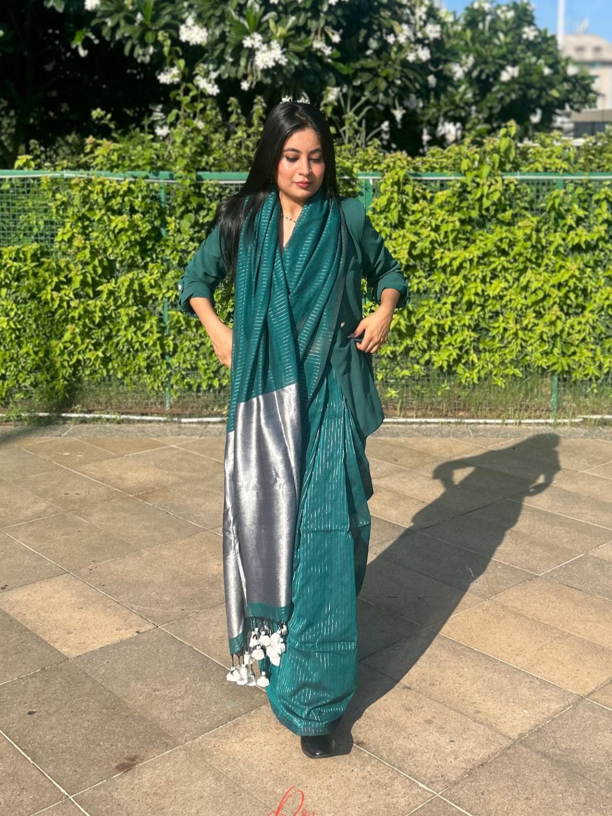 Soft Rama green Mulmul cotton saree adorned with vertical silver zari lines and pallu detailing. Lightweight and comfortable, this saree brings festive sophistication and effortless elegance, ideal for summer gatherings and celebrations.