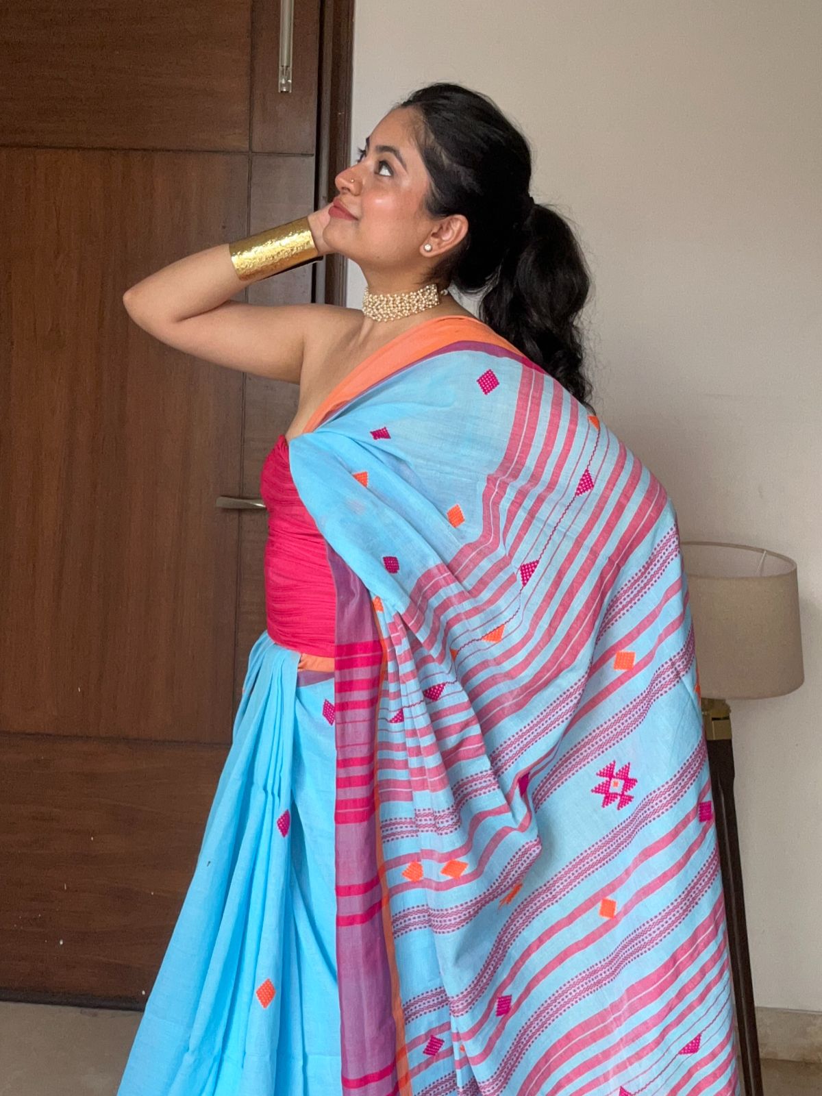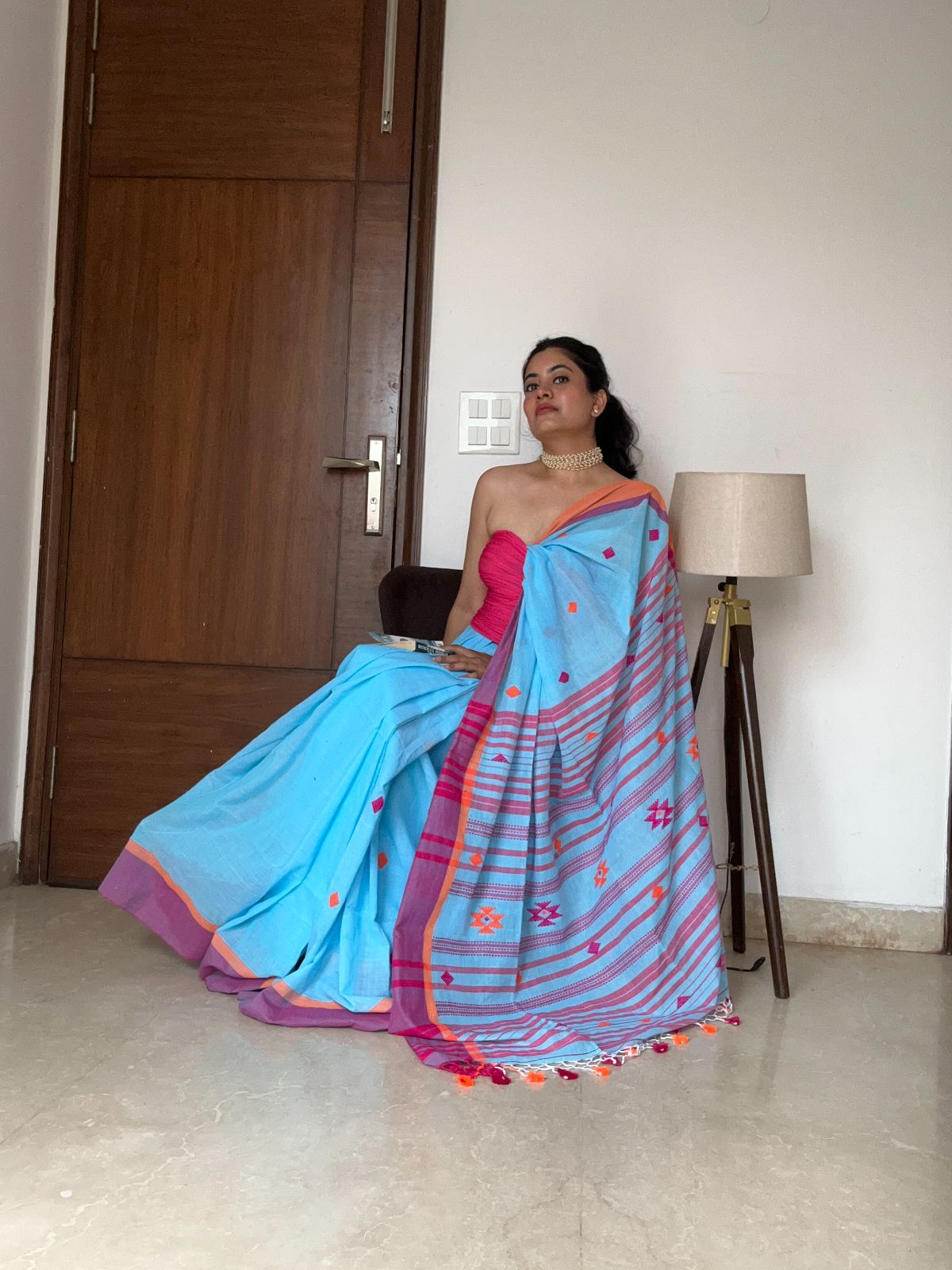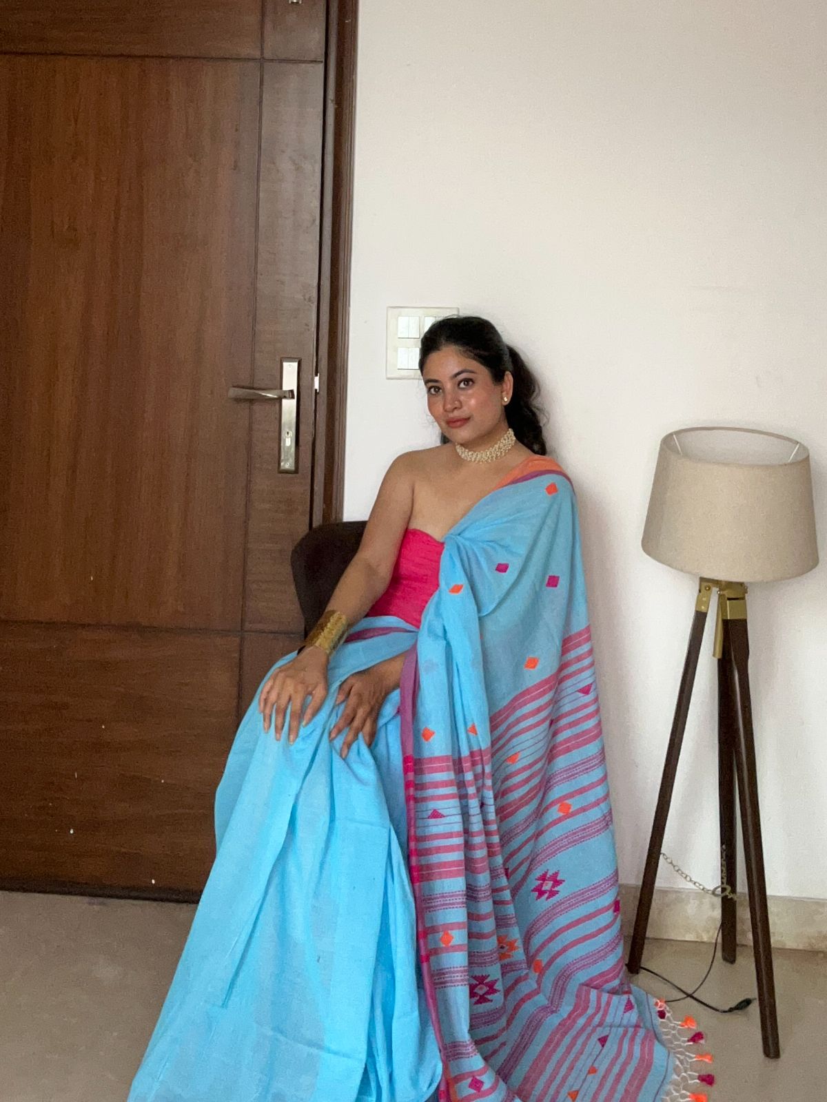 This soft hand-spun light sky blue khadi saree showcases multicoloured geometrical embroidery across its body. Enhanced with playful pom-pom tassels on the pallu, it balances elegance with charm. Comes with a running blouse piece, offering a lightweight and stylish choice for day or evening wear.
