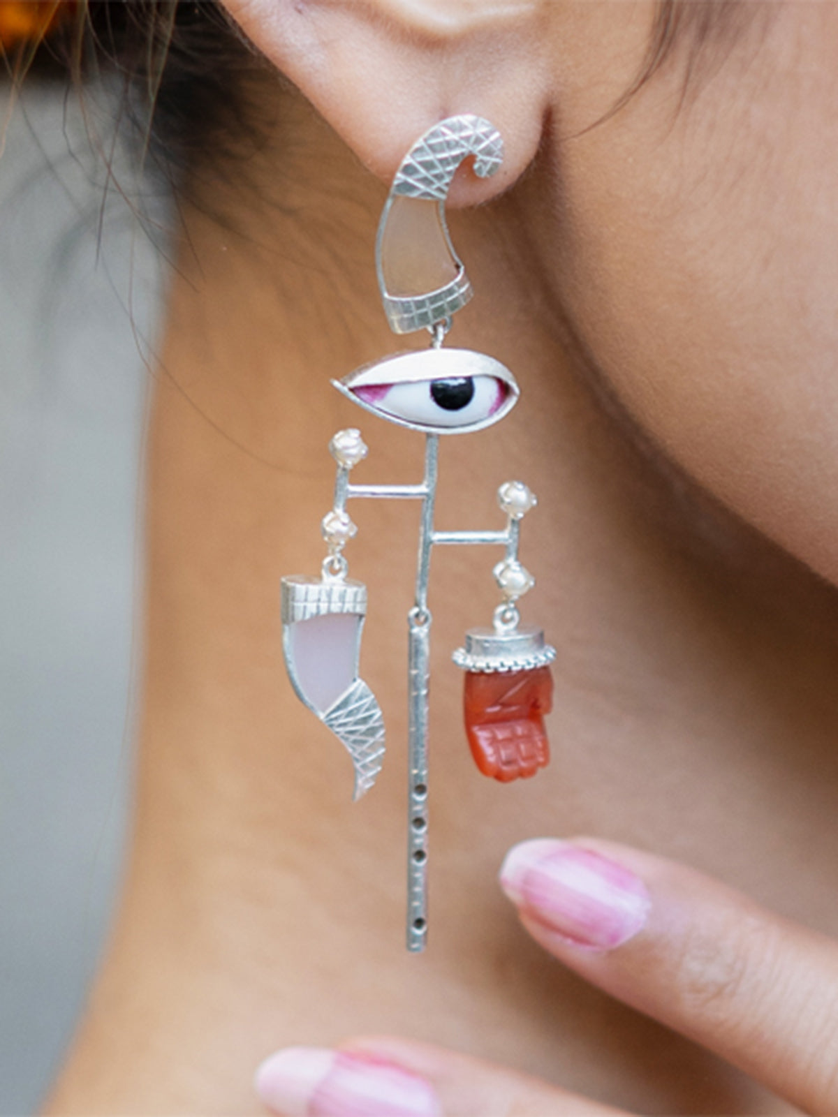 This lovely pair of statement earrings is inspired by the Gopashtami ki Pichwai, whose elements it deconstructs and takes forward as jewellery. Accordingly, it features two silhouettes of cow horns set in our custom silver setting. The entire piece is embellished with seed pearls and set in silver. Shreenathji's presence in this vignette is symbolized through a traditional enamelled Netra and a handcarved carnelian hand.