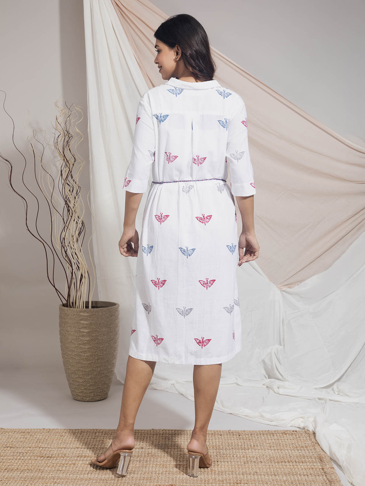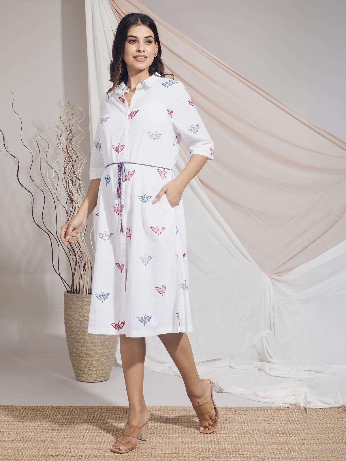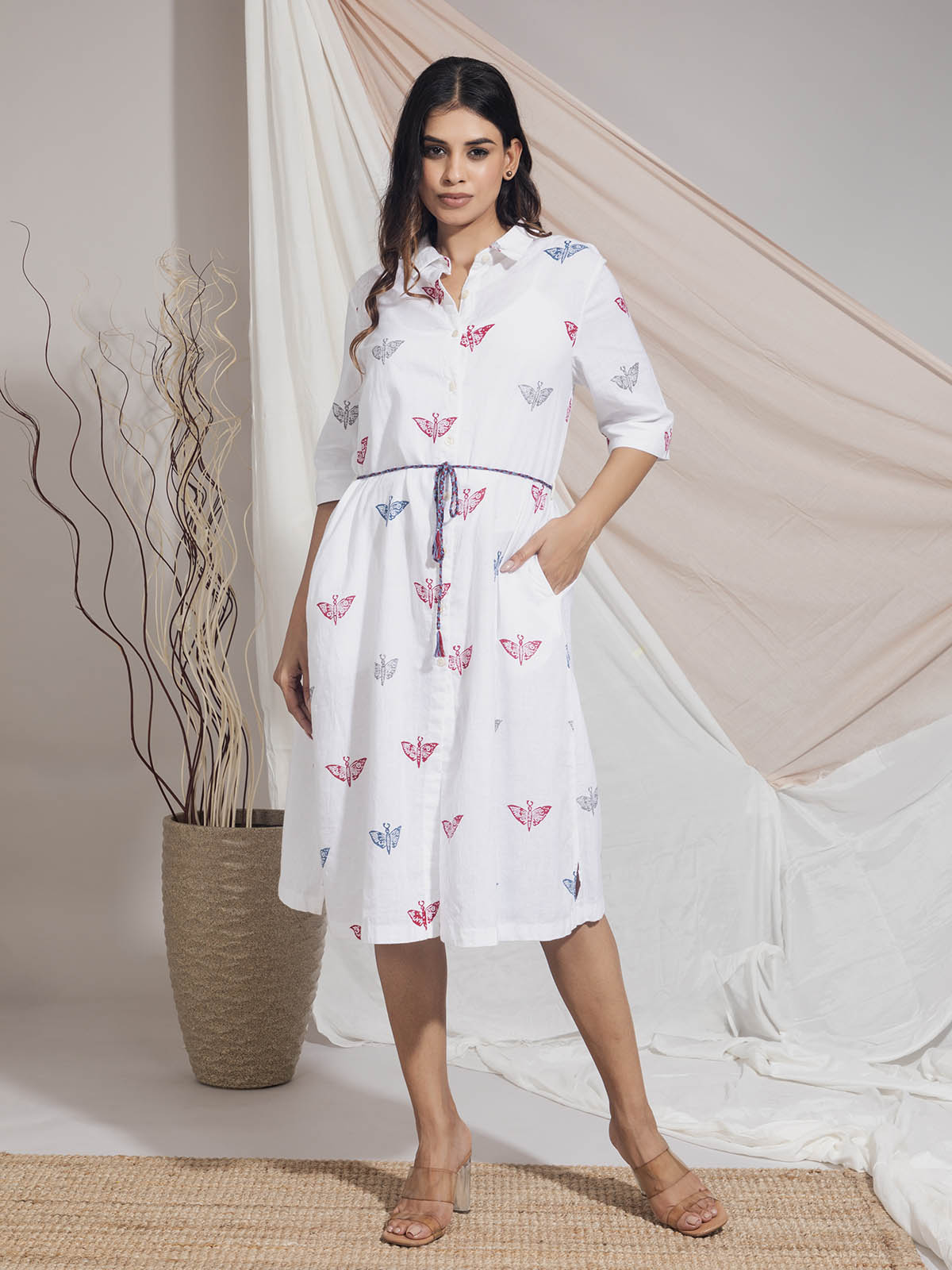 This handwoven cotton shirt dress combines traditional craftsmanship with contemporary style. Featuring a shirt collar and front button placket, it is adorned with a beautiful hand block print of a wood block butterfly in natural dye. The mother-of-pearl buttons enhance its elegance, while the relaxed fit ensures all-day comfort. Perfect for those who appreciate sustainable, artisanal fashion.