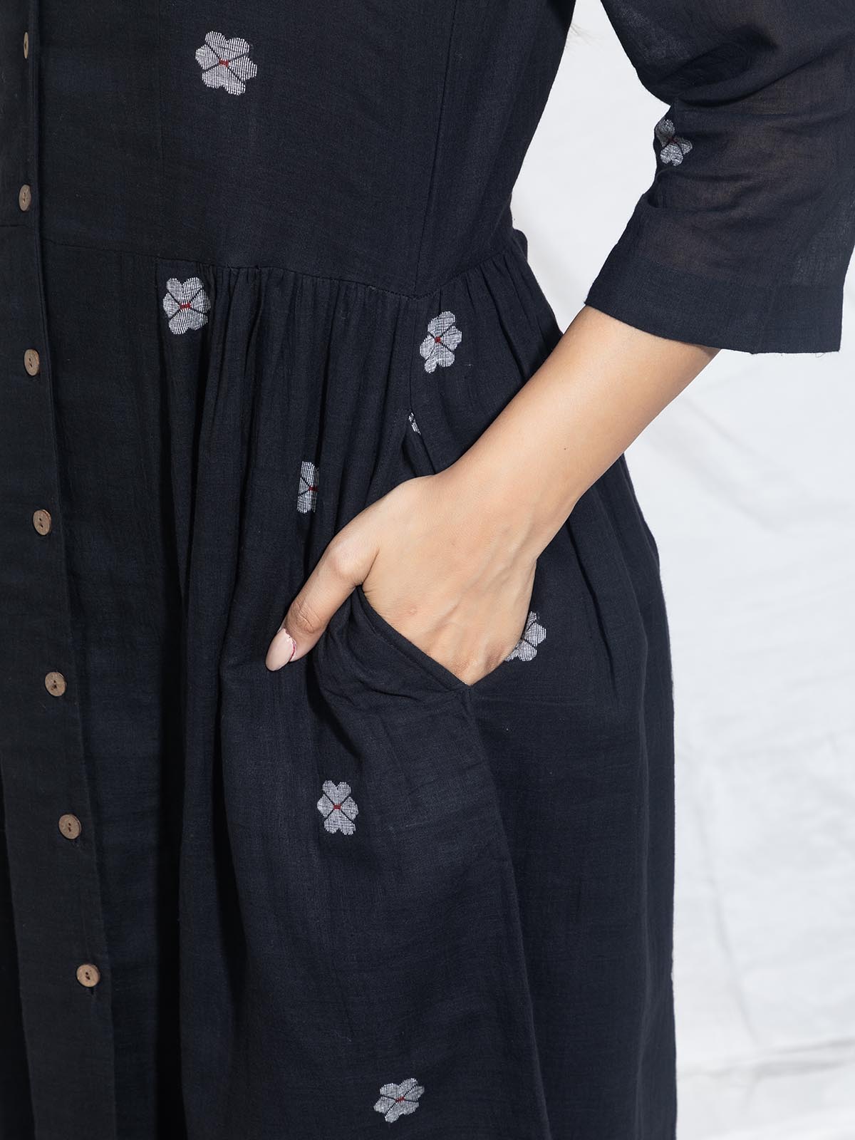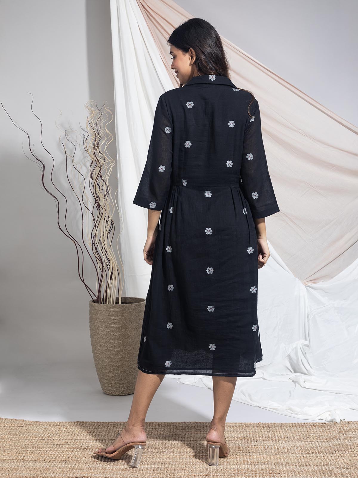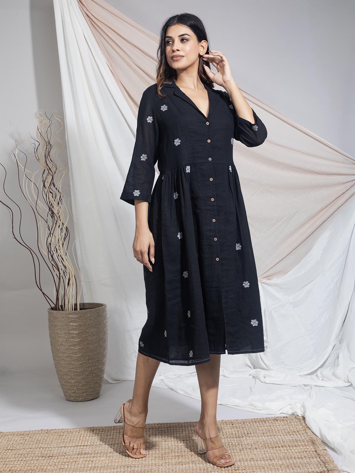 The Keya Hand Woven Cotton Jamdani Dress is a beautiful blend of traditional craftsmanship and contemporary design. Made from handwoven cotton jamdani, it features a notch collar, three-quarter sleeves, and wood buttons at the button placket. Fully lined for comfort, the dress offers a relaxed fit, making it a perfect choice for both style and ease of wear. A timeless piece that showcases the artistry of handwoven fabric.