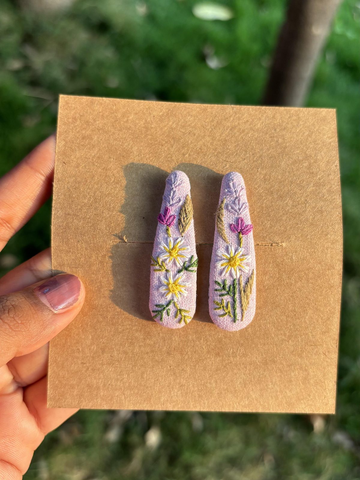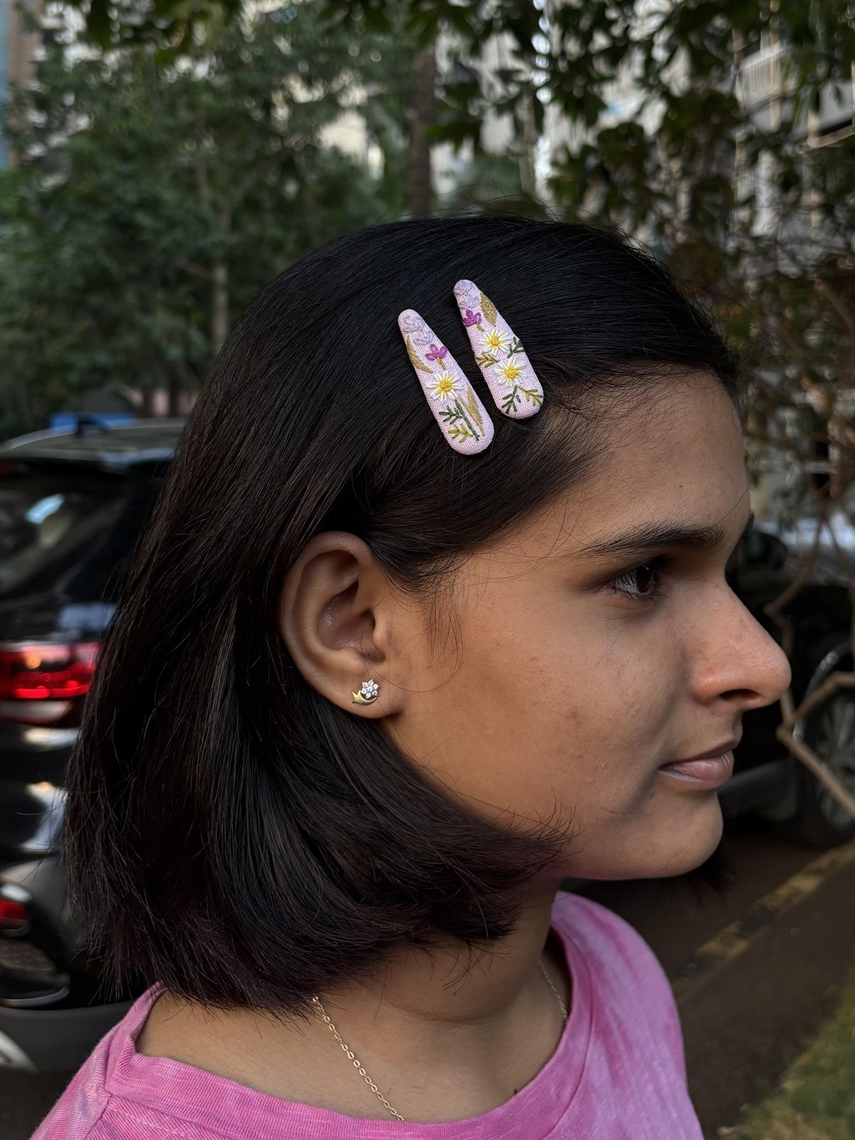 Intricately Botanic embroidered hair pins, delicately hand embroidered with love by our artisans. This hair pin set is a perfect accessory to add on to your wardrobe to enhance your overall look. Each piece is a testament to artisanal skill and sustainable craftsmanship, making them not just accessories, but statements of conscious style. Add a unique flair to your hairdo while embracing eco-friendly fashion with our exquisite collection. This hair pin is made from cotton linen material which is sustainable, gentle and soft on the hair. Secured with a tic tac pin at the back is a perfect accessory to create different hairdos. It is sold as 2 pins/set.