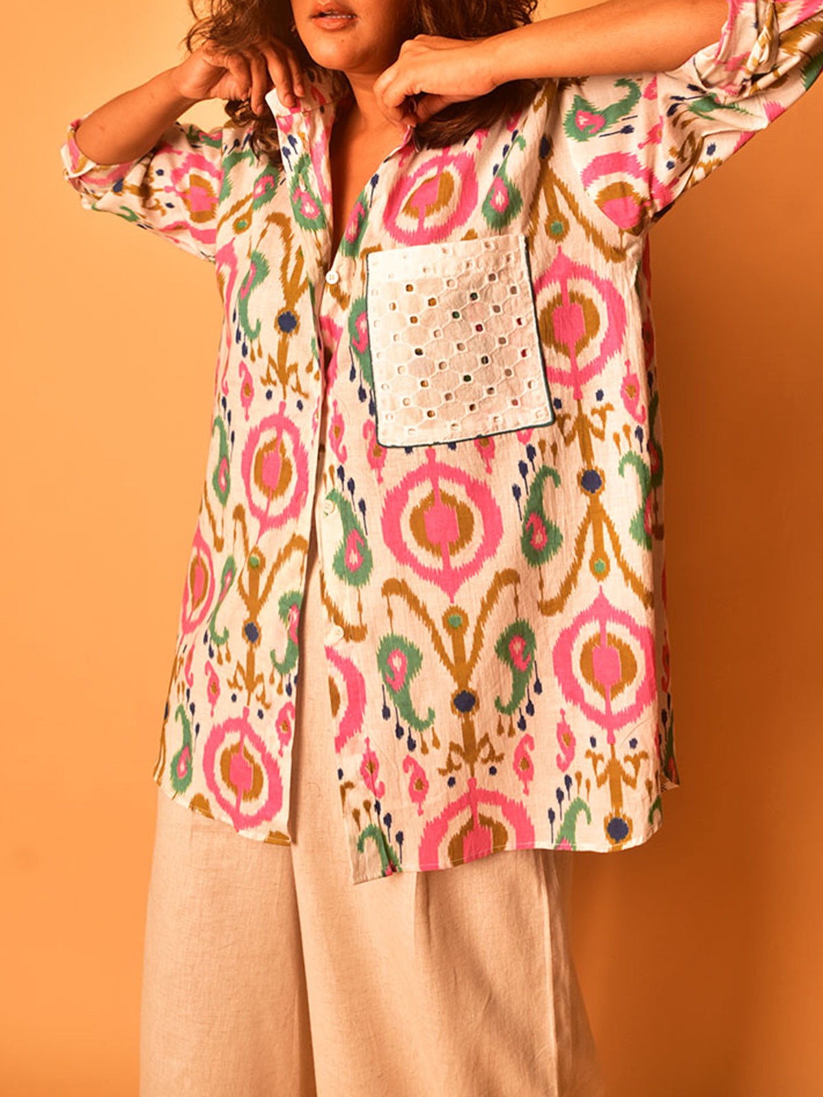 Enhance your wardrobe with the Simone Shirt in a captivating multicolored print. Crafted from hand-block printed cotton in Jaipur, this oversized shirt boasts a unique contrast cut-work embroidered cotton pocket. The button-down closure adds a classic touch, while the artisanal technique of hand-block printing by skilled karigars in Thane ensures each piece is one-of-a-kind. Whether paired with Simone Shorts for a complete lounge look or mixed with denims, cutoffs, trousers, or cotton shorts, each styling choice exudes a distinct vibe. Embrace the artistry and versatility of this truly special and handcrafted fashion statement.