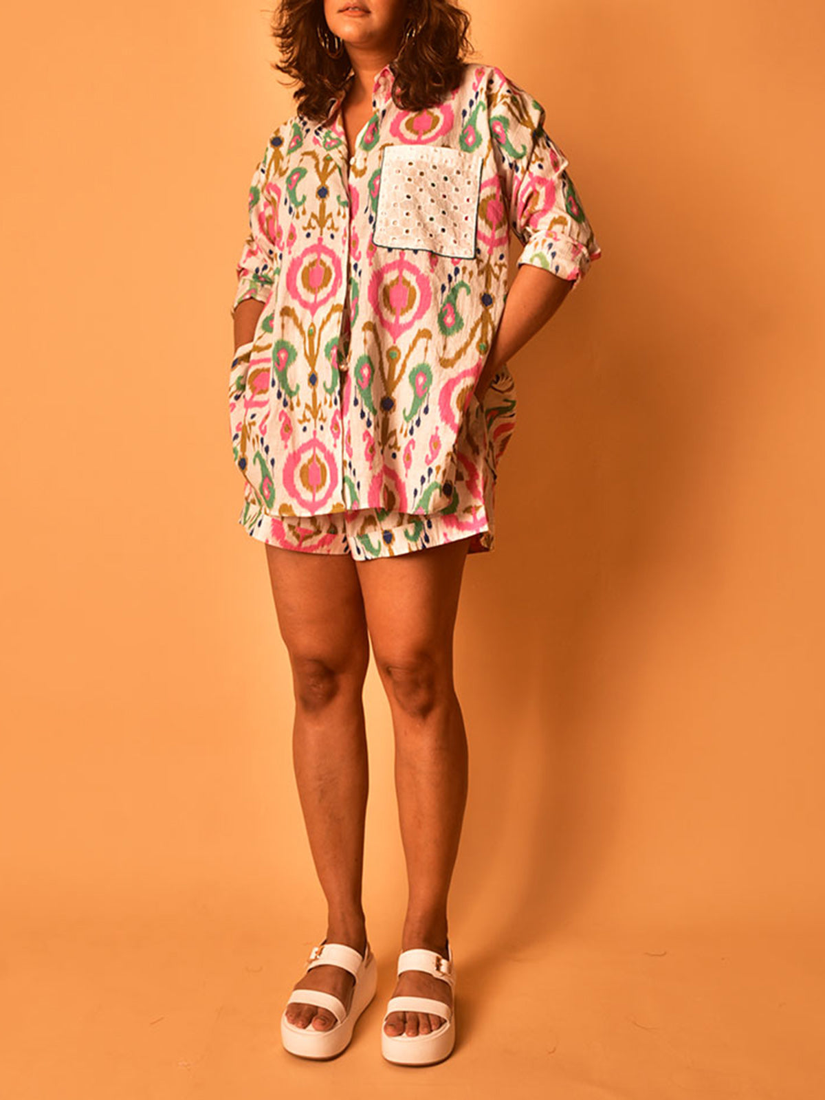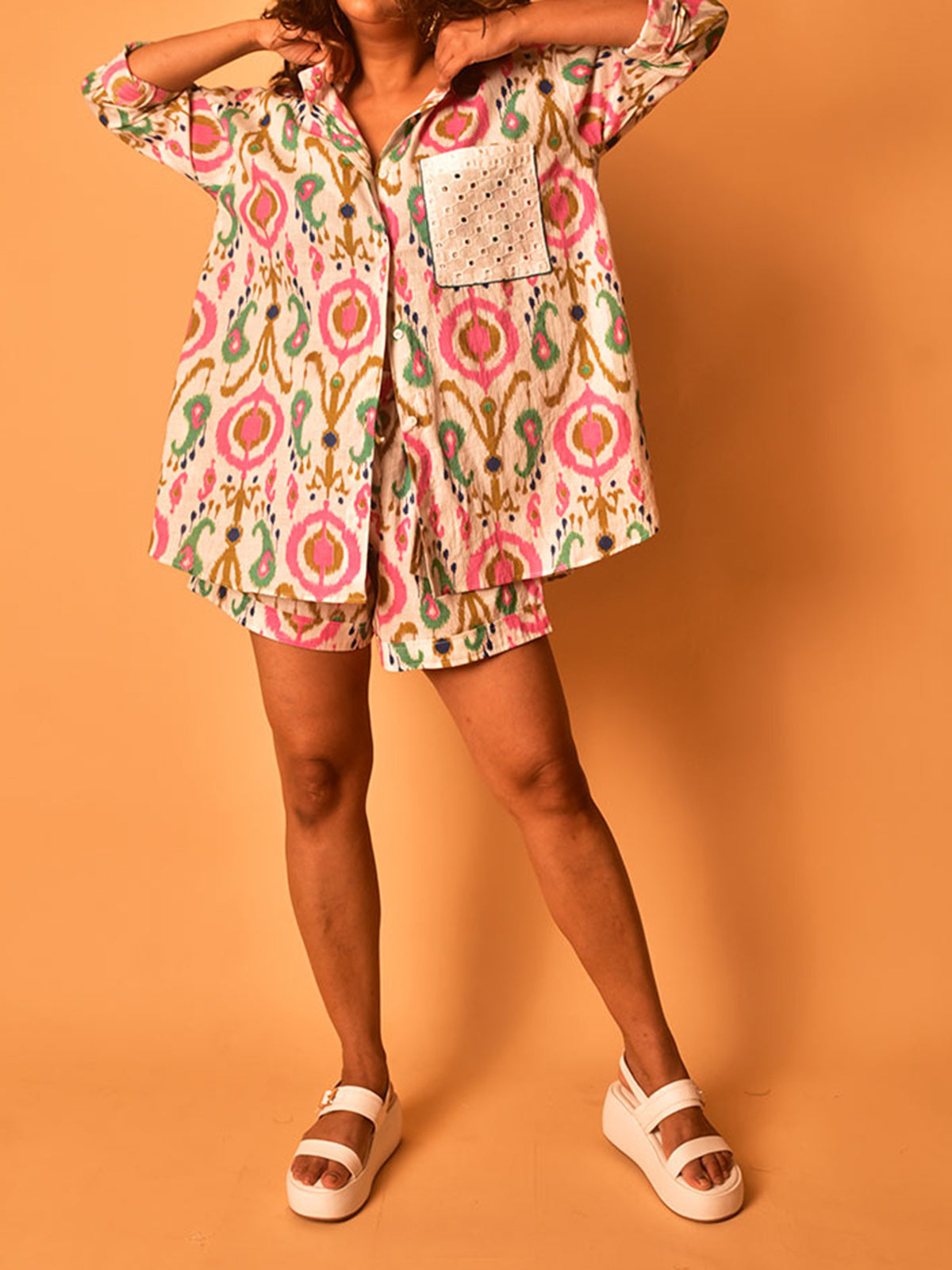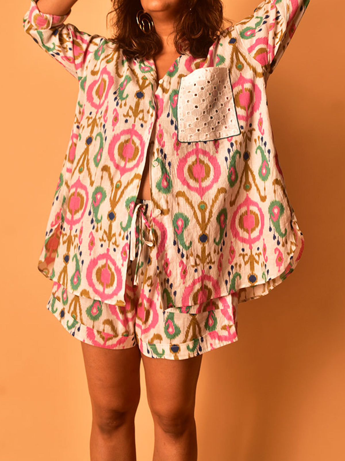 A refreshing departure from denim for your summer wardrobe. Crafted from eco-friendly hand-block printed cotton, each pair is a unique masterpiece, lovingly painted by skilled karigars in Jaipur. With an elasticated waist, drawstring tie-up, and pockets on both sides, these shorts offer laidback charm and easy styling. Perfect for a casual-chic vacay look, proudly Made in India with artisanal craftsmanship and eco-friendly materials.