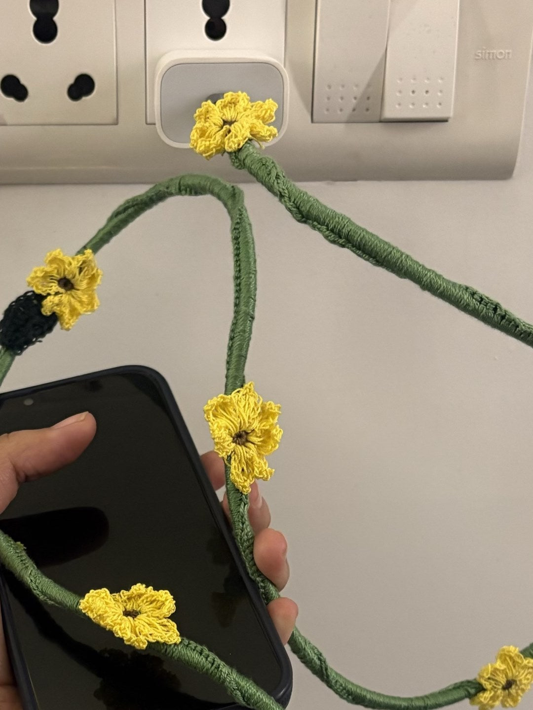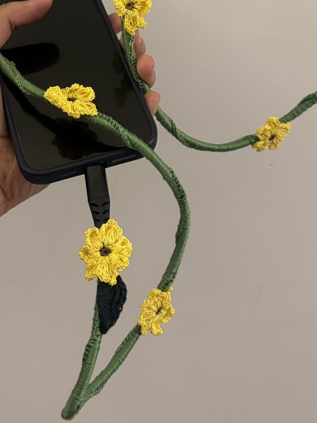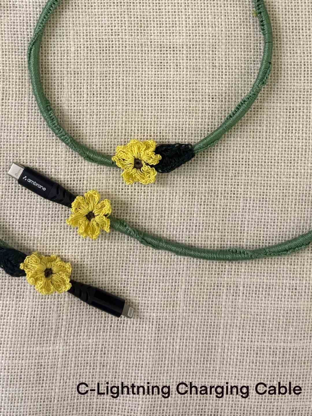 Our Floral Crochet Charging Cable is more than just a functional necessity—it's a statement piece that seamlessly combines fashion and technology. Elevate your charging experience with this exquisite accessory that's as beautiful as it is practical. Crafted from high-quality materials, our cable ensures durability and reliability, making it the perfect accessory for your charging needs. Whether you're powering up your smartphone, tablet, or other electronic devices, expect fast and efficient charging performance. The cable provided is of the brand 'Ambrane'. Length 1.5 metres