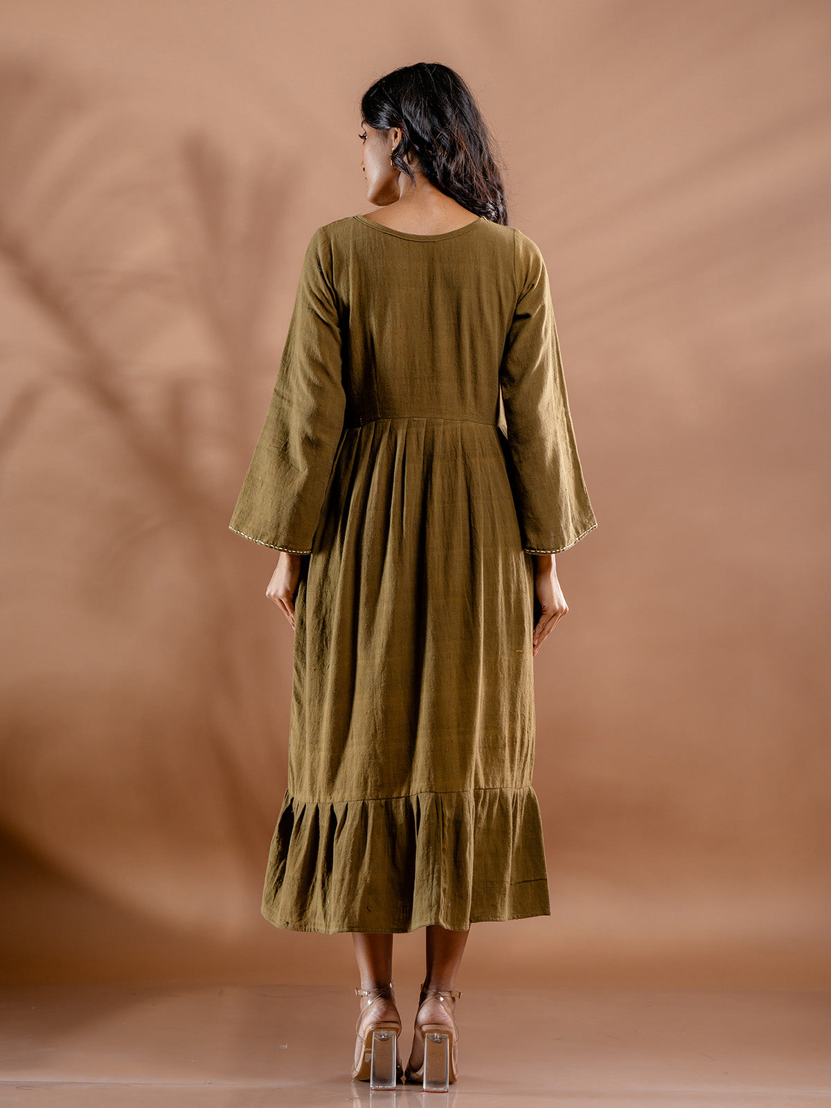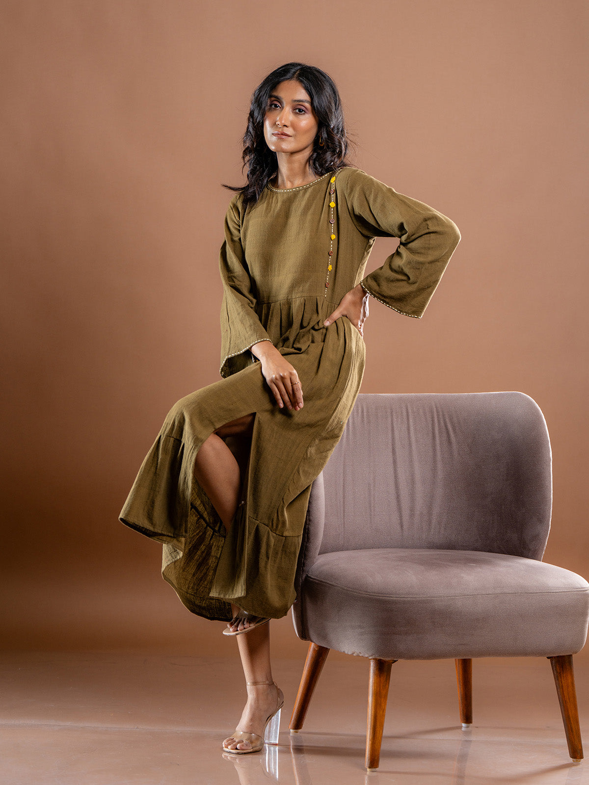 The Aranya dress is a graceful blend of heritage and ease, crafted in handwoven kala cotton and dyed in rich earthy olive green. Featuring a boat neckline, delicate bullion stitch and kantha hand embroidery, and 3/4th bell sleeves, it flows effortlessely with a long slit that adds movement and edge. Breathable, artisnal and consiously designed, Aranya is perfect for sunny days, serene evenings, and those who value sustainable elegance with soul.