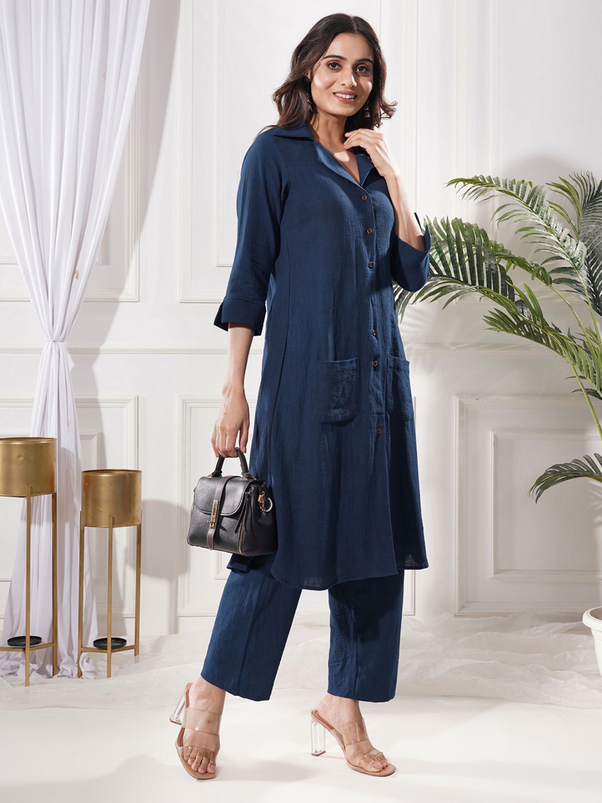 Crafted in 100% handspun and handwoven Kala cotton, The Blue horizon Co-ord set is your go to for effortless dressing with a mindful soul. Dyed using azo free dyes in serene deep indigo this sets bring together breathable comfort, tailored details and timeless elegance. The A-line kurta features lapel collars, roomy pockets, and a flowy silhouette that transition seamlessly from shirt dress to outer wear. Paired with high rise , wide leg pants with an elasticated waist and deep side pockets, it's designed for comfort without compromise.